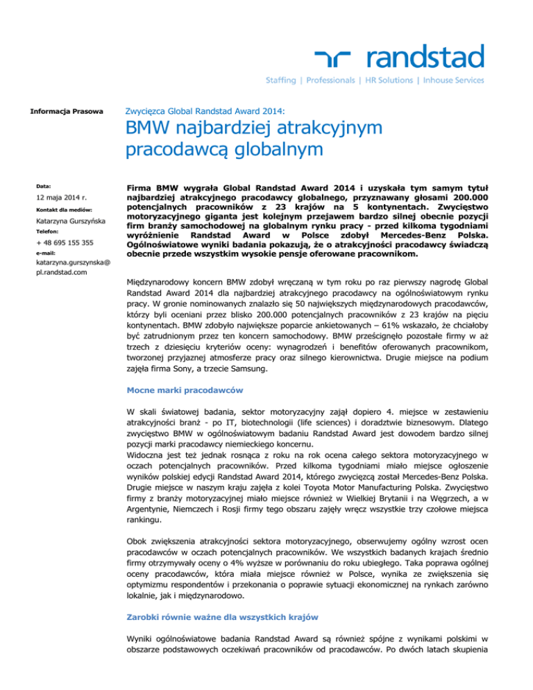 Informacja Prasowa Zwycięzca Global Randstad Award 2014: BMW najbardziej atrakcyjnym pracodawcą globalnym Data: 12 maja 2014 r. Kontakt dla mediów: Katarzyna Gurszyńska Telefon: + 48 695 155 355 e-mail: Firma BMW wygrała Global Randstad Award 2014 i uzyskała tym samym tytuł najbardziej atrakcyjnego pracodawcy globalnego, przyznawany głosami 200.000 potencjalnych pracowników z 23 krajów na 5 kontynentach. Zwycięstwo motoryzacyjnego giganta jest kolejnym przejawem bardzo silnej obecnie pozycji firm branży samochodowej na globalnym rynku pracy - przed kilkoma tygodniami wyróżnienie Randstad Award w Polsce zdobył Mercedes-Benz Polska. Ogólnoświatowe wyniki badania pokazują, że o atrakcyjności pracodawcy świadczą obecnie przede wszystkim wysokie pensje oferowane pracownikom. katarzyna.gurszynska@ pl.randstad.com Międzynarodowy koncern BMW zdobył wręczaną w tym roku po raz pierwszy nagrodę Global Randstad Award 2014 dla najbardziej atrakcyjnego pracodawcy na ogólnoświatowym rynku pracy. W gronie nominowanych znalazło się 50 największych międzynarodowych pracodawców, którzy byli oceniani przez blisko 200.000 potencjalnych pracowników z 23 krajów na pięciu kontynentach. BMW zdobyło największe poparcie ankietowanych – 61% wskazało, że chciałoby być zatrudnionym przez ten koncern samochodowy. BMW prześcignęło pozostałe firmy w aż trzech z dziesięciu kryteriów oceny: wynagrodzeń i benefitów oferowanych pracownikom, tworzonej przyjaznej atmosferze pracy oraz silnego kierownictwa. Drugie miejsce na podium zajęła firma Sony, a trzecie Samsung. Mocne marki pracodawców W skali światowej badania, sektor motoryzacyjny zajął dopiero 4. miejsce w zestawieniu atrakcyjności branż - po IT, biotechnologii (life sciences) i doradztwie biznesowym. Dlatego zwycięstwo BMW w ogólnoświatowym badaniu Randstad Award jest dowodem bardzo silnej pozycji marki pracodawcy niemieckiego koncernu. Widoczna jest też jednak rosnąca z roku na rok ocena całego sektora motoryzacyjnego w oczach potencjalnych pracowników. Przed kilkoma tygodniami miało miejsce ogłoszenie wyników polskiej edycji Randstad Award 2014, którego zwycięzcą został Mercedes-Benz Polska. Drugie miejsce w naszym kraju zajęła z kolei Toyota Motor Manufacturing Polska. Zwycięstwo firmy z branży motoryzacyjnej miało miejsce również w Wielkiej Brytanii i na Węgrzech, a w Argentynie, Niemczech i Rosji firmy tego obszaru zajęły wręcz wszystkie trzy czołowe miejsca rankingu. Obok zwiększenia atrakcyjności sektora motoryzacyjnego, obserwujemy ogólny wzrost ocen pracodawców w oczach potencjalnych pracowników. We wszystkich badanych krajach średnio firmy otrzymywały oceny o 4% wyższe w porównaniu do roku ubiegłego. Taka poprawa ogólnej oceny pracodawców, która miała miejsce również w Polsce, wynika ze zwiększenia się optymizmu respondentów i przekonania o poprawie sytuacji ekonomicznej na rynkach zarówno lokalnie, jak i międzynarodowo. Zarobki równie ważne dla wszystkich krajów Wyniki ogólnoświatowe badania Randstad Award są również spójne z wynikami polskimi w obszarze podstawowych oczekiwań pracowników od pracodawców. Po dwóch latach skupienia przede wszystkim na poszukiwaniu bezpieczeństwa i stabilności zatrudnienia, obecnie aż 27% badanych przyznało, że jeśli o atrakcyjności pracodawcy ma decydować tylko jeden czynnik, to jest to wysokość wynagrodzenia. Jak się okazuje, jest to tendencja charakterystyczna dla niemal wszystkich badanych krajów - wynagrodzenie (wzrost z 17% do 23%) staje się dla zatrudnionych ważniejsze niż bezpieczeństwo pracy (spadek z 19% w 2013 roku do 14% w 2014 roku). W oczekiwaniach pracowników wobec pracodawców wyraźne jest jednak też nastawienie na takie aspekty jak przyjazna atmosfera pracy, równowaga między pracą a życiem osobistym, czy interesująca treść pracy. Dowodzą one złożoności postrzegania atrakcyjności pracodawcy oraz faktu, że oferowane w firmie wynagrodzenia nie są wystarczającym gwarantem pozyskania najlepszych pracowników. „Na dzisiejszym, coraz bardziej pozbawionym harmonii rynku pracy, silna marka pracodawcy jest kluczowa dla przyciągania i utrzymywania odpowiednich, utalentowanych pracowników – mówi Jacques van den Broek, Dyrektor Generalny Randstad Holding, jednej z największych na świecie agencji doradztwa personalnego - „Powody, dla których ludzie wybierają pracodawcę różnią się znacząco. Nie ma jednego zestawu cech, które mogłyby przyciągnąć każdego, co sprawia, że obszar wizerunku pracodawcy jest niezwykle wielowymiarowy, pełen niuansów. Wizerunek pracodawcy powinien zatem być wyrażeniem bogatej i zróżnicowanej oferty firmy, która czyni ją unikalnym, wyjątkowym pracodawcą.” Informacje o badaniu: Randstad Award to największy na świecie projekt badawczy dotyczący wizerunku i czynników atrakcyjności pracodawców. Pierwsze badanie przeprowadzono w 2000 roku w Belgii. W 2014 roku odbyło się w 23 krajach na 5 kontynentach i wzięło w nim udział blisko 200 000 respondentów. W Polsce w tym roku badanie odbyło się już czwarty raz i objęło 150 największych pracodawców oraz 8000 respondentów, reprezentatywnych dla polskiego społeczeństwa (pod względem wieku, płci, wykształcenia, regionu), zdolnych do pracy, w wieku od 18 do 65 lat, zarówno uczących się, pracujących, jak i poszukujących pracy. Nagroda Global Randstad Award została w tym roku przyznana po raz pierwszy. Zwycięzcą została firma, która uzyskała najwyższe oceny w gronie nominowanych największych pracodawców międzynarodowych. Ocenie poddano 50 firm wybranych na podstawie następujących kryteriów: •największa liczba zatrudnionych pracowników, •przedsiębiorstwo komercyjne (nie uwzględnia się organizacji publicznych), •działalność na terenie co najmniej 25 krajów, •jednakowa nazwa firmy we wszystkich krajach, •co najmniej 3