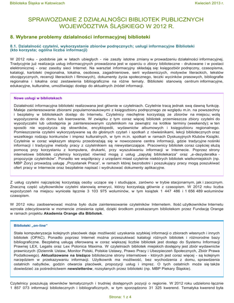 Kwiecień 2013 r. Biblioteka Śląska w Katowicach SPRAWOZDANIE Z DZIAŁALNOŚCI BIBLIOTEK PUBLICZNYCH WOJEWÓDZTWA ŚLĄSKIEGO W 2012 R. 8. Wybrane problemy działalności informacyjnej biblioteki 8.1. Działalność czytelni, wykorzystanie zbiorów podręcznych; usługi informacyjne Biblioteki (kto korzysta; ogólna liczba informacji) W 2012 roku - podobnie jak w latach ubiegłych - nie zaszły istotne zmiany w prowadzeniu działalności informacyjnej. Tradycyjnie już realizacja usług informacyjnych prowadzona jest w oparciu o zbiory biblioteczne - drukowane i w postaci elektronicznej - oraz zasoby sieci Internet. Na warsztat informacyjny składają się: księgozbiór podręczny, czasopisma, katalogi, kartoteki (regionalna, lokalna, osobowa, zagadnieniowe, serii wydawniczych, motywów literackich, tekstów obcojęzycznych, recenzji literackich i filmowych), dokumenty życia społecznego, teczki wycinków prasowych, bibliografie regionalna i lokalna oraz zestawienia bibliograficzne na różne tematy. Biblioteki stanowią centrum informacyjne, edukacyjne, kulturalne, umożliwiając dostęp do aktualnych źródeł informacji. Nowe usługi w bibliotekach Działalność informacyjna biblioteki realizowana jest głównie w czytelniach. Czytelnie tracą jednak swą dawną funkcję. Maleje zainteresowanie zbiorami popularnonaukowymi z księgozbioru podręcznego ze względu m.in. na powszechny i bezpłatny w bibliotekach dostęp do Internetu. Czytelnicy niechętnie korzystają ze zbiorów na miejscu; wolą wypożyczenia do domu lub kserowanie. W związku z tym coraz więcej bibliotek przemieszcza zbiory czytelni do wypożyczalni lub udostępnia je zainteresowanym czytelnikom na zewnątrz na krótkie terminy (weekendy); w ten sposób nie wypożycza się słowników, encyklopedii, wydawnictw albumowych i księgozbioru regionalnego. Pomieszczenia czytelni wykorzystywane są do głośnych czytań i spotkań z rówieśnikami, lekcji bibliotecznych oraz wszelkiego rodzaju konkursów i imprez kulturalnych, w tym m.in. spotkań w ramach Dyskusyjnych Klubów Książki. Czytelnie w coraz większym stopniu przeobrażają się w nowoczesne centra informacji, gdzie tradycyjne nośniki informacji i tradycyjne metody pracy z czytelnikiem są niewystarczające. Pracownicy bibliotek coraz częściej służą pomocą przy korzystaniu z komputera, drukarki, przy wyszukiwaniu informacji w Internecie. Poprzez strony internetowe bibliotek czytelnicy korzystać również mogą z usług „zapytaj bibliotekarza” oraz „e-dezyderatka propozycje czytelników”. Ponadto we współpracy z urzędami miast czytelnie niektórych bibliotek wielkomiejskich (np. MBP Żory) prowadzą usługę „Przystanek Praca”, w ramach której bezrobotni i poszukujący pracy mogą poszukiwać ofert pracy w Internecie oraz bezpłatnie napisać i wydrukować dokumenty aplikacyjne. Z usług czytelni najczęściej korzystają osoby uczące się i studiujące, zarówno w trybie stacjonarnym, jak i zaocznym. Znaczną część użytkowników czytelni stanowią emeryci, którzy korzystają głównie z czasopism. W 2012 roku liczba wypożyczeń na miejscu wyniosła łącznie 3 103 975 woluminów, w tym książek 1 447 486 i 1 656 489 woluminów czasopism. W 2012 roku zaobserwować można było duże zainteresowanie czytelników Internetem. Ilość użytkowników Internetu wzrosła zdecydowanie w momencie zniesienia opłat, dzięki środkom przekazanym bibliotekom przez Fundację Orange w ramach projektu Akademia Orange dla Bibliotek. Biblioteki „on-line” Stała komputeryzacja kolejnych placówek daje możliwość uzyskania szybkiej informacji o zbiorach własnych i innych bibliotek (OPAC). Ponadto poprzez Internet można przeszukiwać katalogi różnych bibliotek i różnorodne bazy bibliograficzne. Bezpłatną usługą oferowaną w coraz większej liczbie bibliotek jest dostęp do Systemu Informacji Prawnej LEX, Legalis oraz Lex Polonica Maxima. W czytelniach bibliotek miejskich dostępny jest zbiór wydawnictw prawniczych (Dziennik Ustaw, Monitor Polski, Polskie Ustawy, Prawo Pracy i Ubezpieczeń Społecznych, Zbiór Prawa Podatkowego). Aktualizowane na bieżąco biblioteczne strony internetowe - których jest coraz więcej - są kolejnym narzędziem w przekazywaniu informacji. Użytkownik ma możliwość, bez wychodzenia z domu, sprawdzenia ostatnich nabytków, godzin otwarcia placówek, propozycji usług i imprez. O tych ostatnich może się także dowiedzieć za pośrednictwem newsletterów, rozsyłanych przez biblioteki (np. MBP Piekary Śląskie). Czytelnicy poszukują słowników tematycznych i trudniej dostępnych pozycji o regionie. W 2012 roku udzielono łącznie 1 857 073 informacji bibliotecznych i bibliograficznych, w tym sporządzono 31 325 kwerend. Tematyka kwerend była Strona: 1 z 4 Kwiecień 2013 r. Biblioteka Śląska w Katowicach różnorodna. Były to m.in.: Polaków portret własny, kreacja wizerunku młodzieży, znaczenie marketingu politycznego w Polsce, wpływ szkoleń na efektywność pracy, motyw rodziny i domu w literaturze i sztuce. Wiele bibliotek (np. MiPBP Będzin, MBP Jastrzębie-Zdrój, MBP Piekary Śląskie, MiPBP Zawiercie, MBP Żory) prowadziły szeroką działalność edukacyjną w zakresie informatyzacji, organizując warsztaty komputerowe i informatyczne dla dzieci oraz seniorów „Komputer 50+”. Pozwoliły one na zdobycie praktycznych umiejętności związanych z korzystaniem z nowych technologii. Najczęściej poszukuje się informacji z takich dziedzin wiedzy jak: literatura, bankowość, ekonomia, zarządzanie, historia, prawo, sztuka, psychologia, socjologia, pedagogika, technika, turystyka, wiedza o regionie. W działalności informacyjnej bibliotek coraz częściej wykorzystywane są: GG, skype, Facebook, Nasza klasa, Twitter, blogi. Niezmiennym zainteresowaniem wśród użytkowników cieszyła się informacja turystyczna. Poszukiwano informacji o agroturystyce, hotelarstwie, organizacji