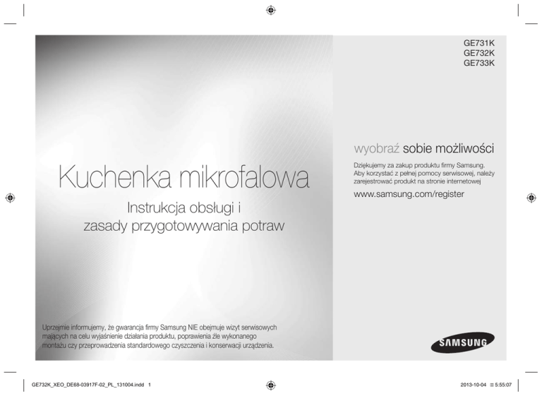 GE731K GE732K GE733K wyobraź sobie możliwości Kuchenka mikrofalowa Instrukcja obsługi i zasady przygotowywania potraw Dziękujemy za zakup produktu firmy Samsung. Aby korzystać z pełnej pomocy serwisowej, należy zarejestrować produkt na stronie internetowej www.samsung.com/register Uprzejmie informujemy, że gwarancja firmy Samsung NIE obejmuje wizyt serwisowych mających na celu wyjaśnienie działania produktu, poprawienia źle wykonanego montażu czy przeprowadzenia standardowego czyszczenia i konserwacji urządzenia. GE732K_XEO_DE68-03917F-02_PL_131004.indd 1 2013-10-04 �� 5:55:07 Ważne instrukcje dotyczące bezpieczeństwa NALEŻY JE UWAŻNIE PRZECZYTAĆ I ZACHOWAĆ NA PRZYSZŁOŚĆ. Należy upewnić się, czy przedstawione instrukcje są przestrzegane przez cały czas korzystania z kuchenki. Przed użyciem kuchenki należy zapoznać się z poniższymi instrukcjami. POLSKI Jak korzystać z instrukcji obsługi Gratulujemy zakupu kuchenki mikrofalowej firmy SAMSUNG. Instrukcja obsługi zawiera wiele cennych informacji na temat gotowania przy użyciu kuchenki mikrofalowej dotyczących: • zasad bezpieczeństwa • właściwych akcesoriów i przyborów kuchennych • pomocnych wskazówek dotyczących przygotowywania potraw • Wskazówki dotyczące przygotowywania potraw Legenda dla symboli i ikon OSTRZEŻENIE Zagrożenia lub niebezpieczne czynności, które mogą prowadzić do poważnego kalectwa lub śmierci. PRZESTROGA Zagrożenia lub niebezpieczne czynności, które mogą prowadzić do drobnych obrażeń lub uszkodzenia mienia. Ostrzeżenie; zagrożenie pożarem Ostrzeżenie; gorąca powierzchnia Ostrzeżenie; prąd Ostrzeżenie; materiał wybuchowy NIE próbować. NIE dotykać. NIE rozmontowywać. Postępować zgodnie z instrukcjami. Odłącz wtyczkę zasilania z gniazda sieci. Upewnić się, czy urządzenie jest uziemione, aby zapobiec porażeniu prądem. Skontaktować się z centrum serwisowym. Uwaga OSTRZEŻENIE (Tylko funkcja kuchenki mikrofalowej) OSTRZEŻENIE: Nie należy używać kuchenki, jeśli drzwiczki lub ich uszczelnienie są uszkodzone — usterki muszą najpierw zostać naprawione przez wykwalifikowaną osobę. OSTRZEŻENIE: Wykonywanie czynności serwisowych i naprawa urządzenia wymagająca zdjęcia pokrywy chroniącej przed promieniowaniem mikrofalowym przez osoby niewykwalifikowane może być bardzo niebezpieczna. OSTRZEŻENIE: Płyny i pozostała żywność nie mogą być podgrzewane w szczelnie zamkniętych pojemnikach, gdyż grozi to wybuchem. Urządzenie jest przeznaczone wyłącznie do użytku domowego. Ważne 2 GE732K_XEO_DE68-03917F-02_PL_131004.indd 2 2013-10-04 �� 5:55:09 Ć W przypadku zauważenia dymu kuchenkę należy wyłączyć oraz odłączyć od źródła zasilania; pozostawić drzwiczki kuchenki zamknięte w celu zduszenia płomienia. OSTRZEŻENIE: Podczas podgrzewania napojów w kuchence mikrofalowej może w niektórych przypadkach dojść do opóźnionego gwałtownego wrzenia, dlatego należy ostrożnie obchodzić się z naczyniem. OSTRZEŻENIE: Przed podaniem zawartość butelek i słoiczków z jedzeniem dla dzieci należy wymieszać lub wstrząsnąć oraz sprawdzić temperaturę, aby uniknąć poparzenia. Jajek w skorupkach i całych jajek na twardo nie należy podgrzewać w kuchenkach mikrofalowych, ponieważ mogą one eksplodować nawet po zakończeniu podgrzewania. Kuchenkę należy regularnie czyścić i usuwać z niej wszelkie pozostałości jedzenia. Nadmierne zabrudzenie kuchenki może spowodować uszkodzenia jej powierzchni i wpłynąć negatywnie na okres eksploatacji urządzenia lub doprowadzić do powstania niebezpiecznych sytuacji. Urządzenie nie jest przeznaczone do instalacji w pojazdach drogowych, przyczepach itp. POLSKI OSTRZEŻENIE: Dzieci mogą korzystać z kuchenki mikrofalowej tylko po przekazaniu im odpowiednich informacji umożliwiających bezpieczne korzystanie z kuchenki oraz wyjaśnieniu ryzyka związanego z niewłaściwym jej użyciem. OSTRZEŻENIE: Z urządzenia mogą korzystać dzieci powyżej 8. roku życia i osoby o ograniczonej sprawności fizycznej, sensorycznej lub umysłowej, bądź o niedostatecznym doświadczeniu i wiedzy jedynie pod nadzorem lub po przeszkoleniu w zakresie bezpiecznej obsługi i zagrożeń. Dzieciom nie wolno bawić się urządzeniem. Dzieci mogą przeprowadzać czyszczenie i konserwację urządzenia wyłącznie pod nadzorem osoby dorosłej i pod warunkiem ukończenia 8 lat. Należy używać wyłącznie naczyń odpowiednich do stosowania w kuchenkach mikrofalowych. Podgrzewanie żywności w plastikowych lub papierowych pojemnikach powinno odbywać się pod ścisłym nadzorem użytkownika ze względu na ryzyko zapłonu. Kuchenka mikrofalowa służy do podgrzewania jedzenia i napojów. Suszenie jedzenia i ubrań oraz podgrzewanie mokrych gąbek, obuwia, wilgotnych ściereczek i podobnych rzeczy grozi obrażeniami, zapłonem i pożarem. 3 GE732K_XEO_DE68-03917F-02_PL_131004.indd 3 2013-10-04 �� 5:55:09 POLSKI Osoby o ograniczonej sprawności fizycznej, sensorycznej lub umysłowej, bądź o niedostatecznym doświadczeniu i wiedzy (np. dzieci) nie powinny korzystać z urządzenia bez nadzoru lub przeszkolenia w zakresie obsługi przez inną osobę odpowiedzialną za ich bezpieczeństwo. Nie wolno dopuścić, by dzieci bawiły się urządzeniem. Ze względów bezpieczeństwa uszkodzony przewód zasilający musi zostać wymieniony przez producenta, w autoryzowanym serwisie lub przez wykwalifikowaną osobę. OSTRZEŻENIE: Płyny i inna żywność nie mogą być podgrzewane w szczelnie zamkniętych pojemnikach, gdyż grozi to wybuchem; Nie należy czyścić urządzenia strumieniem wody. Kuchenka powinna być umieszczona w takim kierunku i na takiej wysokości, aby zapewnić łatwy dostęp do jej wnętrzna i do panelu sterowania. Przed pierwszym użyciem kuchenki należy wstawić do niej wodę i uruchomić kuchenkę na 10 minut. Jeżeli kuchenka wydaje dziwny dźwięk, swąd s