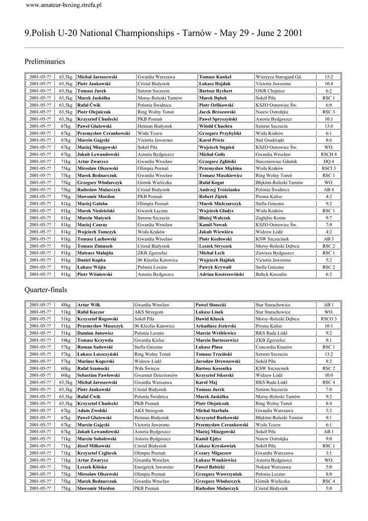 www.amateur-boxing.strefa.pl 9.Polish U-20 National Championships - Tarnów - May 29 - June 2 2001 Preliminaries 2001-05-?? 2001-05-?? 2001-05-?? 2001-05-?? 2001-05-?? 2001-05-?? 2001-05-?? 2001-05-?? 2001-05-?? 2001-05-?? 2001-05-?? 2001-05-?? 2001-05-?? 2001-05-?? 2001-05-?? 2001-05-?? 2001-05-?? 2001-05-?? 2001-05-?? 2001-05-?? 2001-05-?? 2001-05-?? 2001-05-?? 2001-05-?? 2001-05-?? 2001-05-?? 2001-05-?? 63,5kg 63,5kg 63,5kg 63,5kg 63,5kg 63,5kg 63,5kg 67kg 67kg 67kg 67kg 67kg 71kg 75kg 75kg 75kg 75kg 75kg 81kg 81kg 81kg 81kg 81kg 81kg 91kg 91kg 91kg 2001-05-?? 2001-05-?? 91kg 91kg Michał Jaroszewski Piotr Jankowski Tomasz Jurek Marek Jaskółka Rafał Ćwik Piotr Olejniczak Krzysztof Chudecki Paweł Głażewski Przemysław Cerankowski Marcin Gajęcki Maciej Miazgowski Jakub Lewandowski Artur Zwarycz Mirosław Olszewski Marek Bednarczuk Grzegorz Włodarczyk Radosław Mularczyk Sławomir Mordon Maciej Galuba Marek Niedzielski Marcin Matysek Maciej Czarny Wojciech Tomczyk Tomasz Lachowski Tomasz Zimnoch Mateusz Malujda Daniel Kupka Gwardia Warszawa Cristal Białystok Sztorm Szczecin Morsy-Roleski Tarnów Polonia Świdnica Ring Wolny Toruń PKB Poznań Hetman Białystok Wisła Tczew Victoria Jaworzno Sokół Piła Astoria Bydgoszcz Gwardia Wrocław Olimpia Poznań Gwardia Wrocław Górnik Wieliczka Cristal Białystok PKB Poznań Olimpia Poznań Gwarek Łęczna Sztorm Szczecin Gwardia Wrocław Wisła Kraków Gwardia Wrocław Cristal Białystok ZKB Zgorzelec 06 Kleofas Katowice Tomasz Kunkel Łukasz Hajduk Bartosz Rychert Marek Dąbek Piotr Orlikowski Jacek Brzozowski Paweł Spryszyński Witold Chuchra Grzegorz Przybylski Karol Prietz Wojciech Stępień Michał Golis Grzegorz Zgliński Przemysław Miękina Tomasz Maszkiewicz Rafał Kogut Andrzej Trościanko Robert Ziętek Marek Mielczarczyk Wojciech Gładys Błażej Walczak Kamil Nowak Jakub Wiewióra Piotr Kozłowski Leszek Stryczek Michał Lech Wojciech Hajduk Wierzyca Starogard Gd. Victoria Jaworzno OSiR Chojnice Sokół Piła KSZO Ostrowiec Św. Narew Ostrołęka Astoria Bydgoszcz Sztorm Szczecin Wisła Kraków Stal Grudziądz KSZO Ostrowiec Św. Gwardia Wrocław Stoczniowiec Gdańsk Wisła Kraków Ring Wolny Toruń Błękitni-Roleski Tarnów Polonia Świdnica Prosna Kalisz Stella Gniezno Wisła Kraków Zagłębie Konin KSZO Ostrowiec Św. Widzew Łódź KSW Szczecinek Morsy-Roleski Dębica Zawisza Bydgoszcz Victoria Jaworzno Łukasz Wójta Piotr Wiśniewski Polonia Leszno Astoria Bydgoszcz Patryk Krywult Adrian Kostrzewiński Stella Gniezno Bałtyk Koszalin Artur Wilk Rafał Kaczor Krzysztof Rogowski Przemysław Maszczyk Damian Janowicz Tomasz Krzywda Roman Sadowski Łukasz Łuszczyński Mariusz Koperski Rafał Szamocki Sebastian Pawłowski Michał Jaroszewski Piotr Jankowski Rafał Ćwik Krzysztof Chudecki Adam Zwolski Paweł Głażewski Marcin Gajęcki Jakub Lewandowski Marcin Sobolewski Józef Miłkowski Krzysztof Ceglarek Artur Zwarycz Leszek Klóska Mirosław Olszewski Marek Bednarczuk Gwardia Wrocław AKS Strzegom Sokół Piła 06 Kleofas Katowice Polonia Leszno Gwardia Kielce Stella Gniezno Ring Wolny Toruń Widzew Łódź Wda Świecie Gwarmet Dzierżoniów Gwardia Warszawa Cristal Białystok Polonia Świdnica PKB Poznań AKS Strzegom Hetman Białystok Victoria Jaworzno Astoria Bydgoszcz Astoria Bydgoszcz Cristal Białystok Olimpia Poznań Gwardia Wrocław Energetyk Jaworzno Olimpia Poznań Gwardia Wrocław Paweł Słonecki Łukasz Linek Dawid Kłusek Arkadiusz Jezierski Marcin Wróblewicz Marcin Bartoszewicz Łukasz Płusa Tomasz Trzciński Jarosław Drewnowski Bartosz Kosentka Krzysztof Sikorski Karol Maj Tomasz Jurek Marek Jaskółka Piotr Olejniczak Michał Starbała Krzysztof Rutkowski Przemysław Cerankowski Maciej Miazgowski Kamil Ejdys Łukasz Kreskowiak Cezary Migaczew Łukasz Wnukiewicz Paweł Babicki Grzegorz Wawrzyniak Grzegorz Włodarczyk Star Starachowice Star Starachowice Morsy-Roleski Dębica Prosna Kalisz RKS Ruda Łódź ZKB Zgorzelec Concordia Knurów Sztorm Szczecin Sokół Piła KSW Szczecinek Widzew Łódź RKS Ruda Łódź Sztorm Szczecin Morsy-Roleski Tarnów Ring Wolny Toruń Gwardia Warszawa Błękitni-Roleski Tarnów Wisła Tczew Sokół Piła Narew Ostrołęka Sokół Piła Gwardia Warszawa Astoria Bydgoszcz Nokaut Warszawa Polonia Leszno Górnik Wieliczka Sławomir Mordon PKB Poznań Radosław Mularczyk Cristal Białystok 15:2 10:4 6:2 RSC 1 6:0 RSC 3 10:1 13:6 6:1 8:6 WO. RSCH 4 DQ 4 RSCI 3 RSC 1 WO. AB 4 4:2 9:2 RSC 1 9:7 7:0 4:2 AB 3 RSC 2 RSC 1 5:2 RSC 2 6:2 Quarter-finals 2001-05-?? 2001-05-?? 2001-05-?? 2001-05-?? 2001-05-?? 2001-05-?? 2001-05-?? 2001-05-?? 2001-05-?? 2001-05-?? 2001-05-?? 2001-05-?? 2001-05-?? 2001-05-?? 2001-05-?? 2001-05-?? 2001-05-?? 2001-05-?? 2001-05-?? 2001-05-?? 2001-05-?? 2001-05-?? 2001-05-?? 2001-05-?? 2001-05-?? 2001-05-?? 48kg 51kg 51kg 51kg 51kg 54kg 57kg 57kg 57kg 60kg 60kg 63,5kg 63,5kg 63,5kg 63,5kg 67kg 67kg 67kg 67kg 71kg 71kg 71kg 71kg 75kg 75kg 75kg 2001-05-?? 75kg AB 1 WO. RSCO 3 10:1 9:2 8:1 RSC 1 13:2 8:2 RSC 2 10:0 RSC 4 7:0 9:2 8:4 5:2 9:1 6:1 AB 1 9:0 RSC 1 3:1 WO. 5:0 8:0 RSC 4 5:0 www.amateur-boxing.strefa.pl 2001-05-?? 2001-05-?? 2001-05-?? 2001-05-?? 2001-05-?? 2001-05-?? 2001-05-?? 2001-05-?? 2001-05-?? 2001-05-?? 2001-05-?? 81kg 81kg 81kg 81kg 91kg 91kg 91kg 91kg +91kg +91kg +91kg Tomasz Lubura Maciej Galuba Maciej Czarny Tomasz Lachowski Mariusz Welc Tomasz Zimnoch Daniel Kupka Łukasz Wójta Piotr Mytych Michał Butkowski Błażej Szumowski Victoria Jaworzno Olimpia Poznań Gwardia Wrocław Gwardia Wrocław Ring Wolny Toruń Cristal Białystok 06 Kleofas Katowice Polonia Leszno PKB Poznań Zagłębie Konin Hetman Białystok Rafał Guziński Marek Niedzielski Marcin Matysek Wojciech Tomczyk Adam Gajewski Arkadiusz Czapliński Mateusz Malujda Piotr Wiśniewski Adam Minota Marcin Racinkowski Cezary Górski Zawisza Bydgoszcz Gwarek Łęczna Sztorm Szczecin Wisła Kraków Polonia Świdnica Star Starachowice ZKB Zgorzelec Astoria Bydgoszcz Narew Os