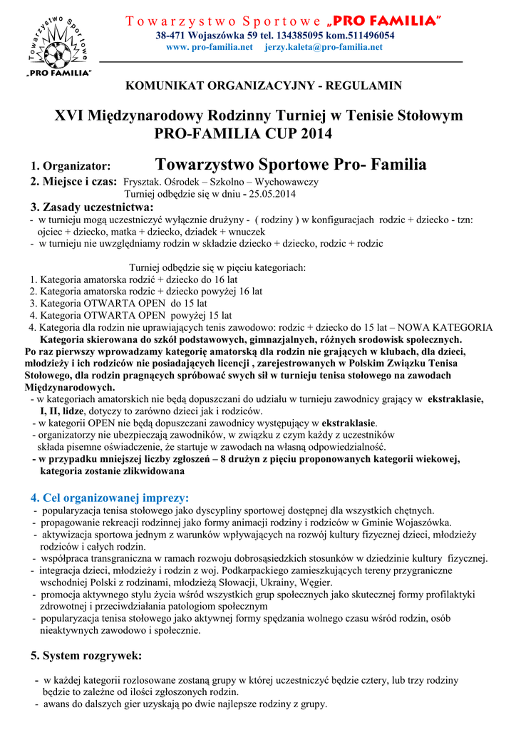 T o w a r z y s t w o S p o r t o w e „PRO FAMILIA” 38-471 Wojaszówka 59 tel. 134385095 kom.511496054 www. pro-familia.net [email protected] „Pro Familia” KOMUNIKAT ORGANIZACYJNY - REGULAMIN XVI Międzynarodowy Rodzinny Turniej w Tenisie Stołowym PRO-FAMILIA CUP 2014 1. Organizator: Towarzystwo Sportowe 2. Miejsce i czas: Frysztak. Ośrodek – Szkolno – Wychowawczy Pro- Familia Turniej odbędzie się w dniu - 25.05.2014 3. Zasady uczestnictwa: - w turnieju mogą uczestniczyć wyłącznie druŜyny - ( rodziny ) w konfiguracjach rodzic + dziecko - tzn: ojciec + dziecko, matka + dziecko, dziadek + wnuczek - w turnieju nie uwzględniamy rodzin w składzie dziecko + dziecko, rodzic + rodzic Turniej odbędzie się w pięciu kategoriach: 1. Kategoria amatorska rodzić + dziecko do 16 lat 2. Kategoria amatorska rodzic + dziecko powyŜej 16 lat 3. Kategoria OTWARTA OPEN do 15 lat 4. Kategoria OTWARTA OPEN powyŜej 15 lat 4. Kategoria dla rodzin nie uprawiających tenis zawodowo: rodzic + dziecko do 15 lat – NOWA KATEGORIA Kategoria skierowana do szkół podstawowych, gimnazjalnych, róŜnych srodowisk społecznych. Po raz pierwszy wprowadzamy kategorię amatorską dla rodzin nie grających w klubach, dla dzieci, młodzieŜy i ich rodziców nie posiadających licencji , zarejestrowanych w Polskim Związku Tenisa Stołowego, dla rodzin pragnących spróbować swych sił w turnieju tenisa stołowego na zawodach Międzynarodowych. - w kategoriach amatorskich nie będą dopuszczani do udziału w turnieju zawodnicy grający w ekstraklasie, I, II, lidze, dotyczy to zarówno dzieci jak i rodziców. - w kategorii OPEN nie będą dopuszczani zawodnicy występujący w ekstraklasie. - organizatorzy nie ubezpieczają zawodników, w związku z czym kaŜdy z uczestników składa pisemne oświadczenie, Ŝe startuje w zawodach na własną odpowiedzialność. - w przypadku mniejszej liczby zgłoszeń – 8 druŜyn z pięciu proponowanych kategorii wiekowej, kategoria zostanie zlikwidowana 4. Cel organizowanej imprezy: - popularyzacja tenisa stołowego jako dyscypliny sportowej dostępnej dla wszystkich chętnych. - propagowanie rekreacji rodzinnej jako formy animacji rodziny i rodziców w Gminie Wojaszówka. - aktywizacja sportowa jednym z warunków wpływających na rozwój kultury fizycznej dzieci, młodzieŜy rodziców i całych rodzin. - współpraca transgraniczna w ramach rozwoju dobrosąsiedzkich stosunków w dziedzinie kultury fizycznej. - integracja dzieci, młodzieŜy i rodzin z woj. Podkarpackiego zamieszkujących tereny przygraniczne wschodniej Polski z rodzinami, młodzieŜą Słowacji, Ukrainy, Węgier. - promocja aktywnego stylu Ŝycia wśród wszystkich grup społecznych jako skutecznej formy profilaktyki zdrowotnej i przeciwdziałania patologiom społecznym - popularyzacja tenisa stołowego jako aktywnej formy spędzania wolnego czasu wśród rodzin, osób nieaktywnych zawodowo i społecznie. 5. System rozgrywek: - w kaŜdej kategorii rozlosowane zostaną grupy w której uczestniczyć będzie cztery, lub trzy rodziny będzie to zaleŜne od ilości zgłoszonych rodzin. - awans do dalszych gier uzyskają po dwie najlepsze rodziny z grupy. - po rozgrywkach grupowych turniej zostanie przeprowadzony systemem pucharowym. wszystkie mecze będą rozgrywane do dwóch wygranych setów. druŜyny zajmujące trzecie, czwarte miejsca w grupach kończą udział w zawodach. mecze główne - finałowe w kaŜdej kategorii do trzech wygranych setów. organizator zastrzega sobie zmianę systemu rozgrywek ( w przypadku póŜnego rozgrywania meczy finałowych moŜliwość zmiany, do dwóch wygranych setów. - w zawodach obowiązują przepisy PZTS i POZTS – szczególna uwaga dotyczy sprzętu sportowego deski, okładziny, strój sportowy. - w spornych kwestiach ostateczną decyzję podejmuje Sędzia Główny zawodów. - Sędzia Główny i Organizatorzy są uprawnieni do sprawdzania toŜsamości uczestników zawodów. 6. Harmonogram: - zapisy druŜyn - rodzin do turnieju prosimy zgłaszać najpóźniej do 15. 05. 2013 celem przygotowania rozstawienia, losowania, zamówienia obiadów - nie przewidujemy moŜliwości zapisów w dniu zawodów, wyjątek stanowić będą druŜyny zagraniczne. - rodziny zagraniczne przyjazd w dniu 18.05.2013 do godz. 20.00 – zakwaterowanie moŜliwość kwaterunku dla rodzin z Polski – woj. śląskie, małopolskie - koszty noclegów pokrywa organizator turnieju. Program zawodów: - godz. 8.00 – 9.00 – sprawdzanie zgłoszeń, wydanie napojów, kart Ŝywieniowych – obiad opłaty wpisowego, losowanie w grupach. - godz. 9.00 – 9.30 – otwarcie turnieju, wystąpienia gości - godz. 9.30 – 13.00 – gry eliminacyjne w grupach i pierwsze mecze pucharowe. - godz. 13.00 – 14.00 – obiad dla wszystkich uczestników - godz. 14.00 – 16.00 – mecze ćwierćfinałowe, półfinałowe i finały - godz. 16.00 – 17.00 – zakończenie turnieju i wręczenie nagród 7. Nagrody dla rodzin od 1 do 4 miejsca: Kategoria I, II - OTWARTA OPEN do 15 i powyŜej 15 lat 1.miejsce 2. miejsce 3. miejsce 4. miejsce - okładziny tenisowe – komp.2 szt., grawerowany puchar szklany, dyplom - okładziny tenisowe – komp.2 szt., grawerowany puchar szklany, dyplom - deska tenisowa, grawerowany puchar szklany, dyplom - grawerowany puchar szklany, dyplom Kategoria I amatorska rodzic + dziecko do 16 lat, 1. miejsce - okładziny tenisowe - komp.2 szt. grawerowany puchar szklany, dyplom 2. miejsce - okładziny tenisowe – komp.2 szt., grawerowany puchar szklany, dyplom 3. miejsce - deska tenisowa, grawerowany puchar szklany, dyplom 4. miejsce - grawerowany puchar szklany, dyplom Kategoria II amatorska rodzic + dziecko powyŜej 16 lat: 1. miejsce - okładziny tenisowe - komp.2 szt. grawerowany puchar szklany, dyplom 2. miejsce - okładziny tenisowe – komp.2 szt., grawerowany puchar szklany, dyplom 3. miejsce - deska tenisowa, grawerowany puchar szklany, dyplom 4. miejsce - grawerowany puchar szkl