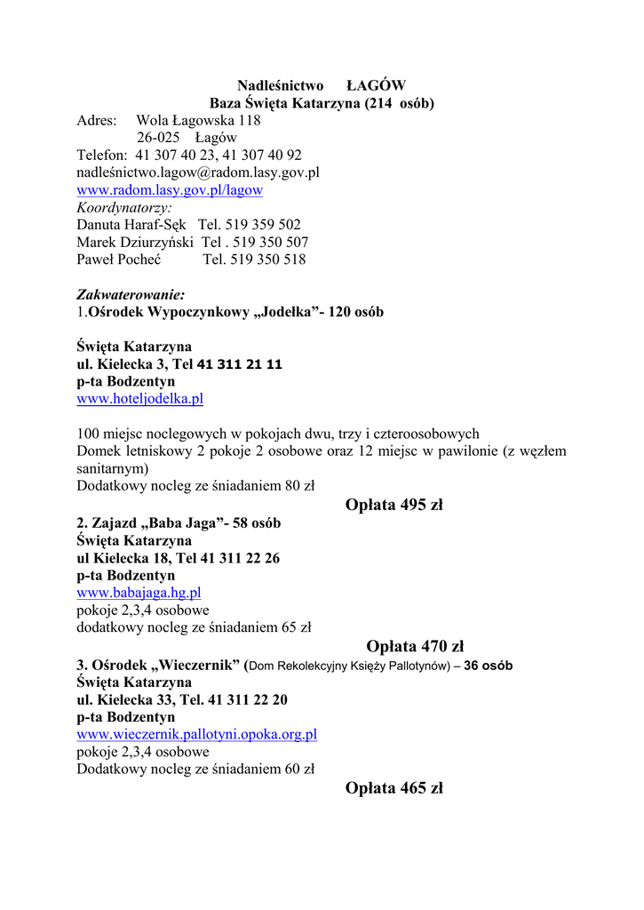 Nadleśnictwo ŁAGÓW Baza Święta Katarzyna (214 osób) Adres: Wola Łagowska 118 26-025 Łagów Telefon: 41 307 40 23, 41 307 40 92 nadleś[email protected] www.radom.lasy.gov.pl/lagow Koordynatorzy: Danuta Haraf-Sęk Tel. 519 359 502 Marek Dziurzyński Tel . 519 350 507 Paweł Pocheć Tel. 519 350 518 Zakwaterowanie: 1.Ośrodek Wypoczynkowy „Jodełka”- 120 osób Święta Katarzyna ul. Kielecka 3, Tel 41 311 21 11 p-ta Bodzentyn www.hoteljodelka.pl 100 miejsc noclegowych w pokojach dwu, trzy i czteroosobowych Domek letniskowy 2 pokoje 2 osobowe oraz 12 miejsc w pawilonie (z węzłem sanitarnym) Dodatkowy nocleg ze śniadaniem 80 zł Opłata 495 zł 2. Zajazd „Baba Jaga”- 58 osób Święta Katarzyna ul Kielecka 18, Tel 41 311 22 26 p-ta Bodzentyn www.babajaga.hg.pl pokoje 2,3,4 osobowe dodatkowy nocleg ze śniadaniem 65 zł Opłata 470 zł 3. Ośrodek „Wieczernik” (Dom Rekolekcyjny Księży Pallotynów) – 36 osób Święta Katarzyna ul. Kielecka 33, Tel. 41 311 22 20 p-ta Bodzentyn www.wieczernik.pallotyni.opoka.org.pl pokoje 2,3,4 osobowe Dodatkowy nocleg ze śniadaniem 60 zł Opłata 465 zł Trasy TRASY PIESZE – do wyboru TRASA I Łysogóry 200 osób 1-szy dzień – wycieczka piesza: Nowa Słupia – Św. Krzyż – Huta Szklana – Kakonin – Przełęcz Św. Mikołaja – Łysica – Św. Katarzyna. Długość trasy: 14 km. Czas przejścia: 5 h (bez czasu zwiedzania). Trasa trudna. Wyjazd autokarem do punktu wyjścia w Nowej Słupii, zwiedzanie Muzeum Starożytnego Hutnictwa z pozostałościami pieców hutniczych (dymarek) z I – III w.n.e., figura Św. Emeryka, wejście drogą królewską na szczyt Łysej Góry. Zwiedzanie Zabytkowego Zespołu Klasztornego na Św. Krzyżu i Muzeum Przyrodniczo – Leśnego ŚPN. Zejście ze Św Krzyża do Jodłowego Dworu w Szklanej Hucie i podjazd autokarami do Kakonina. Wyjście czerwonym szlakiem na Przełęcz Św. Mikołaja i na Łysicę (najwyższa góra Gór Świętokrzyskich-612 m npm) Obserwacja z punktu widokowego gołoborzy i panoramy Gór Świętokrzyskich. Zejście fragmentem Puszczy Jodłowej do Św. Katarzyny. Zwiedzanie zabytków Św. Katarzyny: klasztoru bernardynek, kapliczki przy źródełku Św. Franciszka, pomnika i kamienia poświęconego Stefanowi Żeromskiemu. TRASA II Lasami Cisowsko-Orłowińskimi 50 osób 1-szy dzień – wycieczka piesza: Sędek – Orłowiny – Zamczysko – Cisów. Długość trasy: 12 km, Czas przejścia: 3 h. Trasa łatwa. Wyjazd autokarem do Sędka, na punkt widokowy. Obserwacja panoramy pasma CisowskoOrłowińskiego, Ociesęckiego i Łysogórskiego. Przejście fragmentem lasów Orłowińskich. Obserwacja uszkodzeń drzewostanów spowodowanych przez zwójki jodłowe. Przejście na Wysokówkę z rezerwatem leśnym i archeologicznym „Zamczysko”. Zejście przez Widełki do Cisowa. Zwiedzenie zabytkowego kościoła z diabłem w ołtarzu. Powrót autokarem do Św. Katarzyny. TRASA III Pasmem Jeleniowskim 50 osób 1-szy dzień – trasa piesza: Janowice – Witosławie – Góra Witosławska – Szczytnik – Nieskurzów – Góra Jeleniowska – Paprocie. Długość trasy: 12 km, Czas przejścia: 5 h. Trasa trudna. Przejazd autokarem ze Świętej Katarzyny do Janowic. Zwiedzanie Izby Pamięci Jana Piwnika „Ponurego”. Wyjazd autokarem do Witosławic. Wyjście na Górę Witosławską. Zwiedzanie zabytkowej kapliczki pw Zesłania Ducha Św. Przejście szlakiem czerwonym przez lasy Pasma Jeleniowskiego. Obserwacja naturalnej sukcesji na gołoborzach w rezerwatach „Małe Gołoborze” i „Szczytnik”. Przemarsz na Górę Jeleniowską z rezerwatem chroniącym ostańcowe formy skałkowe z porastającym je naturalnym zespołem buczyny karpackiej w formie podgórskiej „Góra Jeleniowska”. Zejście do Paprocic. Powrót autokarem do Świętej Katarzyny. Na zakończenie 1-go dnia wieczorek integracyjny w Świętej Katarzynie przy OW „Jodełka” WYCIECZKA 200 osób AUTOKAROWA „ŚLADAMI OJCA MATEUSZA” 2-gi dzień – wycieczka autokarowa: Św. Katarzyna – Łagów – Opatów – Sandomierz – Ujazd. Długość trasy 140 km. Wyjazd ze Św. Katarzyny przez Górno, Łagów, Opatów do Sandomierza. Wejście na Zamek i do Domu Długosza. Zwiedzanie Starego Miasta, przejście trasą podziemną. W drodze powrotnej krótki postój w Opatowie. Spacer po rynku i wejście do Kolegiaty. Zakończenie wycieczki na Zamku Krzyżtopór w Ujeździe. Ognisko w obrębie Zamku. Powrót w godzinach wieczornych do Św. Katarzyny.