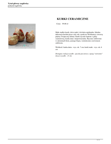 Tytuł główny nagłówka podtytuł nagłówka KURKI CERAMICZNE Cena: 59.00 zł Małe stadko kurek, dwie małe i ich duża opiekunka. Idealna dekoracja kuchni przez cały rok a podczas Wielkanocy stworzą piękny świąteczny klimat. Kurki ręcznie lepione z gliny szamotowej, każda inna i niepowtarzalna. Ręcznie szkliwione w odcieniach beżu, jasnego brązu, wykończone czerwonym szkliwem. Wielkość: kurka duża - wys. ok. 7 cm; kurki małe - wys. ok. 6 cm Dostępny rodzaj wysyłki - paczka pocztowa z opcją "ostrożnie" (koszt wysyłki - 15 zł). 1/1 Powered by TCPDF (www.tcpdf.org)