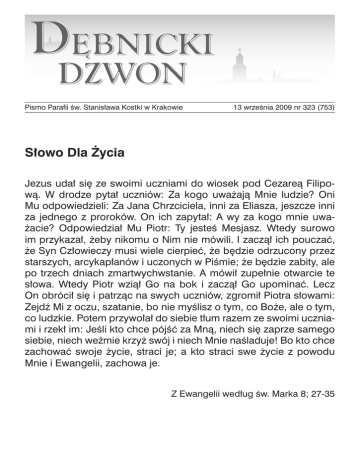 Pismo Parafii św. Stanisława Kostki w Krakowie 13 września 2009 nr 323 (753) Słowo Dla Życia Jezus udał się ze swoimi uczniami do wiosek pod Cezareą Filipową. W drodze pytał uczniów: Za kogo uważają Mnie ludzie? Oni Mu odpowiedzieli: Za Jana Chrzciciela, inni za Eliasza, jeszcze inni za jednego z proroków. On ich zapytał: A wy za kogo mnie uważacie? Odpowiedział Mu Piotr: Ty jesteś Mesjasz. Wtedy surowo im przykazał, żeby nikomu o Nim nie mówili. I zaczął ich pouczać, że Syn Człowieczy musi wiele cierpieć, że będzie odrzucony przez starszych, arcykapłanów i uczonych w Piśmie; że będzie zabity, ale po trzech dniach zmartwychwstanie. A mówił zupełnie otwarcie te słowa. Wtedy Piotr wziął Go na bok i zaczął Go upominać. Lecz On obrócił się i patrząc na swych uczniów, zgromił Piotra słowami: Zejdź Mi z oczu, szatanie, bo nie myślisz o tym, co Boże, ale o tym, co ludzkie. Potem przywołał do siebie tłum razem ze swoimi uczniami i rzekł im: Jeśli kto chce pójść za Mną, niech się zaprze samego siebie, niech weźmie krzyż swój i niech Mnie naśladuje! Bo kto chce zachować swoje życie, straci je; a kto straci swe życie z powodu Mnie i Ewangelii, zachowa je. Z Ewangelii według św. Marka 8; 27-35 Słowo Dla Życia ciąg dalszy Wierzę Po dwóch tysiącach lat orędzie Jezusa nie straciło nic na swojej jednoznaczności: „Kto chce zachować swoje życie, straci je, a kto straci swe życie z powodu mnie i Ewangelii, ten je zachowa”. Każdy stawiany przez nas krok wiąże się ze stratą: poczucia bezpieczeństwa, towarzysza drogi, bliskości i ciepła. Ale tylko wtedy, gdy zaryzykujemy, gdy pogodzimy się z utratą czegoś ważnego, doświadczymy czegoś nowego. ”Kto chce zachować swoje życie, straci je”- to znaczy: kto idzie przez życie, ściskając kurczowo w dłoni wszystko to, co wypracował i osiągnął - pieniądze, status, wiedzę władzę-stanie kiedyś z pustymi rękami, gdyż nieustanny wysiłek zachowania tego wszystkiego zaślepiał go, uniemożliwiał mu dostrzeżenie tego, co nowe, zasłaniał mu dar prawdziwego życia, życia w pełni, które daje Jezus. Otwierając się w wierze i miłości na ten dar, nie mamy żadnej gwarancji, że niczego nie stracimy. Być może -w oczach tego świata-rzeczywiście stracimy nasze życie. Ale Jezus daje nam gwarancję, pewność, że ta 2 strata nie będzie bezsensowna, że będzie to decydujący krok w stronę tego, co Biblia nazywa szczęściem, zbawieniem, wyzwoleniem, pełnią życia. Za każdym razem, gdy uczestniczymy w Eucharystii, spotykamy się z Tym, który stracił swoje życie, a mimo to żyje. Po przeistoczeniu mówimy przecież: ”Głosimy śmierć Twoją, Panie Jezu, wyznajemy Twoje zmartwychwstanie…”Powinniśmy częściej przypominać sobie te słowa i otwierać się na spotkanie z ukrzyżowanym i zmartwychwstałym Synem Człowieczym szczególnie wtedy, gdy zdaje się nam, ze tracimy swoje życie pod ciężarem krzyża samotności, wad własnych i naszych bliźnich, nędzy i chorób, kiedy wydaje się nam, że Bóg nas opuścił. Wówczas zrozumiemy, że słowa Jezusa są w istocie dobrą nowiną. On przemieni nasze cierpienie i naszą śmierć w życie i radość bez końca. Teraz zaś niesie nasz krzyż razem z nami i nie zostawi nas samych ani w cierpieniu, ani w śmierci. Wierzę w radość nie z tego ni z owego w anioła co spadł z nieba by bawić się w śniegu w serce co chce wszystkiego i jeszcze cokolwiek w uśmiech że ktoś wymyślił sobie koniec końców i jeszcze mówi po co i co dalej w matkę co zniknęła za furtką ogrodu w Boga prawdziwego bo już bez dowodów takiego co nie lubi teorii o sobie ks. Jan Twardowski Ks. Jan Dubas SDB 3 Rodzina, „mały Kościół” w Roku Kapłańskim W dniu diecezjalnej pielgrzymki rodzin do Sanktuarium w Kalwarii Zebrzydowskiej Przypomnijmy sobie słowa Ojca Świętego Benedykta XVI Drodzy bracia i siostry! Trzy dni temu, 27 sierpnia, obchodziliśmy liturgiczne wspomnienie świętej Moniki, matki św. Augustyna, uważanej za wzór i patronkę chrześcijańskich matek. Wiadomości o niej pochodzą z autobiograficznej książki syna, Wyznania, jednego z najbardziej czytanych arcydzieł wszystkich czasów. Stąd dowiadujemy się, że św. Augustyn wyssał imię Jezusa z mlekiem matki i przez matkę wychowany został w religii chrześcijańskiej, której zasady pozostaną w nim odciśnięte nawet w latach duchowego i moralnego zagubienia. Monika nie przestała na moment modlić się za niego i za jego nawrócenie i zaznała pociechy, widząc jego powrót do wiary i przyjęcie chrztu. Pan Bóg wysłuchał modlitw tej świętej matki, o której Biskup Tagasty powiedział: „Niemożliwe, aby syn tylu łez się zatracił”. Zaprawdę św. Augustyn nie tylko nawrócił się, ale postanowił wybrać życie monastyczne, a powróciwszy do Afryki sam założył wspólnotę mniszą. Wzruszające i budujące są ostatnie duchowe rozmowy między nim i matką w zaciszu domu w Ostii, w oczekiwaniu na odpłynięcie do Afryki. Św. Monika stała 4 się już dla swego syna „więcej niż matką, źródłem jego chrześcijaństwa”. Jedynym jej pragnieniem było przez lata nawrócenie Augustyna, który teraz zdecydowany był podjąć nawet drogę życia konsekrowanego na służbie Boga. Mogła zatem umierać zadowolona i rzeczywiście zgasła 27 sierpnia 387 r., w wieku 56 lat, prosząc synów, by nie troszczyli się o jej pochówek, lecz by pamiętali o niej, gdziekolwiek będą, przy ołtarzu Pańskim. Św. Augustyn powtarzał, że jego matka „urodziła go dwa razy”. Historia chrześcijaństwa pełna jest niezliczonych przykładów świętych rodziców i autentycznych rodzin chrześcijańskich, które towarzyszyły życiu wielkodusznych kapłanów i pasterzy Kościoła. Pomyślmy o św. Bazylim Wielkim i Grzegorzu z Nazjanzu, należących do rodzin świętych. Pomyślmy o bliższych nam małżonkach Luigim 