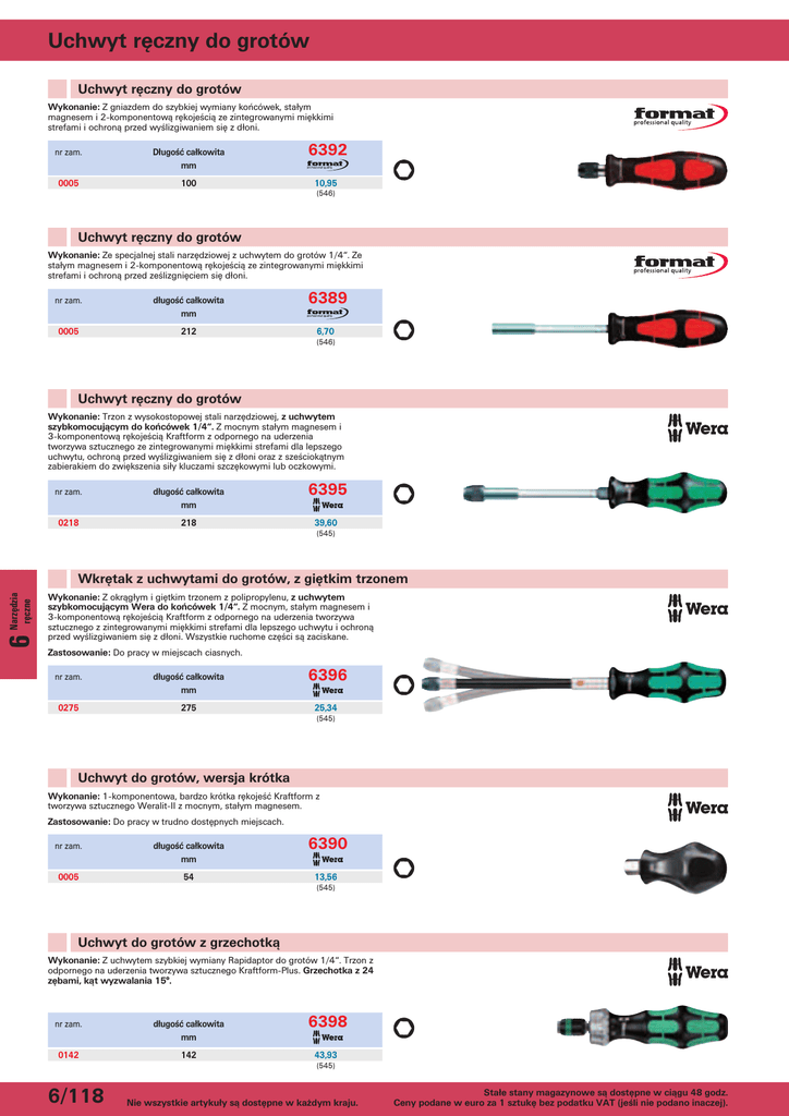 Uchwyt ręczny do grotów Uchwyt ręczny do grotów Wykonanie: Z gniazdem do szybkiej wymiany końcówek, stałym magnesem i 2-komponentową rękojeścią ze zintegrowanymi miękkimi strefami i ochroną przed wyślizgiwaniem się z dłoni. nr zam. Długość całkowita mm 0005 100 6392 10,95 (546) Uchwyt ręczny do grotów Wykonanie: Ze specjalnej stali narzędziowej z uchwytem do grotów 1/4“. Ze stałym magnesem i 2-komponentową rękojeścią ze zintegrowanymi miękkimi strefami i ochroną przed ześlizgnięciem się dłoni. nr zam. długość całkowita mm 0005 212 6389 6,70 (546) Uchwyt ręczny do grotów Wykonanie: Trzon z wysokostopowej stali narzędziowej, z uchwytem szybkomocującym do końcówek 1/4“. Z mocnym stałym magnesem i 3-komponentową rękojeścią Kraftform z odpornego na uderzenia tworzywa sztucznego ze zintegrowanymi miękkimi strefami dla lepszego uchwytu, ochroną przed wyślizgiwaniem się z dłoni oraz z sześciokątnym zabierakiem do zwiększenia siły kluczami szczękowymi lub oczkowymi. nr zam. długość całkowita mm 0218 218 6395 39,60 (545) 6 Narzędzia ręczne Wkrętak z uchwytami do grotów, z giętkim trzonem Wykonanie: Z okrągłym i giętkim trzonem z polipropylenu, z uchwytem szybkomocującym Wera do końcówek 1/4“. Z mocnym, stałym magnesem i 3-komponentową rękojeścią Kraftform z odpornego na uderzenia tworzywa sztucznego z zintegrowanymi miękkimi strefami dla lepszego uchwytu i ochroną przed wyślizgiwaniem się z dłoni. Wszystkie ruchome części są zaciskane. Zastosowanie: Do pracy w miejscach ciasnych. nr zam. długość całkowita mm 0275 275 6396 25,34 (545) Uchwyt do grotów, wersja krótka Wykonanie: 1-komponentowa, bardzo krótka rękojeść Kraftform z tworzywa sztucznego Weralit-II z mocnym, stałym magnesem. Zastosowanie: Do pracy w trudno dostępnych miejscach. nr zam. długość całkowita mm 0005 54 6390 13,56 (545) Uchwyt do grotów z grzechotką Wykonanie: Z uchwytem szybkiej wymiany Rapidaptor do grotów 1/4“. Trzon z odpornego na uderzenia tworzywa sztucznego Kraftform-Plus. Grzechotka z 24 zębami, kąt wyzwalania 15°. nr zam. długość całkowita mm 0142 142 6398 43,93 (545) 6/118 Nie wszystkie artykuły są dostępne w każdym kraju. Stałe stany magazynowe są dostępne w ciągu 48 godz. Ceny podane w euro za 1 sztukę bez podatku VAT (jeśli nie podano inaczej). Uchwyt ręczny do grotów Wkrętak Kraftform Kompakt Wykonanie: Ergonomiczna, wielokomponentowa rękojeść Kraftform z ochroną przed wyślizgiwaniem się z dłoni z magazynkiem na 6 grotów, otwieranym za pomocą przycisku. W ten sposób można wygodnie wymienić groty. Kraftform Kompakt 28 SB Wykonanie: Z wyciąganym i wkładanym trzpieniem z magnetycznym uchwytem ze stali szlachetnej. nr zam. 0028 zawartość zestawu 6397 2 groty płaskie 1,0 x 5,5; 1,2 x 6,5 mm 2 groty krzyżowe PH 1; 2 2 groty krzyżowe PZ 1; 2 38,40 (545) Kraftform Kompakt 20 Wykonanie: Z wpuszczanym i wyjmowanym grotem bagnetowym z szybkowymiennym uchwytem narzędziowym Rapidaptor do łatwej i szybkiej wymiany grotów. Dostawa w torbie na pasek. nr zam. 0020 zawartość zestawu 6393 2 groty płaskie 1,0 x 5,5; 1,2 x 6,5 mm 2 groty krzyżowe PH 1; 2 2 groty krzyżowe PZ 1; 2 68,51 (545) Kraftform Kompakt 22 Wykonanie: Z wpuszczanym i wyjmowanym grotem bagnetowym z szybkowymiennym uchwytem narzędziowym Rapidaptor do łatwej i szybkiej wymiany grotów. Dostawa w torbie na pasek. 0022 zawartość zestawu 6394 3 groty krzyżowe PZ 1; 2 (2 sztuki) 3 groty wewn. gniazdo TORX® T 15; 20; 25 71,39 Narzędzia ręczne nr zam. (545) 6 Kraftform Kompakt 27 RA 1 Wykonanie: Z funkcją grzechotki, 24 zęby, kąt wyzwalania 15°, z przełącznikiem pierścieniowym i magnetycznym uchwytem ze stali szlachetnej. Grzechotka uzyskuje maksymalny moment obrotowy 50 N•m. nr zam. 0005 Zawartość zestawu 6400 2 groty płaskie 1,0 x 5,5; 1,2 x 6,5 mm 2 groty krzyżowe PH 1; 2 2 groty krzyżowe PZ 1; 2 55,90 (545) Artykuły oznaczone znakiem ◊ nie są w magazynie. Zakup tych artykułów realizowany jest w krótkim terminie. Nie wszystkie artykuły są dostępne w każdym kraju. 6/119 Łączniki/uchwyty uniwersalne Adaptery Wykonanie: Stal chromowo-wanadowa, z pierścieniem zabezpieczającym. Zastosowanie: Do maszynowych nasadek wkrętakowych do łączenia grotów z elementami napędowymi. nr zam. gniazdo do grotów cal 0005 0010 0015 0020 1/4 1/4 1/4 5/16 6403 gniazdo czworokątne cal długość mm 15,37 16,63 19,36 19,36 1/4 3/8 1/2 1/2 25 30 35 35 6403 0005 (545) 6403 0010–0020 Adaptery Wykonanie: Stal chromowo-wanadowa, z uchwytem do szybkiej wymiany. Zastosowanie: Do maszynowych nasadek wkrętakowych do łączenia grotów z elementami napędowymi. nr zam. gniazdo do grotów cal 0005 0010 0020 0025 1/4 1/4 1/4 5/16 6405 gniazdo czworokątne cal długość mm 18,40 20,65 21,07 37,00 1/4 3/8 1/2 1/2 30 43 50 50 6405 0005 (545) 6405 0010–0025 Adaptery Wykonanie: Stal chromowo-wanadowa, z trzpieniem zabezpieczającym. nr zam. mocowanie narzędzi cal 0005 0010 1/4 1/4 1/4" 6407 gniazdo maszynowe długość mm 4,96 5,20 1/4" sześciokąt 7 mm, okrągłe 50 75 1/4" 6407 0005 1/4" ∅7 (546) 6407 0010 6 Narzędzia ręczne Zastosowanie: Do zestawów nasadek wkrętakowych, do łączenia kluczy nasadowych z danym narzędziem uruchamiającym. Adaptery Wykonanie: Stal chromowo-wanadowa, z trzpieniem zabezpieczającym. Zastosowanie: Do zestawów nasadek wkrętakowych, do łączenia kluczy nasadowych z danym narzędziem uruchamiającym. nr zam. mocowanie narzędzi cal 0003 0005 0010 1/4 3/8 1/4 1/4" 1/4" 6408 gniazdo maszynowe długość mm 8,72 11,34 16,39 1/4" sześciokąt 1/4" sześciokąt SDS-plus 50 50 70 6408 0003 3/8" 1/4" 6408 0005 (545) 1/4" D 6408 0010 Adaptery Wykonanie: Stal chromowo-wanadowa, z trzpieniem zabezpieczającym. Zastosowanie: Do zestawów nasadek wkrętakowych, do łączenia kluczy nasadowych z danym narzędziem uruchamiającym. nr zam. 0300 zawartość zestawu 1 x 1/4" kwadrat