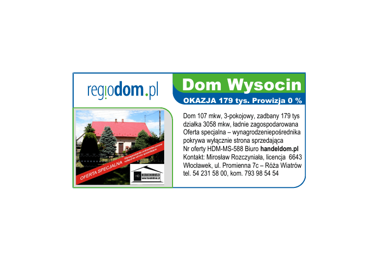 Dom Wysocin OKAZJA 179 tys. Prowizja 0 % Dom 107 mkw, 3-pokojowy, zadbany 179 tys działka 3058 mkw, ładnie zagospodarowana Oferta specjalna – wynagrodzeniepośrednika pokrywa wyłącznie strona sprzedająca Nr oferty HDM-MS-588 Biuro handeldom.pl Kontakt: Mirosław Rozczyniała, licencja 6643 Włocławek, ul. Promienna 7c – Róża Wiatrów tel. 54 231 58 00, kom. 793 98 54 54