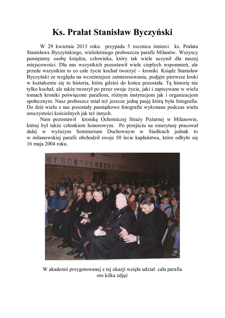 Ks. Prałat Stanisław Byczyński W 29 kwietnia 2013 roku przypada 5 rocznica śmierci ks. Prałata Stanisława Byczyńskiego, wieloletniego proboszcza parafii Milanów. Wszyscy pamiętamy osobę księdza, człowieka, który tak wiele uczynił dla naszej miejscowości. Dla nas wszystkich pozostawił wiele ciepłych wspomnień, ale przede wszystkim to co całe życie kochał tworzyć – kroniki. Ksiądz Stanisław Byczyński ze względu na wcześniejsze zainteresowania, podjęte pierwsze kroki w kształceniu się to historia, która gdzieś do końca pozostała. Tą historię nie tylko kochał, ale także tworzył po przez swoje życie, jaki i zapisywane w wielu tomach kroniki poświęcone parafiom, różnym instytucjom jak i organizacjom społecznym. Nasz proboszcz miał też jeszcze jedną pasję którą była fotografia. Do dziś wielu z nas pozostały pamiątkowe fotografie wykonane podczas wielu uroczystości kościelnych jak też innych. Nam pozostawił kronikę Ochotniczej Straży Pożarnej w Milanowie, której był także członkiem honorowym. Po przejściu na emeryturę pracował dalej w wyższym Seminarium Duchownym w Siedlcach jednak to w milanowskiej parafii obchodził swoje 50 lecie kapłaństwa, które odbyło się 16 maja 2004 roku. W akademii przygotowanej z tej okazji wzięła udział cała parafia oto kilka zdjęć całość uroczystości uświetniły także milanowskie przedszkolaki Na zakończenie wspólna fotografia z jubilatem A tak życzenia za wieloletnią posługę kapłańską wyrazili parafianie Drogi Księże Stanisławie To ogromne wyróżnienie dla nas i naszej parafii, że właśnie to tu zechciałeś świętować Jubileusz 50-lecia swego kapłaństwa. Dziś wraz z Tobą, Drogi Jubilacie, składamy Bogu wdzięczność za dar Twego powołania, za ofiarną 50-letnią służbę ludziom i Panu w tym – 15-letnią posługę w Milanowie. Kiedy rozpoczynaliśmy przygotowania do Jubileuszu Twego Kapłaństwa zauważyliśmy z radością, że parafianie Milanowa ochoczo przystępują do wykonania potrzebnych zadań. Sami ofiarują pomoc, wnoszą nowe propozycje jak uroczystość tę uświetnić. Można więc zapytać, co sprawiło, że ten, który odszedł z naszej wspólnoty ...... lat temu – wciąż tak żywo jest obecny w naszych sercach? Wolter wyraża to tak: „Tylko ludzie o wielkich zaletach serca mają przyjaciół.” Musi być więc w Tobie wielkie i czyste serce, otwarte dla każdego, chętne do świadczenia wszelkich potrzebnych posług i obdarowywania miłością, bo – jak głosi Papież Jan Paweł II: „Człowiek jest wielki nie przez to, co ma, nie przez to, kim jest, lecz przez to, czym dzieli się z innymi.” Takim Cię pamiętamy – Drogi Księże Proboszczu: zawsze pogodny, spokojny, uśmiechnięty z Hiobową cierpliwością znosiłeś własne cierpienie, niedosyt naszej wiary czy zwykłe ludzkie ułomności. Otwierałeś się na ludzkie potrzeby, pragnienia. Służyłeś radą i pomocą. Duża wiedza, potęga mądrości, stoicka postawa wobec przeciwności losu – dyktowały Ci mądre rozwiązania, pomagały realizować Boże plany. Wiodłeś wśród nas życie skromne ale Boże, pogodne ale pełne zajęć. To Tobie – z zamiłowania historykowi i fotografowi z powołania – Księdzu Proboszczowi zawdzięczamy dzieje, które nie zginą, bo są uwiecznione w słowach, w obrazach, w fotografiach. W kronikach parafii, straży znajdziemy nasze życie, naszych przodków i nasze marzenia o przyszłości. Czyniłeś wśród nas dobro, które i dziś procentuje, bo „Dzisiaj jest uczniem wczoraj”, a „Odrobina dobra, okazana drugiemu człowiekowi, lepsza jest niż cała miłość do ludzkości.” Dzięki swojej postawie pobożności i radosnego zachwytu życiem wyzwalałeś i w nas pokłady miłości do Boga i ludzi, szacunku do obowiązków, wiedzy, potrzebę służby wobec innych i umiejętności poprzestawania na małym, zadowolenia z dóbr, które są w prawdzie przemijające ale i niezbędne w doczesnym życiu człowieka. „Nie ma lepszego sposobu pobudzania dobroci w ludziach, niż traktować ich tak, jakby już byli dobrymi.” A Ty w nas widziałeś dobro, wielkość, stawiałeś przed nami zadania ale i budowałeś nadzieję, że im podołamy, służyłeś mądrą poradą i własnym przykładem. Wciąż pamiętamy Twoje Kapłanie pouczenia, że wobec Boga jesteśmy odpowiedzialni za bliźnich, że czyniąc zło nie tylko siejemy zgorszenie, ale gubimy duszę swoją i bliźnich, sąsiadów. Tak realizowało się w nas wspólnie najważniejsze z przykazań – nakaz miłości. „Kluczem do ludzkich serc jest miłość.” Dając ją innym – zaskarbiłeś sobie nasze wierne uczucia przyjaźni i wdzięczności. Chociaż przybyło lat, włosy nabrały już tylko jednej siwej barwy – dla nas będziesz wciąż taki sam: pracowity, obowiązkowy, ciekawy świata, poszukujący wiedzy – bowiem „Ludzie, których kocha się z całego serca, nigdy się nie starzeją”. A ty zawsze jesteś obecny w naszych sercach i w naszej pamięci. Nade wszystko cenna jest Twoja głęboka wiara i ta prosta, życiowa umiejętność krzewienia jej wśród ludzi. To wiara daje moc, nadzieję i radość. „Bez wiary potykamy się o źdźbło słomy, z wiarą przenosimy góry.” Za to umocnienie w nas miłości do Boga naszej małej wiary – składamy dziś przede wszystkim serdeczne podziękowania. Ta wiara procentuje w nas – których łączyłeś w małżeńskie związki, w naszych dzieciach – które chrzciłeś i którym udzielałeś Najświętszych Sakramentów. Ta wiara – da nam życie wieczne. Dla tego tak Cię – Drogi Księże Prałacie – ciepło wspominamy i gorąco kochamy. Na pewno nie byliśmy idealną wspólnotą. Nasze słabości, błędy, zaniedbania – nastręczały problemów. Mamy nadzieję, że pozostały już tylko we wspomnieniach, a „Wspomnienia są jak światła i barwy – podświetlają i retuszują przykrości n