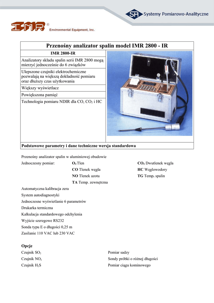 Przenośny analizator spalin model IMR 2800 - IR IMR 2800-IR Analizatory składu spalin serii IMR 2800 mogą mierzyć jednocześnie do 6 związków Ulepszone czujniki elektrochemiczne pozwalają na większą dokładność pomiaru oraz dłuższy czas użytkowania Większy wyświetlacz Powiększona pamięć Technologia pomiaru NDIR dla CO, CO2 i HC Podstawowe parametry i dane techniczne wersja standardowa Przenośny analizator spalin w aluminiowej obudowie Jednoczesny pomiar: O2 Tlen CO2 Dwutlenek węgla CO Tlenek węgla HC Węglowodory NO Tlenek azotu TG Temp. spalin TA Temp. zewnętrzna Automatyczna kalibracja zera System autodiagnostyki Jednoczesne wyświetlanie 6 parametrów Drukarka termiczna Kalkulacja standardowego odchylenia Wyjście szeregowe RS232 Sonda typu E o długości 0,25 m Zasilanie 110 VAC lub 230 VAC Opcje Czujnik SO2 Pomiar sadzy Czujnik NO2 Sondy próbki o różnej długości Czujnik H2S Pomiar ciągu kominowego Mierzony związek Metoda pomiarowa Rozdzielczość Dokładność Zakres Standard O2 Tlen Celka elektrochemiczna 0,1 % vol. ± 0,2 % 0-25 % vol √ CO Tlenek węgla NDIR 0,01 % ±4% 0-15 % √ NO Tlenek azotu Celka elektrochemiczna 1 ppm ±4% 0-5000 ppm √ CO2 Dwutlenek węgla NDIR 0,01 % ±4% 0-20 % √ HC Węglowodory NDIR 1 ppm ±4% 0-30 000 ppm √ NO2 Dwutlenek azotu Celka elektrochemiczna 1 ppm ±5% 0-100 ppm opcja SO2 Dwutlenek siarki Celka elektrochemiczna 1 ppm ±5% 0-4000 ppm opcja H2S siarkowodór Celka elektrochemiczna 1 ppm ±5% 0-200 ppm opcja TG Temp. spalin Termopara NiCr-Ni 1K ±2% -20/1200 oC √ o TA Temp. zewnętrzna półprzewodnik 1K ± 0,5 K -20/120 C √ P Ciąg kominowy 0,01 hPa ±2% -20 hPa /+20 hPa opcja Sadza filtr papierowy Dostępne są również inne zakresy pomiarowe Wersja standardowa Wymiary: 380 x 165 x 315 mm Waga: 8,0 kg Przedstawiciel firmy IM na terenie Polski: SPA Systemy Pomiarowo-Analityczne sp. z o.o. www.spa-systemy.pl; [email protected] opcja