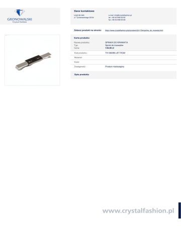 Powered by TCPDF (www.tcpdf.org) Dane kontaktowe Łódź 90-349 ul. Tymienieckiego 22/24 Zobacz produkt na stronie: e-mail: [email protected] tel. +48 42 648 05 60 fax +48 42 648 05 80 https://www.crystalfashion.pl/pl/produkt/23/1754/spinka_do_krawata.html Karta produktu Nazwa produktu: Typ: Cena: SPINKA DO KRAWATA Spinki do krawatów 143.00 zł Kod produktu: TH-5809M.JET.RGM Materiał: Kolor: Dostępność: Opis produktu Produkt niedostępny
