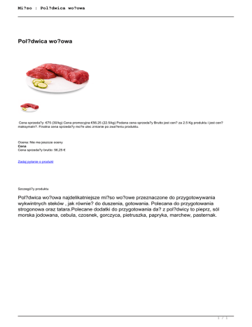 Mi?so : Pol?dwica wo?owa Pol?dwica wo?owa Cena sprzeda?y: €75 (30/kg) Cena promocyjna €56.25 (22.5/kg) Podana cena sprzeda?y Brutto jest cen? za 2.5 Kg produktu i jest cen? maksymaln?. Finalna cena sprzeda?y mo?e ulec zmianie po zwa?eniu produktu. Ocena: Nie ma jeszcze oceny Cena Cena sprzeda?y brutto: 56,25 € Zadaj pytanie o produkt Szczegó?y produktu Pol?dwica wo?owa najdelikatniejsze mi?so wo?owe przeznaczone do przygotowywania wykwintnych steków , jak równie? do duszenia, gotowania. Polecana do przygotowania strogonowa oraz tatara.Polecane dodatki do przygotowania da? z pol?dwicy to pieprz, sól morska jodowana, cebula, czosnek, gorczyca, pietruszka, papryka, marchew, pasternak. 1 / 1 Powered by TCPDF (www.tcpdf.org)