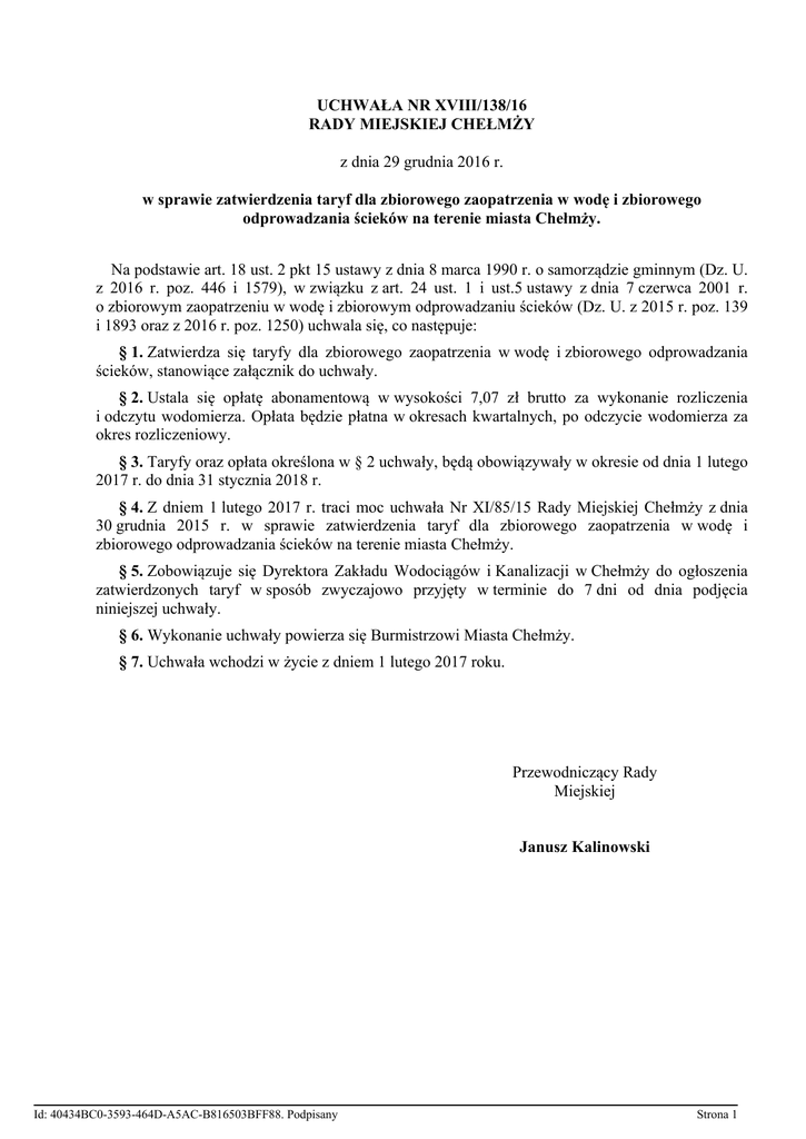 UCHWAŁA NR XVIII/138/16 RADY MIEJSKIEJ CHEŁMŻY z dnia 29 grudnia 2016 r. w sprawie zatwierdzenia taryf dla zbiorowego zaopatrzenia w wodę i zbiorowego odprowadzania ścieków na terenie miasta Chełmży. Na podstawie art. 18 ust. 2 pkt 15 ustawy z dnia 8 marca 1990 r. o samorządzie gminnym (Dz. U. z 2016 r. poz. 446 i 1579), w związku z art. 24 ust. 1 i ust.5 ustawy z dnia 7 czerwca 2001 r. o zbiorowym zaopatrzeniu w wodę i zbiorowym odprowadzaniu ścieków (Dz. U. z 2015 r. poz. 139 i 1893 oraz z 2016 r. poz. 1250) uchwala się, co następuje: § 1. Zatwierdza się taryfy dla zbiorowego zaopatrzenia w wodę i zbiorowego odprowadzania ścieków, stanowiące załącznik do uchwały. § 2. Ustala się opłatę abonamentową w wysokości 7,07 zł brutto za wykonanie rozliczenia i odczytu wodomierza. Opłata będzie płatna w okresach kwartalnych, po odczycie wodomierza za okres rozliczeniowy. § 3. Taryfy oraz opłata określona w § 2 uchwały, będą obowiązywały w okresie od dnia 1 lutego 2017 r. do dnia 31 stycznia 2018 r. § 4. Z dniem 1 lutego 2017 r. traci moc uchwała Nr XI/85/15 Rady Miejskiej Chełmży z dnia 30 grudnia 2015 r. w sprawie zatwierdzenia taryf dla zbiorowego zaopatrzenia w wodę i zbiorowego odprowadzania ścieków na terenie miasta Chełmży. § 5. Zobowiązuje się Dyrektora Zakładu Wodociągów i Kanalizacji w Chełmży do ogłoszenia zatwierdzonych taryf w sposób zwyczajowo przyjęty w terminie do 7 dni od dnia podjęcia niniejszej uchwały. § 6. Wykonanie uchwały powierza się Burmistrzowi Miasta Chełmży. § 7. Uchwała wchodzi w życie z dniem 1 lutego 2017 roku. Przewodniczący Rady Miejskiej Janusz Kalinowski Id: 40434BC0-3593-464D-A5AC-B816503BFF88. Podpisany Strona 1 Załącznik do Uchwały Nr XVIII/138/16 Rady Miejskiej Chełmży z dnia 29 grudnia 2016 r. TARYFY DLA ZBIOROWEGO ZAOPATRZENIA W WODĘ I ZBIOROWEGO ODPROWADZANIA ŚCIEKÓW 1. Informacje ogólne Niniejsza taryfa stanowi zestawienie cen i stawek opłat za zbiorowe zaopatrzenie w wodę i zbiorowe odprowadzanie ścieków oraz określa warunki ich stosowania obowiązujące na terenie gminy Miasto Chełmża na okres 12 miesięcy : od dnia 1 lutego 2017 r. do dnia 31 stycznia 2018 r. Taryfa została opracowana na podstawie przepisów ustawy z dnia 7 czerwca 2001 r. o zbiorowym zaopatrzeniu w wodę i zbiorowym odprowadzaniu ścieków (Dz. U. z 2015 r. poz. 139 i 1893 oraz z 2016 r. poz. 1250), zwanej dalej Ustawą oraz rozporządzenia Ministra Infrastruktury z dnia 28 czerwca 2006 r. w sprawie określania taryf, wzoru wniosku o zatwierdzenie taryf oraz warunków rozliczeń za zbiorowe zaopatrzenie w wodę i zbiorowe odprowadzanie ścieków (Dz. U. z 2006 r. Nr 127, poz. 886 oraz z 2016 r. poz. 1301), zwanego dalej Rozporządzeniem. Taryfowe ceny i stawki opłat dotyczą wszystkich odbiorców usług w zakresie dostawy wody i odbioru ścieków świadczonych przez przedsiębiorstwo wodociągowo-kanalizacyjne, z wyłączeniem odbiorców i dostawców hurtowych, wód opadowych i roztopowych odprowadzanych wydzieloną kanalizacją deszczową a także odbiorców dostarczających nieczystości płynne z terenów nieskanalizowanych. 2. Rodzaj prowadzonej działalności Zakład Wodociągów i Kanalizacji w Chełmży, jako przedsiębiorstwo wodociągowokanalizacyjne prowadzi działalność w zakresie zbiorowego zaopatrzenia w wodę i zbiorowego odprowadzania ścieków na podstawie Uchwały Rady Miejskiej Nr XV/116/91 z dnia 21.12.1991 roku. Zgodnie z zezwoleniem przedmiot działalności przedsiębiorstwa stanowi: 1/ w zakresie zbiorowego zaopatrzenia w wodę: ujmowanie, uzdatnianie i dostarczanie wody za pomocą urządzeń wodociągowych, usługobiorcom, z którymi zawarto umowę, 2/ w zakresie zbiorowego odprowadzania ścieków: odprowadzanie ścieków dostarczonych przez usługobiorców, z którymi zawarto umowy, za pomocą urządzeń kanalizacyjnych. Przedsiębiorstwo nie posiada oczyszczalni ścieków i zadania w tym zakresie zleca przedsiębiorstwu zajmującemu się oczyszczaniem ścieków komunalnych - w okresie obowiązywania Taryfy ścieki dostarczane będą do oczyszczalni ścieków Toruńskich Wodociągów sp. z o.o w Toruniu. 3. Taryfowe grupy odbiorców usług Podstawą klasyfikacji taryfowych grup odbiorców usług jest charakterystyka przeznaczenia poboru wody i odprowadzanych ścieków. Z uwagi na minimalne zróżnicowanie określonych wcześniej warunków a także brak ewidencyjnych możliwości prowadzenie szerokiej analityki kosztów, w zakresie zbiorowego zaopatrzenia w wodę i zbiorowego odbioru ścieków określono jedną grupę taryfową odbiorców, obejmującą: Id: 40434BC0-3593-464D-A5AC-B816503BFF88. Podpisany Strona 1 1/ gospodarstwa domowe i obiekty użyteczności publicznej, 2/ przemysł, gastronomię, handel oraz cele p.poż. 4. Rodzaje i wysokość cen i stawek opłat Z uwagi na wcześniej określoną taryfową grupę odbiorców usług, przy rozliczeniach za dostarczoną wodę stosowana jest taryfa jednolita, dwuczłonowa składająca się z : 1. ceny – wyrażonej w złotych za 1 m³ dostarczonej wody 2. stawki opłaty abonamentowej tj. określonej w zł na odbiorcę usług (dostawy wody) za okres rozliczeniowy, opłatę za odczyt urządzeń pomiarowych i opłatę za dokonanie rozliczenia. W rozliczeniach za odebrane ścieki taryfa jest jednolita i jednoczłonowa, składająca się z: 1. ceny – wyrażonej w złotych za 1 m³ odebranych ścieków. Do cen i stawek opłat (nett), zgodnie z § 2, pkt. 9 do 11 Rozporządzenia dolicza się podatek od towarów i usług (VAT) w wysokości określonej odrębnymi przepisami, w tym przede wszystkim ustawą o podatku od towarów i usług. 4.1 Wysokość cen i stawek opłat za dostarczoną wodę: L.p. Taryfowa grupa odbiorców Wyszczególnienie 1. Gospodarstwa domowe i obiekty użyteczności publicz. Przemysł, gastronomia, handel, cele p.poż. cena za dostarczoną wodę cena za dostarczoną wodę 2. Cena/ stawka opłaty netto b