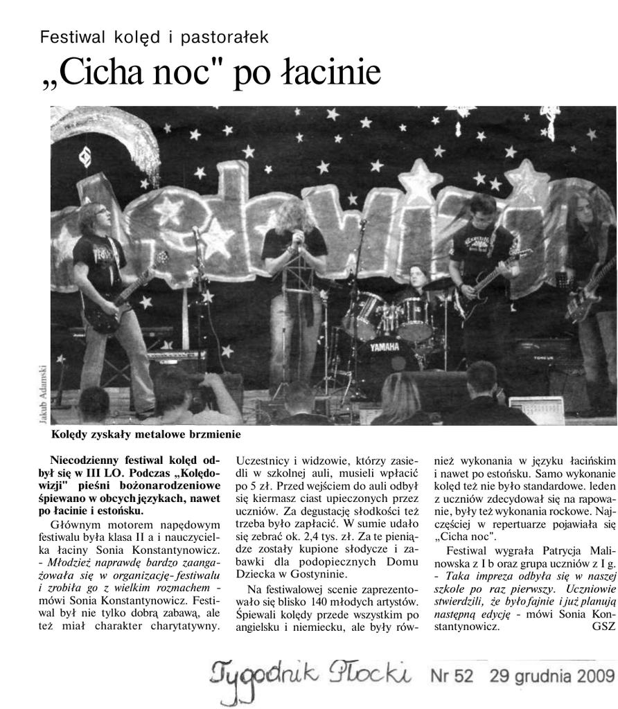Festiwal kolęd i pastorałek „Cicha noc" po łacinie Kolędy zyskały metalowe brzmienie Niecodzienny festiwal kolęd od był się w III LO. Podczas „Kolędowizji" pieśni bożonarodzeniowe śpiewano w obcych językach, nawet po łacinie i estońsku. Głównym motorem napędowym festiwalu była klasa II a i nauczyciel ka łaciny Sonia Konstantynowicz. - Młodzież naprawdę bardzo zaanga żowała się w organizację- festiwalu i zrobiła go z wielkim rozmachem mówi Sonia Konstantynowicz. Festi wal był nie tylko dobrą zabawą, ale też miał charakter charytatywny. Uczestnicy i widzowie, którzy zasie dli w szkolnej auli, musieli wpłacić po 5 zł. Przed wejściem do auli odbył się kiermasz ciast upieczonych przez uczniów. Za degustację słodkości też trzeba było zapłacić. W sumie udało się zebrać ok. 2,4 tys. zł. Za te pienią dze zostały kupione słodycze i za bawki dla podopiecznych Domu Dziecka w Gostyninie. Na festiwalowej scenie zaprezento wało się blisko 140 młodych artystów. Śpiewali kolędy przede wszystkim po angielsku i niemiecku, ale były rów nież wykonania w języku łacińskim i nawet po estońsku. Samo wykonanie kolęd też nie było standardowe. leden z uczniów zdecydował się na rapowa nie, były też wykonania rockowe. Naj częściej w repertuarze pojawiała się „Cicha noc". Festiwal wygrała Patrycja Mali nowska z I b oraz grupa uczniów z I g. - Taka impreza odbyła się w naszej szkole po raz pierwszy. Uczniowie stwierdzili, że było fajnie i już planują następną edycję - mówi Sonia Kon stantynowicz. GSZ