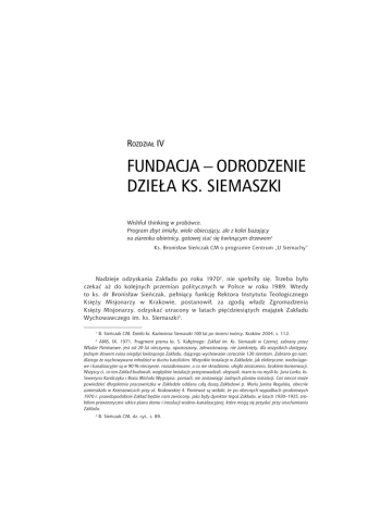 Rozdział IV. Fundacja – odrodzenie dzieła ks. Siemaszki 141 ROZDZIAŁ IV FUNDACJA – ODRODZENIE DZIEŁA KS. SIEMASZKI Wishful thinking w probówce. Program zbyt śmiały, wiele obiecujący, ale z kolei bazujący na ziarenku obietnicy, gotowej stać się kwitnącym drzewem1 Ks. Bronisław Sieńczak CM o programie Centrum „U Siemachy” Nadzieje odzyskania Zakładu po roku 19702, nie spełniły się. Trzeba było czekać aż do kolejnych przemian politycznych w Polsce w roku 1989. Wtedy to ks. dr Bronisław Sieńczak, pełniący funkcję Rektora Instytutu Teologicznego Księży Misjonarzy w Krakowie, postanowił, za zgodą władz Zgromadzenia Księży Misjonarzy, odzyskać utracony w latach pięćdziesiątych majątek Zakładu Wychowawczego im. ks. Siemaszki3. 1 B. Sieńczak CM, Dzieło ks. Kazimierza Siemaszki 100 lat po śmierci twórcy, Kraków 2004, s. 112. 2 AMS, IX. 1971. Fragment pisma ks. S. Kałężnego: Zakład im. Ks. Siemaszki w Czernej, zabrany przez Władze Państwowe, jest od 20 lat nieczynny, opustoszony, zdewastowany, nie zamknięty, dla wszystkich dostępny. Jednym słowem ruina niegdyś kwitnącego Zakładu, dającego wychowanie corocznie 130 sierotom. Zabrano go nam, dlatego że wychowywano młodzież w duchu katolickim. Wszystkie instalacje w Zakładzie, jak elektryczne, wodociągowe i kanalizacyjne są w 90 % nieczynne, rozszabrowane, a co nie skradziono, uległo zniszczeniu, brakiem konserwacji. Wszyscy ci, co ten Zakład budowali, względnie instalacje przeprowadzali, ulepszali, mam tu na myśli ks. Jana Lorka, ks. Seweryna Karolczyka i Brata Michała Węgrzyna, pomarli, nie zostawiając żadnych planów instalacji. Coś niecoś może powiedzieć długoletnia pracowniczka w Zakładzie oddana całą duszą Zakładowi p. Maria Janina Rogalska, obecnie zamieszkała w Krzeszowicach przy ul. Krakowskiej 4. Ponieważ są widoki, że po obecnych wypadkach grudniowych 1970 r. prawdopodobnie Zakład będzie nam zwrócony, jako były dyrektor tegoż Zakładu, w latach 1930–1935, zrobiłem prowizoryczne szkice planu domu i instalacji wodno–kanalizacyjnej, które mogą się przydać przy uruchamianiu Zakładu. 3 B. Sieńczak CM, dz. cyt., s. 89. 142 Jacek Tendej CM: Od ks. Kazimierza Siemaszki do „Radosnej Nowiny 2000” 1. Odzyskiwanie własności Zakładu 17 maja 1989 roku Sejm przyjął projekt Ustawy o stosunku Państwa do Kościoła Katolickiego w Rzeczypospolitej Polskiej4. Na jej mocy Kościół mógł, pod pewnymi warunkami, odzyskać majątek zajęty przez państwo niezgodnie z prawem. Ks. Bronisław Sieńczak, na wniosek Wizytatora Polskiej Prowincji Księży Misjonarzy ks. Stanisława Wypycha, przygotował wnioski rewindykacyjne do Komisji Majątkowej, powołanej do życia przez rząd PRL. Wnioski te, przygotowane przy współpracy z mecenasem Adamem Leszczyńskim, dotyczyły następujących nieruchomości w Krakowie: domu przy ul. Długiej 42, budynku szpitala im. G. Narutowicza przy ul. Prądnickiej 35, dwóch kamienic przy ul. Floriańskiej 55 i Placu Wszystkich Świętych 9 oraz zabudowań w Czernej k. Krzeszowic. 1.1 Budynek przy ul. Długiej Po zajęciu placówki przez władze komunistyczne 27 sierpnia 1954 roku5, w budynku tym znajdowało się Pogotowie Opiekuńcze, podległe krakowskim władzom oświatowym. Ks. Sieńczak udał się na rozmowę z zarządem Pogotowia Opiekuńczego i już wtedy stwierdził, że przede wszystkim trzeba odzyskać pierwszą siedzibę Zakładu – historyczny Dom ks. Siemaszki z figurą św. Józefa na podwórku, dom, w którym rozpoczęło się charytatywno -społeczne dzieło niesienia pomocy ubogim dzieciom i młodzieży. Z rozmowy tej wynikało, że odzyskanie tej własności może nastąpić w niedługim czasie, ponieważ dobiegała końca budowa nowej siedziby Pogotowia Opiekuńczego w Witkowicach. Okazało się jednak, że Kurator Wojewódzki był zaskoczony stanowczym oczekiwaniem szybkiego przejęcia budynku. Planował bowiem, że po wyprowadzeniu się Pogotowia w budynku na Długiej powstanie poradnia psychologiczna dla dzieci i młodzieży. Ks. Sieńczak pomyślał od razu o możliwości bezkonfliktowego przejęcia placówki wraz z przeznaczonymi do pracy w niej pracownikami i przekształcenia jej w dzieło inspirowane duchem i ideami ks. Siemaszki. W tym celu zorganizował spotkanie przyszłych pracowników poradni z księżmi Zgromadzenia, zainteresowanymi wskrzeszaniem dzieła ks. Siemaszki6. W naradzie uczestniczyli m.in. ks. Andrzej Augustyński, ks. Czesław Patoń i ks. Marcin Stasiowski. Ponieważ wystąpiły znaczne różnice zdań, co do wizji człowieka i stosowanych metod terapeutycznych [dlatego okazało się – przyp. J.T.], że współpraca jest niemożliwa, [postanowiono więc – przyp. J.T.] starać się o przejęcie zabudowań przy ul. Długiej7. Przedsięwzięcie zostało uwieńczone sukcesem i Dom ks. Siemaszki stał się siedzibą zarządu Fundacji jego imienia. 4 Dz.U.89.29.154. 5 AMS, III. 5b. s. 16. Opis realności przy ul. Długiej 42; A. Małysiak, Szukamy Boga. Wczoraj i dziś duszpasterza, Kraków 1992, s. 145. 6 B. Sieńczak CM, dz. cyt., s. 91–92. 7 Tamże, s. 92. Rozdział IV. Fundacja – odrodzenie dzieła ks. Siemaszki 143 1.2 Zabudowania w Czernej Nie zważając na to, że Prowincja Polska Zgromadzenia Księży Misjonarzy złożyła wniosek o odzyskanie nieruchomości do Komisji Majątkowej8, ówczesne władze lokalne rozpoczęły pośpiesznie realizację inwestycji Domu Opieki Społecznej. Prace przebiegały szybko, ponieważ Urząd Wojewódzki w Krakowie uzyskał środki finansowe na ten cel. Wobec zaistniałej sytuacji Wizytator Zgromadzenia Księży Misjonarzy podpisał z dyrektorem Urzędu Wojewódzkiego porozumienie, godząc się na kontynuowanie budowy pod warunkiem, że jeśli Komisja Majątkowa zwróci nam teren, nie będzie roszczeń ze strony Urzędu, w związku z poniesionymi nakładami na budowę Domu Opieki Społecznej9. Równocześnie w prasie lokalnej10 u
