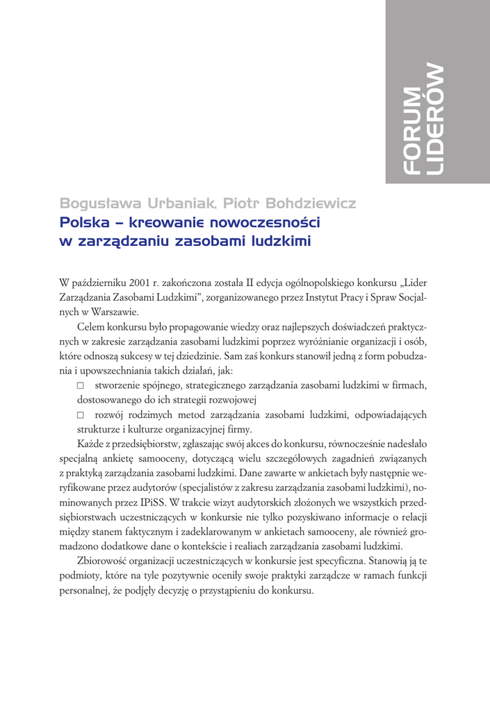 FORUM LIDERÓW Bogus³awa Urbaniak, Piotr Bohdziewicz Polska kreowanie nowoczesnoci w zarz¹dzaniu zasobami ludzkimi W padzierniku Forum liderów 2001 r. zakoñczona zosta³a II edycja ogólnopolskiego konkursu Lider Zarz¹dzania Zasobami Ludzkimi, zorganizowanego przez Instytut Pracy i Spraw Socjalnych w Warszawie. Celem konkursu by³o propagowanie wiedzy oraz najlepszych dowiadczeñ praktycznych w zakresie zarz¹dzania zasobami ludzkimi poprzez wyró¿nianie organizacji i osób, które odnosz¹ sukcesy w tej dziedzinie. Sam za konkurs stanowi³ jedn¹ z form pobudzania i upowszechniania takich dzia³añ, jak: c stworzenie spójnego, strategicznego zarz¹dzania zasobami ludzkimi w firmach, dostosowanego do ich strategii rozwojowej c rozwój rodzimych metod zarz¹dzania zasobami ludzkimi, odpowiadaj¹cych strukturze i kulturze organizacyjnej firmy. Ka¿de z przedsiêbiorstw, zg³aszaj¹c swój akces do konkursu, równoczenie nades³a³o specjaln¹ ankietê samooceny, dotycz¹c¹ wielu szczegó³owych zagadnieñ zwi¹zanych z praktyk¹ zarz¹dzania zasobami ludzkimi. Dane zawarte w ankietach by³y nastêpnie weryfikowane przez audytorów (specjalistów z zakresu zarz¹dzania zasobami ludzkimi), nominowanych przez IPiSS. W trakcie wizyt audytorskich z³o¿onych we wszystkich przedsiêbiorstwach uczestnicz¹cych w konkursie nie tylko pozyskiwano informacje o relacji miêdzy stanem faktycznym i zadeklarowanym w ankietach samooceny, ale równie¿ gromadzono dodatkowe dane o kontekcie i realiach zarz¹dzania zasobami ludzkimi. Zbiorowoæ organizacji uczestnicz¹cych w konkursie jest specyficzna. Stanowi¹ j¹ te podmioty, które na tyle pozytywnie oceni³y swoje praktyki zarz¹dcze w ramach funkcji personalnej, ¿e podjê³y decyzjê o przyst¹pieniu do konkursu. 70 Forum liderów Podstawowe informacje o zbiorowoci firm uczestnicz¹cych w badaniach W badaniach wziê³o udzia³ 59 firm z terenu ca³ego kraju. Najliczniej prezentowa³y siê przedsiêbiorstwa handlowe i oferuj¹ce us³ugi transportowo-komunikacyjne (36% badanych) oraz przemys³owe i budowlane (34% badanych). Sporód 41 firm reprezentuj¹cych te dwie kategorie prawie po³owa (19 firm) to spó³ki z pe³n¹ w³asnoci¹ kapita³u polskiego, który generalnie by³ najbardziej popularn¹ form¹ w³asnoci w ca³ej zbiorowoci 59 firm (46%). Pozosta³e firmy to w wiêkszoci spó³ki z udzia³em kapita³u zagranicznego (36% badanych). Przedsiêbiorstwa b¹d instytucje pañstwowe i samorz¹dowe stanowi³y najmniej liczn¹ zbiorowoæ sk³adaj¹c¹ siê z 11 firm, z których po³owa zajmowa³a siê us³ugami administracyjnymi i komunalnymi ( por. tab.1). Tabela 1. Struktura firm wed³ug rodzaju dzia³alnoci i formy w³asnoci Ogó³em firmy Firmy wed³ug rodzaju dzia³alnoci Firmy wed³ug formy w³asnoci Przemys³ Handel, i budow- transport nictwo i komunikacja Us³ugi badawcze, edukacyjne i konsultingowe Us³ugi administracyjne i komunalne Us³ugi liczba bankowe i finansowe % Spó³ki z pe³n¹ w³asnoci¹ kapita³u polskiego 9 10 4 1 3 27 45,8 Przedsiêbiorstwa/ instytucje pañstwowe i samorz¹dowe 2 2 2 5 11 18,6 Spó³ki z kapita³em zagranicznym 9 9 2 1 21 35,6 20 33,9 21 35,6 8 13,5 6 10,2 4 6,8 59 x 100,0 100,0 Ogó³em firmy: liczba % Zbiorowoæ firm uczestnicz¹cych w badaniach by³a zró¿nicowana równie¿ pod wzglêdem liczby zatrudnionych osób (w przeliczeniu na pe³ne etaty). Czêciej ni¿ co trzecia reprezentowa³a sektor ma³ych i rednich przedsiêbiorstw (MP), równie liczna by³a grupa przedsiêbiorstw du¿ych, zatrudniaj¹cych ponad 500 osób. Co czwarta firma reprezentowa³a grupê firm redniej wielkoci, w których pracuje od 251 do 500 osób. Forum liderów 71 Najwiêksze firmy bior¹ce udzia³ w badaniach, o zatrudnieniu przekraczaj¹cym 1000 osób, nale¿a³y do sekcji przemys³owo - budowlanej oraz transportowo - komunikacyjnej; jedna z nich reprezentowa³a us³ugi bankowe i finansowe. Analiza wielkoci firm w powi¹zaniu ze struktur¹ w³asnoci wskazuje, ¿e ponad po³owa firm z kapita³em obcym to du¿e przedsiêbiorstwa, zatrudniaj¹ce od 500 do 1000 i ponad 1000 pracowników. Tylko co trzecia reprezentowa³a sektor MP. Natomiast kapita³ polski reprezentowa³y generalnie firmy mniejsze, zaliczone do kategorii MP oraz do firm redniej wielkoci (78%). Diagnoza ogólna Z analiz wynika, ¿e wiêkszoæ firm uczestnicz¹cych w konkursie Lider Zarz¹dzania Zasobami Ludzkimi realizowa³a stosunkowo wysokie standardy zzl, precyzuj¹c w³asne strategie personalne (choæ nie zawsze nadaj¹c im kszta³t zapisu dokumentowego) oraz wkomponowuj¹c w ich ramy odpowiednie i systemowo potraktowane instrumentarium. W zasadzie wszystkie staraj¹ siê realizowaæ w swojej polityce personalnej model kapita³u ludzkiego. Natomiast w stosunku do poszczególnych podsystemów zzl wyniki analiz pozwalaj¹ na sformu³owanie nastêpuj¹cych diagnoz: c w polityce zatrudnienia firmy odwo³uj¹ siê g³ównie do wewnêtrznego rynku pracy, daj¹c mu wyrany prymat nad rynkiem zewnêtrznym; c firmy przywi¹zuj¹ du¿e znaczenie do procesu rekrutacji i selekcji pracowników; w praktyce dominuj¹ og³oszenia wewnêtrzne i prasowe, za w procedurach selekcyjnych wykorzystywane jest na ogó³ rozbudowane i urozmaicone instrumentarium; c wszystkie firmy traktuj¹ priorytetowo szkolenia pracownicze, uznaj¹c je za wa¿ny obszar zzl; wystêpuje przy tym du¿a rozmaitoæ i intensywnoæ szkoleñ, w zdecydowanej wiêkszoci zewnêtrznych; tylko w najmniejszych, kilkunastoosobowych firmach przewagê maj¹ szkolenia on the job; c w procesach rozpoznawania potrzeb szkoleniowych firmy wykorzystuj¹ najczêciej metodykê tradycyjn¹ (odwo³ywanie siê do opinii bezporednich prze³o¿onych), rzadko siêgaj¹c do metod innego typu; c szacowanie efektywnoci dzia³añ szkoleniowych ogranicza siê zazwyczaj do formu³owania ocen odnosz¹cych siê do bezporednich reakcji, b¹d do uzyskanej w toku szkolenia wiedzy, natomiast oceny efektów pracy w wymiarze indywidualnym lub