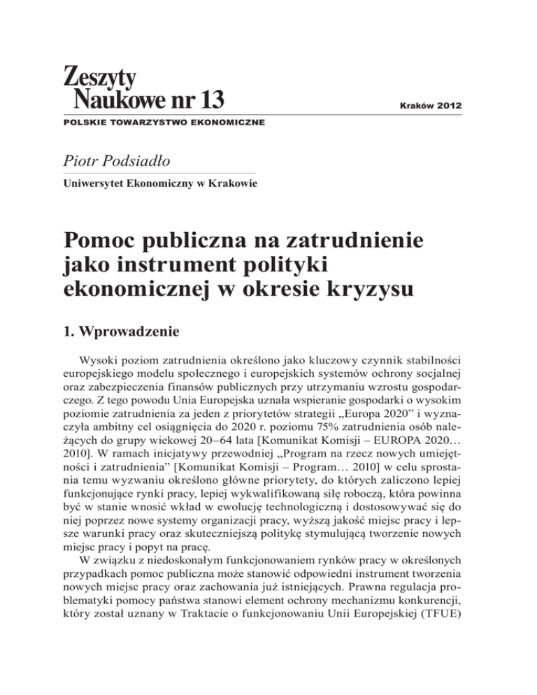 Zeszyty Naukowe nr 13 Kraków 2012 POLSKIE TOWARZYSTWO EKONOMICZNE Piotr Podsiadło Uniwersytet Ekonomiczny w Krakowie Pomoc publiczna na zatrudnienie jako instrument polityki ekonomicznej w okresie kryzysu 1. Wprowadzenie Wysoki poziom zatrudnienia określono jako kluczowy czynnik stabilności europejskiego modelu społecznego i europejskich systemów ochrony socjalnej oraz zabezpieczenia finansów publicznych przy utrzymaniu wzrostu gospodarczego. Z tego powodu Unia Europejska uznała wspieranie gospodarki o wysokim poziomie zatrudnienia za jeden z priorytetów strategii „Europa 2020” i wyznaczyła ambitny cel osiągnięcia do 2020 r. poziomu 75% zatrudnienia osób należących do grupy wiekowej 20–64 lata [Komunikat Komisji – EUROPA 2020… 2010]. W ramach inicjatywy przewodniej „Program na rzecz nowych umiejętności i zatrudnienia” [Komunikat Komisji – Program… 2010] w celu sprostania temu wyzwaniu określono główne priorytety, do których zaliczono lepiej funkcjonujące rynki pracy, lepiej wykwalifikowaną siłę roboczą, która powinna być w stanie wnosić wkład w ewolucję technologiczną i dostosowywać się do niej poprzez nowe systemy organizacji pracy, wyższą jakość miejsc pracy i lepsze warunki pracy oraz skuteczniejszą politykę stymulującą tworzenie nowych miejsc pracy i popyt na pracę. W związku z niedoskonałym funkcjonowaniem rynków pracy w określonych przypadkach pomoc publiczna może stanowić odpowiedni instrument tworzenia nowych miejsc pracy oraz zachowania już istniejących. Prawna regulacja problematyki pomocy państwa stanowi element ochrony mechanizmu konkurencji, który został uznany w Traktacie o funkcjonowaniu Unii Europejskiej (TFUE) 54 Piotr Podsiadło [2010] za jedno z podstawowych narzędzi realizacji wytyczonych w nim zadań. Z uwagi na zasadniczy kontekst udzielania pomocy publicznej wyróżnić można trzy główne kategorie pomocy, która może zostać uznana za dozwoloną na mocy art. 107 ust. 3 TFUE [Oldale i Piffaut 2009, s. 14–16]. Pomoc sektorowa jest adresowana wyłącznie do przedsiębiorstw działających w określonym sektorze gospodarki. Pomoc regionalną wyróżnia jej odniesienie terytorialne i to, że udzielana jest przedsiębiorstwom prowadzącym działalność na obszarze charakteryzującym się relatywnie niskim poziomem rozwoju gospodarczego. Natomiast dopuszczalność pomocy horyzontalnej nie jest uzależniona od obszaru objętego tego typu pomocą, lecz od celów, jakie mają zostać osiągnięte w wyniku jej udzielenia. Pomoc horyzontalna udzielana jest również bez względu na sektor gospodarki, do którego należy beneficjent pomocy, co oznacza, że wszystkie przedsiębiorstwa prowadzące działalność w różnych branżach mają równe prawo ubiegać się o pomoc państwa. Pomoc ta może zostać uznana za zgodną z rynkiem wewnętrznym, gdy jest ona udzielana z przeznaczeniem na realizację sześciu celów, tj. na rozwój małych i średnich przedsiębiorstw, badania i rozwój, ochronę środowiska, zatrudnienie, szkolenia oraz ratowanie i restrukturyzację przedsiębiorstw znajdujących się w trudnej sytuacji. Celem artykułu jest przedstawienie warunków dopuszczalności horyzontalnej pomocy publicznej przeznaczonej na zatrudnienie. Analiza udzielanej przez państwa członkowskie Unii Europejskiej horyzontalnej pomocy publicznej na zatrudnienie ma prowadzić do weryfikacji tezy, że w związku ze skutkami kryzysu finansowego i gospodarczego dla realnej gospodarki, wartość tej pomocy w ostatnich kilku latach zdecydowanie wzrosła. 2. Wyłączenia grupowe dla pomocy publicznej na zatrudnienie 2.1. Rozporządzenie BER w zakresie pomocy na zatrudnienie Pomoc horyzontalna, która ukierunkowana jest na rozwiązywanie problemów występujących w różnych branżach lub regionach, jest bardziej preferowana przez Komisję i współcześnie rzeczywiście przeważa nad innymi kategoriami pomocy. Zdecydowana większość horyzontalnych środków pomocy może być udzielana na uproszczonych zasadach, według których określone grupy pomocy są zgodne z regułami jednolitego rynku europejskiego i podlegają wyłączeniu z obowiązku zgłoszenia planowanej pomocy do Komisji celem jej zatwierdzenia. Zasady te określane są mianem wyłączeń grupowych. Pomoc publiczna na zatrudnienie... 55 Pierwszą unijną regulacją wyłączeń grupowych w ramach pomocy publicznej było rozporządzenie Rady z 1998 r. dotyczące stosowania art. 92 i 93 Traktatu ustanawiającego Wspólnotę Europejską dla niektórych kategorii horyzontalnej pomocy państwa (tzw. rozporządzenie kompetencyjne) (Dz.Urz. WE L142/1 z 14.05.1998 r.), które upoważniało Komisję Europejską do wydawania rozporządzeń wyłączających (tzw. rozporządzenia BERs), stwierdzających, że określone grupy pomocy są zgodne z rynkiem wewnętrznym i nie wymagają zgłoszenia notyfikacyjnego, o którym mówi art. 108 ust. 3 Traktatu. Rozporządzenie to zawierało wyczerpującą listę grup pomocy horyzontalnej podlegającej wyłączeniu oraz wyznaczało Komisji obowiązkowe i fakultatywne elementy każdego wyłączenia. Wyłączenia grupowe zostały ustanowione dla pomocy na rzecz małych i średnich przedsiębiorstw, badań i rozwoju, ochrony środowiska, zatrudnienia i szkolenia, a także dla pomocy zgodnej z mapą zatwierdzoną przez Komisję dla każdego państwa członkowskiego w zakresie udzielania pomocy regionalnej [Quigley 2009, s. 185–186]. W obowiązującym do 2008 r. rozporządzeniu BER dotyczącym pomocy publicznej na zatrudnienie (Dz.Urz. WE L 337 z 13.12.2002 r.) wyłączeniu spod obowiązku notyfikacji podlegała każda pomoc nieprzekraczająca 15 mln euro przez okres trzech lat. W przypadkach gdy nowe miejsca pracy tworzone były na obszarach lub w sektorach, które w momencie przyznawania pomocy nie kwalifikowały się do przyznania pomocy regionalnej, intensywność pomocy nie mogła przekroczyć 15% kosztów dla małych