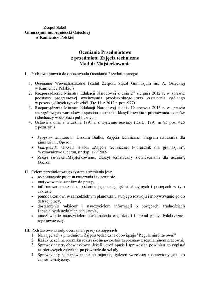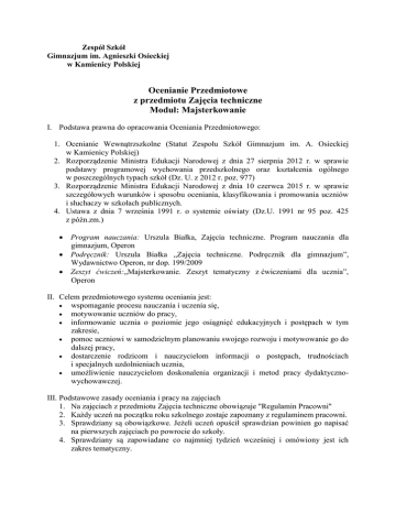 Zespół Szkół Gimnazjum im. Agnieszki Osieckiej w Kamienicy Polskiej Ocenianie Przedmiotowe z przedmiotu Zajęcia techniczne Moduł: Majsterkowanie I. Podstawa prawna do opracowania Oceniania Przedmiotowego: 1. Ocenianie Wewnątrzszkolne (Statut Zespołu Szkół Gimnazjum im. A. Osieckiej w Kamienicy Polskiej) 2. Rozporządzenie Ministra Edukacji Narodowej z dnia 27 sierpnia 2012 r. w sprawie podstawy programowej wychowania przedszkolnego oraz kształcenia ogólnego w poszczególnych typach szkół (Dz. U. z 2012 r. poz. 977) 3. Rozporządzenie Ministra Edukacji Narodowej z dnia 10 czerwca 2015 r. w sprawie szczegółowych warunków i sposobu oceniania, klasyfikowania i promowania uczniów i słuchaczy w szkołach publicznych. 4. Ustawa z dnia 7 września 1991 r. o systemie oświaty (Dz.U. 1991 nr 95 poz. 425 z późn.zm.) Program nauczania: Urszula Białka, Zajęcia techniczne. Program nauczania dla gimnazjum, Operon Podręcznik: Urszula Białka „Zajęcia techniczne. Podręcznik dla gimnazjum”, Wydawnictwo Operon, nr dop. 199/2009 Zeszyt ćwiczeń:„Majsterkowanie. Zeszyt tematyczny z ćwiczeniami dla ucznia”, Operon II. Celem przedmiotowego systemu oceniania jest: wspomaganie procesu nauczania i uczenia się, motywowanie uczniów do pracy, informowanie ucznia o poziomie jego osiągnięć edukacyjnych i postępach w tym zakresie, pomoc uczniowi w samodzielnym planowaniu swojego rozwoju i motywowanie go do dalszej pracy, dostarczenie rodzicom i nauczycielom informacji o postępach, trudnościach i specjalnych uzdolnieniach ucznia, umożliwienie nauczycielom doskonalenia organizacji i metod pracy dydaktycznowychowawczej. III. Podstawowe zasady oceniania i pracy na zajęciach 1. Na zajęciach z przedmiotu Zajęcia techniczne obowiązuje "Regulamin Pracowni" 2. Każdy uczeń na początku roku szkolnego zostaje zapoznany z regulaminem pracowni. 3. Sprawdziany są obowiązkowe. Jeżeli uczeń opuścił sprawdzian powinien go napisać na pierwszych zajęciach po powrocie do szkoły. 4. Sprawdziany są zapowiadane co najmniej tydzień wcześniej i omówiony jest ich zakres tematyczny. Przedmiotowy System Oceniania z przedmiotu Zajęcia techniczne 5. Stopień ze sprawdzianu lub inny stopień uczeń może poprawić. Poprawa jest dobrowolna, odbywa się w ciągu dwóch tygodni od dnia otrzymania stopnia. Można poprawić dwie oceny cząstkowe. 6. Uczeń po dłuższej niż tydzień nieobecności w szkole może nie być oceniany, jeżeli nieobecność związana była z chorobą lub innymi sytuacjami losowymi, które go usprawiedliwiają. 7. Dwa razy w ciągu semestru uczeń może zgłosić nieprzygotowanie do lekcji (brak zeszytu, brak pracy domowej) bez obawy otrzymania oceny niedostatecznej, z wyjątkiem zapowiadanych wcześniej prac pisemnych. Nieprzygotowanie do zajęć zgłasza uczeń po sprawdzeniu listy obecności. 8. Uczeń mający kłopoty z opanowaniem materiału może zwrócić się do nauczyciela w celu ustalenia formy wyrównania braków lub pokonania trudności. 9. Oceny wystawiane przez nauczyciela są jawne i uzasadniane. 10. Na prośbę ucznia otrzymane przez niego oceny będą wpisywane przez nauczyciela do dzienniczka lub zeszytu przedmiotowego. 11. Uczeń ma obowiązek prowadzenia zeszytu przedmiotowego, w którym powinny znajdować się zapisy tematów, notatki, zapisy poleceń ustnych lub pisemnych prac domowych. Zeszyt prowadzony jest systematycznie przez ucznia. W przypadku nieobecności ucznia w szkole, zeszyt przedmiotowy oraz zeszyt ćwiczeń musi być uzupełniony. 12. Uczeń w ciągu semestru powinien uzyskać co najmniej cztery oceny cząstkowe. 13. Przy wystawianiu ocen semestralnej i końcoworocznej największe znaczenie mają prace wytwórcze oraz oceny ze sprawdzianów. IV. Informowanie uczniów i rodziców o wymaganiach i postępach 1. Na prośbę rodziców nauczyciel udziela im ustnej informacji o ocenach ucznia; w sytuacjach szczególnych może to być informacja pisemna. 2. Wymagania z przedmiotu w zakresie wiadomości i umiejętności są uczniom przedstawiane na początku roku szkolnego na zajęciach organizacyjnych oraz są do wglądu u nauczyciela przedmiotu. 3. Każda ocena jaką otrzymuje uczeń jest jawna i uzasadniana. 4. Oceny zdobywane przez uczniów są odnotowywane na bieżąco w dzienniku lekcyjnym oraz mogą być wpisane do zeszytu przedmiotowego na prośbę uczniów. 5. O przewidywanej ocenie semestralnej (rocznej) innej niż niedostateczna uczeń zostaje poinformowany na trzy tygodnie przed klasyfikacyjnym posiedzeniem rady pedagogicznej. W przypadku oceny niedostatecznej taka informacja jest przekazywana na 4 tygodnie przed tym posiedzeniem rady. 6. Prace pisemne uczeń otrzymuje do wglądu na lekcji, a rodzice w kontaktach indywidualnych (Dzień otwartych drzwi szkoły, konsultacje indywidulane). 7. Prace klasowe i pisemne są przechowywane przez nauczyciela do końca roku szkolnego, a następnie niszczone lub oddawane zainteresowanym uczniom. 8. Prace wytwórcze (albumy, projekty, prezentacje, opracowania) są gromadzone jako pomoce dydaktyczne i wykorzystywane do realizacji programu nauczania na lekcjach. V. A. Obszary aktywności ucznia 1. Prace wytwórcze 2. Odpowiedzi ucznia 3. Prace pisemne: sprawdziany, kartkówki. 4. Zeszyt przedmiotowy oraz zeszyt ćwiczeń 5. Prace domowe (ustne, pisemne) 2 Przedmiotowy System Oceniania z przedmiotu Zajęcia techniczne 6. Prace długoterminowe (referaty, albumy, pomoce dydaktyczne, projekty) 7. Aktywność na lekcji 8. Aktywność dodatkowa V. B. Kryteria według których oceniane są poszczególne obszary aktywności 1. Prace wytwórcze Bierze się pod uwagę precyzyjność wykonania oraz wkład i zaangażowanie w sposobie realizacji postawionego zadania wytwórczego, a także poprawność merytoryczną, estetykę. 2. Odpowiedzi ustne oceniany jest poziom prezentowanych wiadomości, stosowanie poprawnej terminologii technicznej, oceniana jest zawartość rzeczowa, umiejętność formułowan