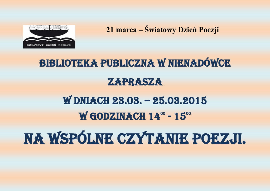 21 marca – Światowy Dzień Poezji Biblioteka Publiczna w Nienadówce Zaprasza w dniach 23.03. – 25.03.2015 w godzinach 14 - 15 00 00 Na wspólne czytanie poezji.