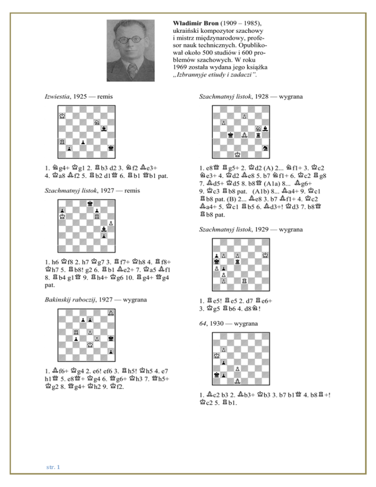 Władimir Bron (1909 – 1985), ukraiński kompozytor szachowy i mistrz międzynarodowy, profesor nauk technicznych. Opublikował około 500 studiów i 600 problemów szachowych. W roku 1969 została wydana jego książka „Izbrannyje etiudy i zadaczi”. Izwiestia, 1925 — remis )........*! !0 , , , ,]! 0L , , , ]! !0 , , I ,]! 0, , , O ]! !0 , , , ,]! 0S ,p, , ]! !0 P , , M]! 0, , , , ]! !\````````^! 1. ig4+ lg1 2. sb3 d2 3. if2 ce3+ 4. la8 cf2 5. sb2 d1r 6. sb1 rb1 pat. Szachmatnyj listok, 1927 — remis )........*! !0 , ,m, ,]! 0P , ,p, ]! !0l, , S ,]! 0, , , ,q]! !0 , , ,o,]! 0, , , P ]! !0 , , , ,]! 0, , , , ]! !\````````^! 1. h6 lf8 2. h7 lg7 3. sf7+ lh8 4. sf8+ lh7 5. sb8! g2 6. sb1 ce2+ 7. la5 cf1 8. sb4 g1r 9. sh4+ lg6 10. sg4+ rg4 pat. Bakinskij raboczij, 1927 — wygrana )........*! !0 , , , C]! 0, ,pP , ]! !0 , , , ,]! 0, S Q , ]! !0 ,p, Q M]! 0, , L , ]! !0 , , , P]! 0, , , , ]! !\````````^! 1. cf6+ lg4 2. e6! ef6 3. sh5! lh5 4. e7 h1r 5. e8r+ lg4 6. rg6+ lh3 7. rh5+ lg2 8. rg4+ lh2 9. lf2. str. 1 Szachmatnyj listok, 1928 — wygrana )........*! !0 , , , ,]! 0, , Q , ]! !0 Q , , ,]! 0, , , Io]! !0 ,m,c,u,]! 0, , , , ]! !0 , , , K]! 0, ,l, , ]! !\````````^! 1. e8r sg5+ 2. ld2 (A) 2... if1+ 3. lc2 ie3+ 4. ld2 ce8 5. b7 if1+ 6. lc2 sg8 7. cd5+ ld5 8. b8r (A1a) 8... cg6+ 9. lc3 sb8 pat. (A1b) 8... ca4+ 9. lc1 sb8 pat. (B) 2... ce8 3. b7 cf1+ 4. lc2 ca4+ 5. lc1 sb5 6. cd3+! ld3 7. b8r sb8 pat. Szachmatnyj listok, 1929 — wygrana )........*! !0 , , , ,]! 0, , , , ]! !0pQ Q , L]! 0M ,u, , ]! !0qP , , ,]! 0,q, , , ]! !0 Q ,s, ,]! 0, , , , ]! !\````````^! 1. se5! se5 2. d7 se6+ 3. lg5 sb6 4. d8i! 64, 1930 — wygrana )........*! !0 , , , ,]! 0, , , , ]! !0 Q , , ,]! 0L , , , ]! !0 P , , ,]! 0, ,q, , ]! !0mP , , ,]! 0, ,c, , ]! !\````````^! 1. cc2 b3 2. cb3+ lb3 3. b7 b1r 4. b8s+! lc2 5. sb1. Szachmatnyj listok, 1930 — wygrana )........*! !0 , , I ,]! 0, , , , ]! !0 ,u, Q ,]! 0, I , M ]! !0 , , , ,]! 0, , ,q, ]! !0 ,l, , ,]! 0, , , , ]! !\````````^! 1. f7 sc5+ 2. ld3 sf5 3. ie6+ lh4 4. f8s! Trud, 1950 — remis )........*! !0 ,k, ,l,]! 0, , , , ]! !0 Q ,u,m,]! 0,c, , , ]! !0 , , , ,]! 0, , , , ]! !0 , , , ,]! 0, , , , ]! !\````````^! 1. b7 ie7+ 2. lf8 sb6 3. b8r! sb8+ 4. ce8+ lf6 pat. Wieczernaja Moskwa, 1930 — wygrana )........*! !0 , , , ,]! 0, P , Qp]! !0 ,p, ,mQ]! 0, P , , ]! !0 ,l,q,x,]! 0, , , , ]! !0 , , ,q,]! 0, , , , ]! !\````````^! 1. g8s+! lh5 2. sg4 lg4 3. g3 lg3 4. e5 lf4 5. e6 le5 6. e7 ld6 7. e8s! 3. ce8+? lf6 4. b8r ig6+ 5. cg6 sb8+. Szachmaty w SSSR, 1933 — wygrana )........*! !0 , , , ,]! 0, , ,u, ]! !0 , , , Q]! 0, Sq, , ]! !0 , , ,m,]! 0, , , ,p]! !0 , , , ,]! 0, , , ,l]! !\````````^! 1. d6 sf1+ 2. lh2 sf2+ 3. lg1 h2+ 4. lh1 sf1+ 5. lh2 sf6 6. sc4+ lg5 7. d7 sh6+ 8. lg3 sd6 9. sc5+ lf6 10. sc6! Szachmaty w SSSR, 1948 — wygrana )........*! !0 , , , ,]! 0, Qm, , ]! !0 , ,i, ,]! 0, , , , ]! !0 , , , ,]! 0, , ,pC ]! !0 L O , ,]! 0, , , , ]! !\````````^! 1. ic5+ lc8 2. ie4 cb4 3. lb3 (A) 3... cf8 4. lc4 lb7 5. ld4 cb4 6. le3 cf8 7. lf3. (B) 3... f2 4. cf2 ca5 5. id6+ lc7 6. ic4. str. 2 Szachmaty w SSSR, 1954 — remis )........*! !0 , , ,m,]! 0, , ,p, ]! !0 ,i, ,pC]! 0, , , I ]! !0 , , P L]! 0, , , , ]! !0 , , , P]! 0, , , , ]! !\````````^! 1. ie7+ lh8 2. if7+ lh7 3. ig5+! lh6 4. if5+! gf5 5. ih3 h1r pat. Šachové umění, 1980 — remis )........*! !0 , , , ,]! 0, , , , ]! !0 , , , U]! 0, ,s, , ]! !0 P , , ,]! 0Xc,p,m,q]! !0r,o, Q L]! 0, , , , ]! !\````````^! 1. sd3+ cd3 2. rd2 sh3+ 3. lh3 (A) 3... cf5+ 4. lh2 rb3 5. rd1+ rd1 pat. (B) 3... cf1+ 4. lh4 rb3 5. rd5+ rd5 pat.