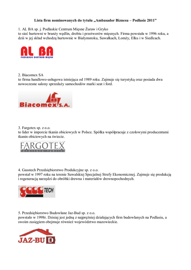 Lista firm nominowanych do tytu u „Ambasador Biznesu – Podlasie 2011” 1. AL BA sp. j. Podlaskie Centrum Mi sne uraw i Gryko to sie hurtowni w bran y w dlin, drobiu i przetworów mi snych. Firma powsta a w 1996 roku, a dzi w jej sk ad wchodz hurtownie w Bia ymstoku, Suwa kach, om y, E ku i w Siedlcach. 2. Biacomex SA to firma handlowo-us ugowa istniej ca od 1989 roku. Zajmuje si turystyk oraz posiada dwa nowoczesne salony sprzeda y samochodów marki seat i ford. 3. Fargotex sp. z o.o. to lider w imporcie tkanin obiciowych w Polsce. Spó ka wspó pracuje z czo owymi producentami tkanin obiciowych na wiecie. 4. Gasstech Przedsi biorstwo Produkcyjne sp. z o.o. powsta w 1997 roku na terenie Suwalskiej Specjalnej Strefy Ekonomicznej. Zajmuje si produkcj i regeneracj narz dzi do obróbki drewna i materia ów drewnopochodnych. 5. Przedsi biorstwo Budowlane Jaz-Bud sp. z o.o. powsta o w 1998r. Dzisiaj jest jedn z najpr niej dzia aj cych firm budowlanych na Podlasiu, a swoim zasi giem obejmuje równie województwo mazowieckie. 6. PPUH Kombinat Budowlany sp. z o.o. jest deweloperem, generalnym wykonawc inwestycji budowlanych budownictwa mieszkaniowego i u yteczno ci publicznej. 7. Nasycalnia Podk adów sp. z o.o. w Czeremsze to firma z ponad 70 letni tradycj , jedn z najstarszych w regionie. Obecnie jest najwi kszym producentem i dostawc drewnianej nawierzchni kolejowej w Polsce. 8. Okr gowa Spó dzielnia Mleczarska w Hajnówce wyroby tej firmy znalaz y uznanie w ród klientów Czech, W gier, Rosji, Holandii, Niemiec, och, a nawet Algierii. 9. Promotech sp. z o.o. to jedna z najbardziej innowacyjnych firm w Polsce, dzia aj ca na wiatowym rynku w bran y elektronarz dzi. 10. PP-U-H Rodex sp. z o.o. od lat jest producentem najwy szej jako ci stolarki PCV, aluminiowej, przeciwpo arowej. 11. „Spo em” Augustowska Spó dzielnia Spo ywców jest firm , która najd Augustowie. ej, bo ponad 60 lat, nieprzerwanie prowadzi dzia alno gospodarcz w 12. Spó dzielnia Mleczarska w apach Jej produkty docieraj do tak odleg ych krajów jak: Algieria, Arabia Saudyjska, Nigeria, RPA, Senegal, Wyspy Kanaryjskie, Mauretania, Meksyk, Kuba, Brazylia czy Kazachstan i z tego tytu u firma nale y do najwi kszych polskich eksporterów produktów mleczarskich. 13. TAG sp. j. Ma gorzata Cemer, Albert Cemer jest bia ostock hurtowni warzyw i owoców.