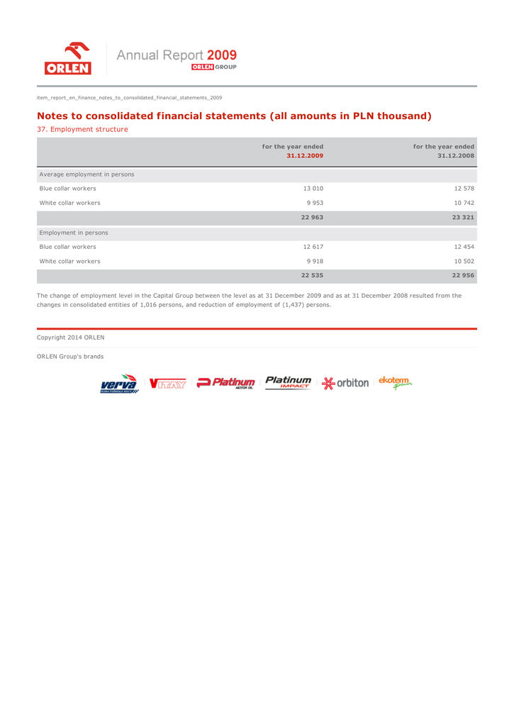 item_report_en_finance_notes_to_consolidated_financial_statements_2009 Notes to consolidated financial statements (all amounts in PLN thousand) 37. Employment structure for the year ended for the year ended 31.12.2009 31.12.2008 13 010 12 578 9 953 10 742 22 963 23 321 12 617 12 454 9 918 10 502 22 535 22 956 Average employment in persons Blue collar workers White collar workers Employment in persons Blue collar workers White collar workers The change of employment level in the Capital Group between the level as at 31 December 2009 and as at 31 December 2008 resulted from the changes in consolidated entities of 1,016 persons, and reduction of employment of (1,437) persons. Copyright 2014 ORLEN ORLEN Group's brands