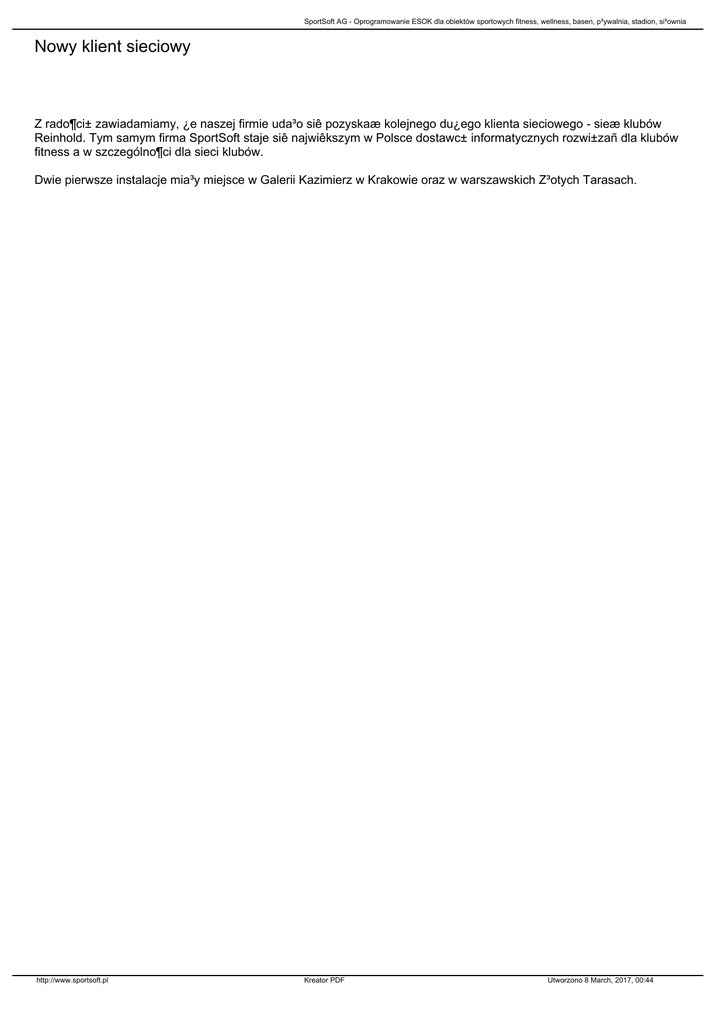 SportSoft AG - Oprogramowanie ESOK dla obiektów sportowych fitness, wellness, basen, p³ywalnia, stadion, si³ownia Nowy klient sieciowy Z rado¶ci± zawiadamiamy, ¿e naszej firmie uda³o siê pozyskaæ kolejnego du¿ego klienta sieciowego - sieæ klubów Reinhold. Tym samym firma SportSoft staje siê najwiêkszym w Polsce dostawc± informatycznych rozwi±zañ dla klubów fitness a w szczególno¶ci dla sieci klubów. Dwie pierwsze instalacje mia³y miejsce w Galerii Kazimierz w Krakowie oraz w warszawskich Z³otych Tarasach. http://www.sportsoft.pl Kreator PDF Utworzono 8 March, 2017, 00:44