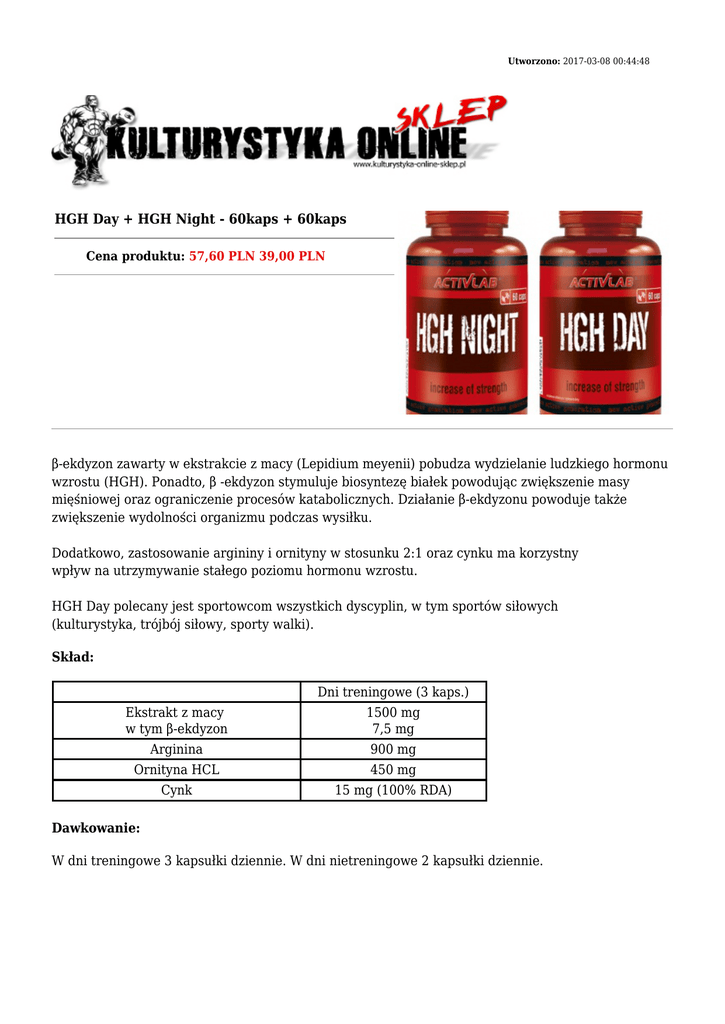 Utworzono: 2017-03-08 00:44:48 HGH Day + HGH Night - 60kaps + 60kaps Cena produktu: 57,60 PLN 39,00 PLN β-ekdyzon zawarty w ekstrakcie z macy (Lepidium meyenii) pobudza wydzielanie ludzkiego hormonu wzrostu (HGH). Ponadto, β -ekdyzon stymuluje biosyntezę białek powodując zwiększenie masy mięśniowej oraz ograniczenie procesów katabolicznych. Działanie β-ekdyzonu powoduje także zwiększenie wydolności organizmu podczas wysiłku. Dodatkowo, zastosowanie argininy i ornityny w stosunku 2:1 oraz cynku ma korzystny wpływ na utrzymywanie stałego poziomu hormonu wzrostu. HGH Day polecany jest sportowcom wszystkich dyscyplin, w tym sportów siłowych (kulturystyka, trójbój siłowy, sporty walki). Skład: Dni treningowe (3 kaps.) Ekstrakt z macy w tym β-ekdyzon 1500 mg 7,5 mg Arginina 900 mg Ornityna HCL 450 mg Cynk 15 mg (100% RDA) Dawkowanie: W dni treningowe 3 kapsułki dziennie. W dni nietreningowe 2 kapsułki dziennie. HGH Night - 60 kaps. Activita HGH Night to kompleksowa formuła opracowana w celu podniesienia poziomu naturalnego poziomu hormonu wzrostu, który bezkonkurencyjnie wpływa na najważniejsze aspekty związane z treningiem kulturystycznym: Wzrost czystej masy mięśniowej: powoduje hipertrofię oraz hiperplazję – wzrost objętości oraz liczby komórek mięśniowych, potęguje transport wolnych aminokwasów do wnętrza komórek, nasila syntezę białek. Redukcja tkanki tłuszczowej: powoduje rozpad nagromadzonych komórek tłuszczowych zwiększając poziom wolnych kwasów tłuszczowych w osoczu, nasila wykorzystanie tłuszczu jako źródła energii, hamuje syntezę tłuszczu. Trening i regeneracja: wzmacnia i regeneruję tkanki łączne, ścięgna i chrząstki powodując wzrost siły i zwiększenie możliwości wysiłkowych organizmu, dzięki działaniu regulującemu sen wspomaga odpoczynek i regenerację powysiłkową powodując zwiększenie energii potrzebnej do działania. ActivLab HGH Night polecany jest osobom trenującym rekreacyjnie i wyczynowo wszystkie dyscypliny sportu, ze szczególnym uwzględnieniem sportów siłowych. Skład: Wartość energetyczna 1,8kJ / 0,43kcal Białko 0,0 g Tłuszcz 0,0 g Węglowodany 0,1 g GABA (kwas gamma-aminomasłowy) 240 mg Pyroglutaminian argininy 390 mg Chlorowodorek lizyny 240 mg Dawkowanie: Zalecana dzienna porcja w dni treningowe 3 kapsułki, w dni nietreningowe 2 kapsułki. Przyjmować na noc przed snem. Adres: http://www.ko.sklep.pl/ Telefon: kom. 782 010 880 Email: [email protected]