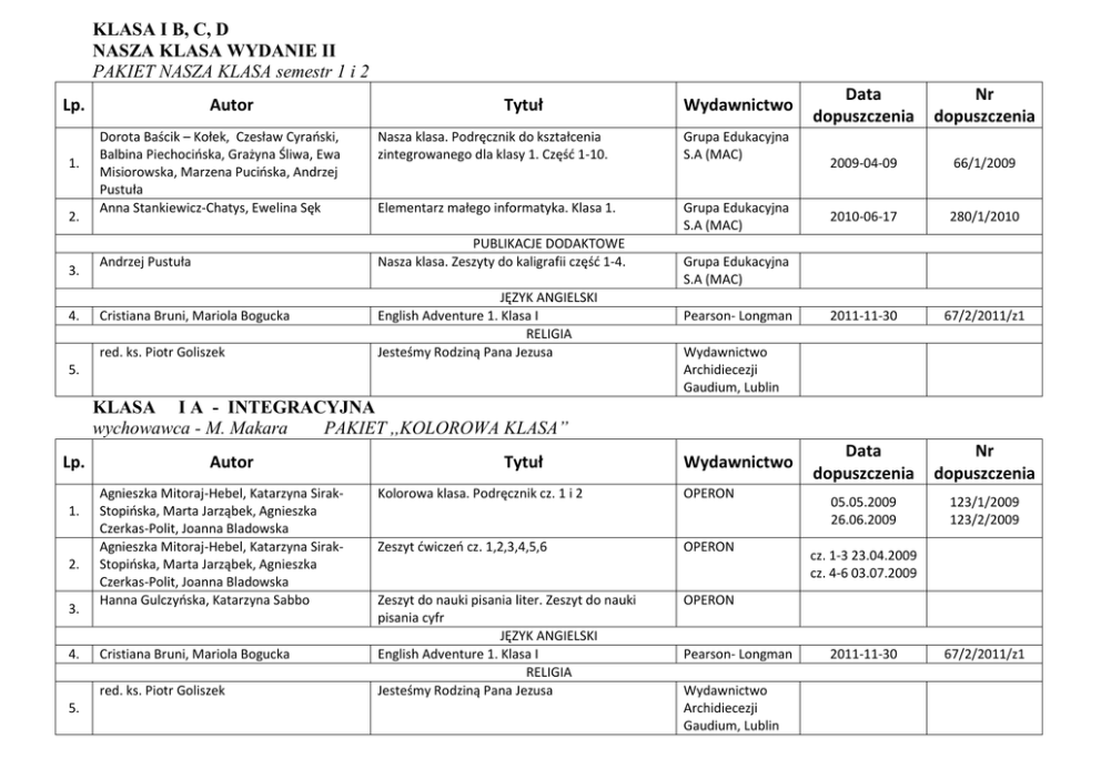 KLASA I B, C, D NASZA KLASA WYDANIE II PAKIET NASZA KLASA semestr 1 i 2 Lp. 1. 2. 3. 4. Autor Dorota Baścik – Kołek, Czesław Cyrański, Balbina Piechocińska, Grażyna Śliwa, Ewa Misiorowska, Marzena Pucińska, Andrzej Pustuła Anna Stankiewicz-Chatys, Ewelina Sęk Tytuł Nasza klasa. Podręcznik do kształcenia zintegrowanego dla klasy 1. Część 1-10. Grupa Edukacyjna S.A (MAC) Elementarz małego informatyka. Klasa 1. Grupa Edukacyjna S.A (MAC) PUBLIKACJE DODAKTOWE Nasza klasa. Zeszyty do kaligrafii część 1-4. Andrzej Pustuła Cristiana Bruni, Mariola Bogucka red. ks. Piotr Goliszek Wydawnictwo JĘZYK ANGIELSKI English Adventure 1. Klasa I RELIGIA Jesteśmy Rodziną Pana Jezusa 5. Data dopuszczenia Nr dopuszczenia 2009-04-09 66/1/2009 2010-06-17 280/1/2010 2011-11-30 67/2/2011/z1 Data dopuszczenia Nr dopuszczenia 05.05.2009 26.06.2009 123/1/2009 123/2/2009 Grupa Edukacyjna S.A (MAC) Pearson- Longman Wydawnictwo Archidiecezji Gaudium, Lublin KLASA I A - INTEGRACYJNA wychowawca - M. Makara PAKIET ,,KOLOROWA KLASA” Lp. 1. 2. 3. 4. Autor Agnieszka Mitoraj-Hebel, Katarzyna SirakStopińska, Marta Jarząbek, Agnieszka Czerkas-Polit, Joanna Bladowska Agnieszka Mitoraj-Hebel, Katarzyna SirakStopińska, Marta Jarząbek, Agnieszka Czerkas-Polit, Joanna Bladowska Hanna Gulczyńska, Katarzyna Sabbo Cristiana Bruni, Mariola Bogucka red. ks. Piotr Goliszek 5. Tytuł Wydawnictwo Kolorowa klasa. Podręcznik cz. 1 i 2 OPERON Zeszyt ćwiczeń cz. 1,2,3,4,5,6 OPERON Zeszyt do nauki pisania liter. Zeszyt do nauki pisania cyfr JĘZYK ANGIELSKI English Adventure 1. Klasa I RELIGIA Jesteśmy Rodziną Pana Jezusa OPERON Pearson- Longman Wydawnictwo Archidiecezji Gaudium, Lublin cz. 1-3 23.04.2009 cz. 4-6 03.07.2009 2011-11-30 67/2/2011/z1