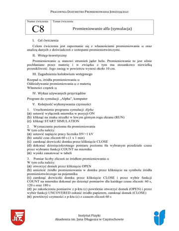 PRACOWNIA DOZYMETRII PROMIENIOWANIA JONIZUJĄCEGO Numer ćwiczenia Temat ćwiczenia C8 Promieniowanie alfa (symulacja) I. Cel ćwiczenia Celem ćwiczenia jest zapoznanie się z własnościami promieniowania analizą danych z doświadczeń z izotopami promieniotwórczymi. oraz II. Wstęp teoretyczny Promieniowanie stanowi strumień jąder helu. Promieniowanie to jest silnie pochłaniane przez materię i w związku z tym ma stosunkowo niewielką przenikliwość. Jego zasięg w powietrzu wynosi około 10 cm. III. Zagadnienia kolokwium wstępnego Rozpad , źródła promieniowania Oddziaływanie promieniowania z materią Własności cząstek IV. Wykaz używanych przyrządów Program do symulacji „Alpha”, komputer V. Kolejność wykonywania czynności 1. (a) (b) (c) Uruchomienie programu symulacji Alpha ustawić wyłącznik miernika w pozycji ON kliknąć na znaku strzałki w lewym górnym rogu ekranu (RUN) kliknąć START SIMULATION 2. Wyznaczanie poziomu tła promieniowania W tym celu należy: (a) ustawić napięcie pracy licznika HV=1 kV (b) ustalić czas zliczeń 60 s (1 x 1 min) (c) zamknąć drzwiczki domku przez kliknięcie CLOSE (d) dokonać dziesięciokrotnego pomiaru poziomu tła wybranym przedziale czasu przez wybranie funkcji COUNT na mierniku (e) wyniki zanotować w tabeli 3. Pomiar liczby zliczeń ze źródłem promieniowania W tym celu należy: (a) otworzyć domek przez kliknięcie OPEN (b) umieścić źródło promieniowania w domku przez kliknięcie na symbolu źródła promieniotwórczego na pojemniku (c) zamknąć drzwiczki domku przez kliknięcie CLOSE i przez wybór funkcji COUNT na mierniku dokonać po dziesięć pomiarów dla każdego czasu zliczeń: 60 s, 120 s oraz 180 s (d) po zakończeniu pomiarów z p-ktu (c) powtórnie otworzyć domek (OPEN) i przez wybór funkcji UNCOVERED osłonić źródło papierem, zamknąć domek (CLOSE) (e) powtórzyć czynności z p-ktu (c) z czasem zliczeń 60 s Instytut Fizyki Akademia im. Jana Długosza w Częstochowie PRACOWNIA DOZYMETRII PROMIENIOWANIA JONIZUJĄCEGO 4. Po zakończeniu wszystkich pomiarów otworzyć domek, odkryć źródło (COVERED), przenieść je do pojemnika klikając na symbol promieniowania i zakończyć symulację przez kliknięcie przełącznika OFF VI. Uzyskane wyniki Wyniki pomiarów zanotować w tabelach: Liczba zliczeń N [imp] Lp. tło źródło bez osłony t=60 s t=60 s t=120 s źródło osłonięte t=180 s t=60 s Opracowanie części doświadczalnej powinno zawierać: - protokół z wykonania ćwiczenia - tabelę z wynikami obliczeń wartości średnich liczby zliczeń, średnią liczbę zliczeń na jednostkę czasu oraz błąd pomiaru natężenia promieniowania (patrz: materiały pomocnicze do ćwiczenia) - wnioski VII. Bibliografia 1. A.Strzałkowski: Wstęp do fizyki jądra atomowego, PWN, 1978 2.J.Araminowicz, K.Małuszyńska, M.Przytuła: Laboratorium fizyki jądrowej, PWN, Warszawa, 1974 3. Człowiek i promieniowanie jonizujące, pod red. A. Hrynkiewicza, PWN Warszawa 2001 4. Sz.Szczeniowski: Fizyka doświadczalna, cz. VI Fizyka jądra i cząstek elementarnych, PWN, Warszawa 1974 Instytut Fizyki Akademia im. Jana Długosza w Częstochowie
