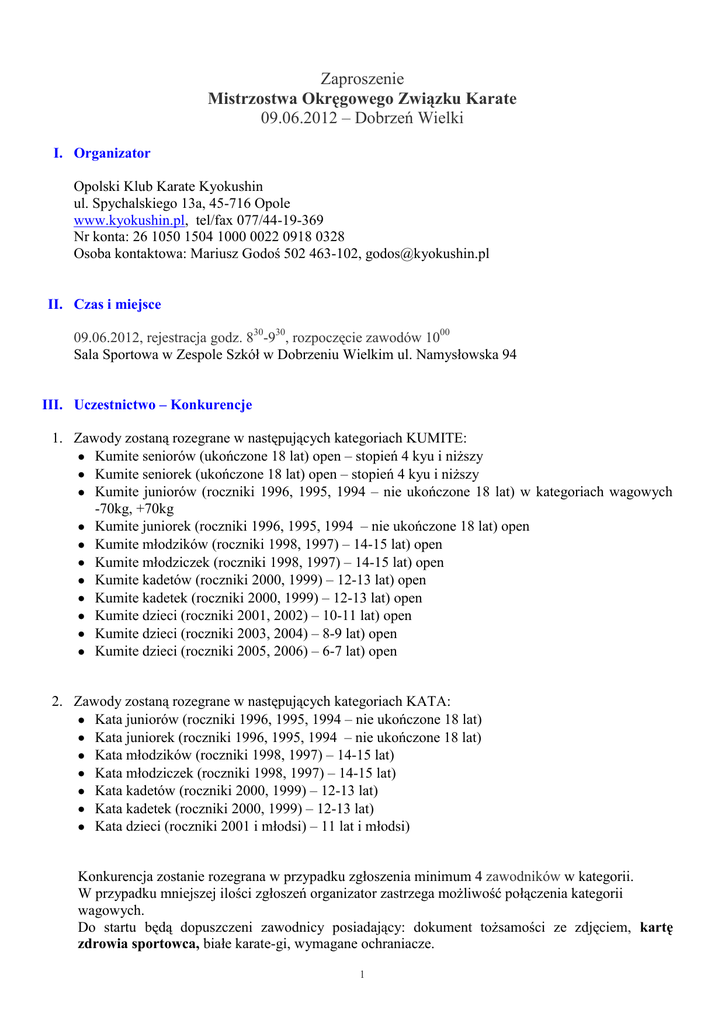 Zaproszenie Mistrzostwa Okręgowego Związku Karate 09.06.2012 – Dobrzeń Wielki I. Organizator Opolski Klub Karate Kyokushin ul. Spychalskiego 13a, 45-716 Opole www.kyokushin.pl, tel/fax 077/44-19-369 Nr konta: 26 1050 1504 1000 0022 0918 0328 Osoba kontaktowa: Mariusz Godoś 502 463-102, [email protected] II. Czas i miejsce 09.06.2012, rejestracja godz. 830-930, rozpoczęcie zawodów 1000 Sala Sportowa w Zespole Szkół w Dobrzeniu Wielkim ul. Namysłowska 94 III. Uczestnictwo – Konkurencje 1. Zawody zostaną rozegrane w następujących kategoriach KUMITE: Kumite seniorów (ukończone 18 lat) open – stopień 4 kyu i niższy Kumite seniorek (ukończone 18 lat) open – stopień 4 kyu i niższy Kumite juniorów (roczniki 1996, 1995, 1994 – nie ukończone 18 lat) w kategoriach wagowych -70kg, +70kg Kumite juniorek (roczniki 1996, 1995, 1994 – nie ukończone 18 lat) open Kumite młodzików (roczniki 1998, 1997) – 14-15 lat) open Kumite młodziczek (roczniki 1998, 1997) – 14-15 lat) open Kumite kadetów (roczniki 2000, 1999) – 12-13 lat) open Kumite kadetek (roczniki 2000, 1999) – 12-13 lat) open Kumite dzieci (roczniki 2001, 2002) – 10-11 lat) open Kumite dzieci (roczniki 2003, 2004) – 8-9 lat) open Kumite dzieci (roczniki 2005, 2006) – 6-7 lat) open 2. Zawody zostaną rozegrane w następujących kategoriach KATA: Kata juniorów (roczniki 1996, 1995, 1994 – nie ukończone 18 lat) Kata juniorek (roczniki 1996, 1995, 1994 – nie ukończone 18 lat) Kata młodzików (roczniki 1998, 1997) – 14-15 lat) Kata młodziczek (roczniki 1998, 1997) – 14-15 lat) Kata kadetów (roczniki 2000, 1999) – 12-13 lat) Kata kadetek (roczniki 2000, 1999) – 12-13 lat) Kata dzieci (roczniki 2001 i młodsi) – 11 lat i młodsi) Konkurencja zostanie rozegrana w przypadku zgłoszenia minimum 4 zawodników w kategorii. W przypadku mniejszej ilości zgłoszeń organizator zastrzega możliwość połączenia kategorii wagowych. Do startu będą dopuszczeni zawodnicy posiadający: dokument tożsamości ze zdjęciem, kartę zdrowia sportowca, białe karate-gi, wymagane ochraniacze. 1 3. Opłata startowa za jednego zawodnika wynosi 20 zł. IV. Regulamin zawodów 1. 2. 3. 4. 5. 1. 2. 3. 4. 5. Kumite - juniorzy, młodzicy Zawodnicy zobowiązani są do walki w następujących ochraniaczach: suspensoria, ochraniacze na podudzie i śródstopie, kask (zapewnia organizator). Zawodniczki zobowiązane są do walki następujących ochraniaczach: ochraniacz na klatkę piersiową, ochraniacze na podudzie i śródstopie, kask (zapewnia organizator). Dopuszczalne są techniki lekkiego kontaktu. Czas trwania walki juniorów młodszych 1,5 min. (dogrywka 1 min.). W ćwierćfinałach dopuszczalna jedna dogrywka. W półfinałach i finałach po pierwszej dogrywce waga. Rozstrzyga różnica większa niż 5 kg. Przy braku rozstrzygnięcia druga dogrywka. Nie będą rozgrywane walki o 3-cie miejsce. Kumite – dzieci i kadeci Zawodnicy zobowiązani są do walki w następujących ochraniaczach: suspensoria, ochraniacze na podudzie i śródstopie, ochraniacz na korpus i kask (zapewnia organizator). Dopuszczalne są wyłącznie techniki lekkiego kontaktu. W półfinałach i finałach dopuszczalna jest dogrywka. Czas trwania walki juniorów młodszych 1 min. (dogrywka 30 sek.). Nie będą rozgrywane walki o 3-cie miejsce. Wszystkie konkurencje kumite zostaną rozegrane indywidualnie, systemem pucharowym Kata - juniorzy, młodzicy i kadeci 1. Zawody kata zostaną rozegrane w dwóch turach. W pierwszej turze sędzia maty podaje kata wykonywane przez zawodnika, w drugiej turze zawodnik wybiera wykonywane kata. 2. W drugiej turze (finałowej) wystąpi 4 zawodników. 3. Kata w kategorii juniorzy i juniorki 1 tura: pinian III, pinian IV, pinian V 2 tura: yantsu, tsuki-no-kata, geksai dai, geksai sho, saifa. 4. Kata w kategorii juniorzy młodsi i juniorki młodsze 1 tura: pinian I, pinian II, pinian III 2 tura: pinian IV, pinian V, yantsu, tsuki-no-kata, geksai sho 5. Kata w kategorii młodzicy i młodziczki 1 tura: taikyoku III, pinian I, pinian II 2 tura: pinian III, pinian IV, yantsu, tsuki-no-kata 6. Kata w kategorii kadeci i kadetki 1 tura: taikyoku I, II, III 2 tura: pinian I, II, III V. Nagrody Za 1 miejsce zawodnicy otrzymają puchary. Zawodnicy zajmujący miejsca 1-3 otrzymują medal, dyplom i drobny upominek. Wszyscy uczestnicy otrzymają dyplomy. 2 VI. Zgłoszenia Karty zgłoszeń należy przesłać w terminie do 06.06.2012. Prosimy o przesyłanie zgłoszeń pocztą elektroniczną na adres: [email protected]. Opłata startowa wynosi 20 zł. VII. Postanowienia końcowe Sędzią Głównym zawodów będzie Mariusz Godoś 5 dan. Składy sędziowskie zostaną powołane decyzją Sędziego Głównego w dniu zawodów Organizator nie odpowiada za rzeczy zgubione lub pozostawione podczas zawodów W sprawach nieobjętych regulaminem decydować będzie Organizator i Sędzia Główny. W przypadku nie zgłoszenia 4 zawodników do danej kategorii o sposobie jej rozegrania decydować będzie Organizator. Organizator zastrzega sobie prawo do zmian w regulaminie dotyczących spraw organizacyjnych. Wszyscy zawodnicy startujący w Mistrzostwach są objęci ubezpieczeniem NW, które opłaci organizator. Mariusz Godoś Prezes Opolskiego Klubu Karate Kyokushin 3
