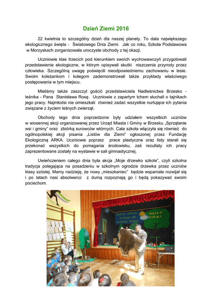Dzień Ziemi 2016 22 kwietnia to szczególny dzień dla naszej planety. To data największego ekologicznego święta - Światowego Dnia Ziemi. Jak co roku, Szkoła Podstawowa w Morzyskach zorganizowała uroczyste obchody z tej okazji. Uczniowie klas trzecich pod kierunkiem swoich wychowawczyń przygotowali przedstawienie ekologiczne, w którym opisywali skutki niszczenia przyrody przez człowieka. Szczególną uwagę poświęcili nieodpowiedniemu zachowaniu w lesie. Swoim koleżankom i kolegom zademonstrowali także przykłady właściwego postępowania w tym miejscu. Mieliśmy także zaszczyt gościć przedstawiciela Nadleśnictwa Brzesko leśnika - Pana Stanisława Rosę. Uczniowie z zapartym tchem słuchali o tajnikach jego pracy. Najmłodsi nie omieszkali również zadać wszystkie nurtujące ich pytania związane z życiem leśnych zwierząt. Obchody tego dnia poprzedzone były udziałem wszystkich uczniów w wiosennej akcji organizowanej przez Urząd Miasta i Gminy w Brzesku „Sprzątanie wsi i gminy” oraz zbiórką surowców wtórnych. Cała szkoła włączyła się również do ogólnopolskiej akcji pisania „Listów dla Ziemi” ogłoszonej przez Fundację Ekologiczną ARKA. Uczniowie poprzez prace plastyczne oraz listy starali się przekonać wszystkich do pomagania środowisku, zaś rezultaty ich pracy zaprezentowane zostały na wystawie w sali gimnastycznej. Uwieńczeniem całego dnia była akcja „Moje drzewko szkole”, czyli szkolna tradycja polegająca na posadzeniu w szkolnym ogrodzie drzewka przez uczniów klasy szóstej. Mamy nadzieję, że nowy „mieszkaniec” będzie wspaniale rozwijał się i po latach nasi absolwenci z dumą rozpoznają go i będą pokazywać swoim pociechom.