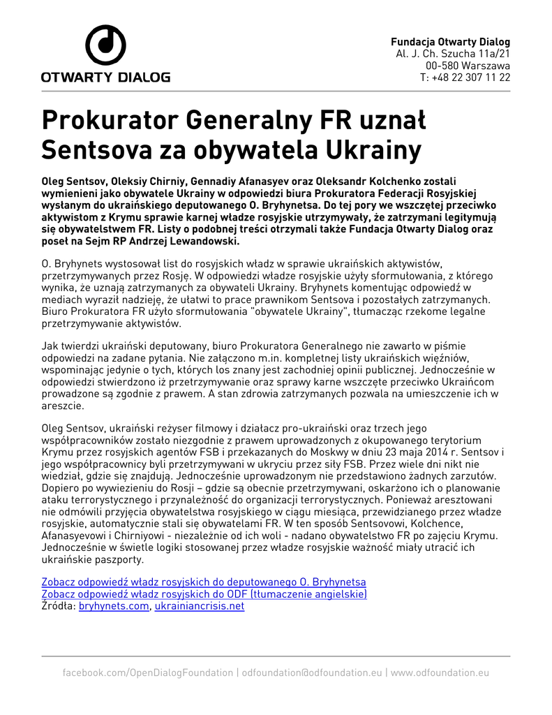 Fundacja Otwarty Dialog Al. J. Ch. Szucha 11a/21 00-580 Warszawa T: +48 22 307 11 22 Prokurator Generalny FR uznał Sentsova za obywatela Ukrainy Oleg Sentsov, Oleksiy Chirniy, Gennadiy Afanasyev oraz Oleksandr Kolchenko zostali wymienieni jako obywatele Ukrainy w odpowiedzi biura Prokuratora Federacji Rosyjskiej wysłanym do ukraińskiego deputowanego O. Bryhynetsa. Do tej pory we wszczętej przeciwko aktywistom z Krymu sprawie karnej władze rosyjskie utrzymywały, że zatrzymani legitymują się obywatelstwem FR. Listy o podobnej treści otrzymali także Fundacja Otwarty Dialog oraz poseł na Sejm RP Andrzej Lewandowski. O. Bryhynets wystosował list do rosyjskich władz w sprawie ukraińskich aktywistów, przetrzymywanych przez Rosję. W odpowiedzi władze rosyjskie użyły sformułowania, z którego wynika, że uznają zatrzymanych za obywateli Ukrainy. Bryhynets komentując odpowiedź w mediach wyraził nadzieję, że ułatwi to prace prawnikom Sentsova i pozostałych zatrzymanych. Biuro Prokuratora FR użyło sformułowania "obywatele Ukrainy", tłumacząc rzekome legalne przetrzymywanie aktywistów. Jak twierdzi ukraiński deputowany, biuro Prokuratora Generalnego nie zawarło w piśmie odpowiedzi na zadane pytania. Nie załączono m.in. kompletnej listy ukraińskich więźniów, wspominając jedynie o tych, których los znany jest zachodniej opinii publicznej. Jednocześnie w odpowiedzi stwierdzono iż przetrzymywanie oraz sprawy karne wszczęte przeciwko Ukraińcom prowadzone są zgodnie z prawem. A stan zdrowia zatrzymanych pozwala na umieszczenie ich w areszcie. Oleg Sentsov, ukraiński reżyser filmowy i działacz pro-ukraiński oraz trzech jego współpracowników zostało niezgodnie z prawem uprowadzonych z okupowanego terytorium Krymu przez rosyjskich agentów FSB i przekazanych do Moskwy w dniu 23 maja 2014 r. Sentsov i jego współpracownicy byli przetrzymywani w ukryciu przez siły FSB. Przez wiele dni nikt nie wiedział, gdzie się znajdują. Jednocześnie uprowadzonym nie przedstawiono żadnych zarzutów. Dopiero po wywiezieniu do Rosji – gdzie są obecnie przetrzymywani, oskarżono ich o planowanie ataku terrorystycznego i przynależność do organizacji terrorystycznych. Ponieważ aresztowani nie odmówili przyjęcia obywatelstwa rosyjskiego w ciągu miesiąca, przewidzianego przez władze rosyjskie, automatycznie stali się obywatelami FR. W ten sposób Sentsovowi, Kolchence, Afanasyevowi i Chirniyowi - niezależnie od ich woli - nadano obywatelstwo FR po zajęciu Krymu. Jednocześnie w świetle logiki stosowanej przez władze rosyjskie ważność miały utracić ich ukraińskie paszporty. Zobacz odpowiedź władz rosyjskich do deputowanego O. Bryhynetsa Zobacz odpowiedź władz rosyjskich do ODF (tłumaczenie angielskie) Źródła: bryhynets.com, ukrainiancrisis.net facebook.com/OpenDialogFoundation | [email protected] | www.odfoundation.eu