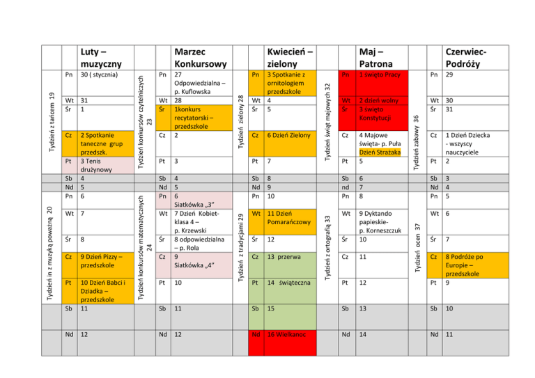Śr 8 Cz 9 Dzień Pizzy – przedszkole Pt Sb 10 Dzień Babci i Dziadka – przedszkole 11 Nd 12 Sb Nd Pn 4 5 6 Siatkówka „3” Wt 7 Dzień Kobietklasa 4 – p. Krzewski Śr 8 odpowiedzialna – p. Rola Cz 9 Siatkówka „4” 6 Dzień Zielony Pt 7 Sb Nd Pn 8 9 10 Wt 11 Dzień Pomarańczowy Śr 12 Cz 13 przerwa Pt 14 świąteczna Pn 1 święto Pracy Pn Wt Śr 2 dzień wolny 3 święto Konstytucji Wt 30 Śr 31 Cz Pt 4 Majowe święta- p. Puła Dzień Strażaka 5 Sb nd Pn Wt Tydzień zabawy 36 3 Cz Tydzień świąt majowych 32 Pn CzerwiecPodróży Cz 29 Pt 1 Dzień Dziecka - wszyscy nauczyciele 2 6 7 8 Sb Nd Pn 3 4 5 Wt 6 Śr 9 Dyktando papieskiep. Korneszczuk 10 Cz 11 Pt 12 Tydzień ocen 37 Wt 7 Pt 3 Spotkanie z ornitologiem przedszkole Wt 4 Śr 5 Maj – Patrona Tydzień z ortografią 33 Sb Nd Pn 2 Spotkanie taneczne grup przedszk. 3 Tenis drużynowy 4 5 6 Pn Tydzień zielony 28 Cz 27 Odpowiedzialna – p. Kuflowska Wt 28 Śr 1konkurs recytatorski – przedszkole Cz 2 Kwiecień – zielony Tydzień z tradycjami 29 Wt 31 Śr 1 Pt Tydzień in z muzyką poważną 20 30 ( stycznia) Tydzień konkursów matematycznych 24 Tydzień z tańcem 19 Pn Marzec Konkursowy Tydzień konkursów czytelniczych 23 Luty – muzyczny Śr 7 Cz Pt 8 Podróże po Europie – przedszkole 9 Pt 10 Sb 11 Sb 15 Sb 13 Sb 10 Nd 12 Nd 16 Wielkanoc Nd 14 Nd 11 Sb Nd Pn Wt Śr Cz Pt sb nd Pt 17 Sb Nd Pn 18 19 20odpowiedzialny p. Krzewski Wt 21 Dzień SU – p. Ciesielska Śr 22 Cz Pt 25 26 Sb Nd Pn 23 Zab. sportowe w przedsz. 24 25 26 27 odpowiedzialna –p. Turek Wt 28 Śr 29 cz 30 Moja ulubiona bajka- konk.przed. Pt 31 Sb 1 Nd 2 15 Pn Wt 16 Dzień Patrona – wszyscy nauczyciele Wt 13 Śr Cz 17 18 Śr Cz 19 20 Pt 21 Pt Sb Nd Pn 22 23 24 Wt 25 Śr cz Pt Sb Nd Pn 26 Rada Pedagogiczna 27 Spotkanie z rodzicami 28 Czwórbój LA 29 30 Tydzień podróży 38 15 Dzień Kosmosu 16 Piłka ręczna Wt 18 Przerwa świąteczna Pn 12 śr Cz 14 15 Boże Ciało 19 Pt Sb Nd Pn 20 21 22 Sb Nd Pn 16 klasyfikacja , dzień wolny dla ucz. 17 18 19 Wt 23 Śr 24 cz 25 Pt 26 Dzień Mamy i Taty 27 28 Sb Nd Pn Tydzień talentów 39 Śr Cz 17 Wielkanoc Tydzień z patronem34 Wt 14 Dzień poezjispotkanie z poetką – przedszkole Pn Tydzień z rodziną 35 13odpowiedzialnap. Dorosz Tydzień w ogrodzie 30 Pn Tydzień ziemi 31 Wt 21 Spotkanie z rodzicami Śr 22 Koszykówka chłopcy Cz 23 Tłusty Czwartek przedsz Pt 24 Tydzień konkursów językowych 25 Wt 14 Konkurs Piosenki Ang. – p. Oleksiewicz Walentyki –p. Ciesielska Śr 15 Cz 16 Rada Szkoleniowa Pt 17 Dzień Kota – przedszkole Sb 18 Nd 19 Pn 20 Tydzień konkursów sportowych 26 13 Tydzień konkursów plastycznych 27 Tydzień z piosenką romantyczną 21 Tydzień z muzyką relaksacyjną 22 Pn Wt 20 Śr 21 cz 22 Pt 23 Zakończenie roku Sb Nd Pn 24 25 26 Wt Śr Cz Wt Śr Cz Wt Śr Cz Pt Sb Nd Pt Sb Nd Pt Sb Nd