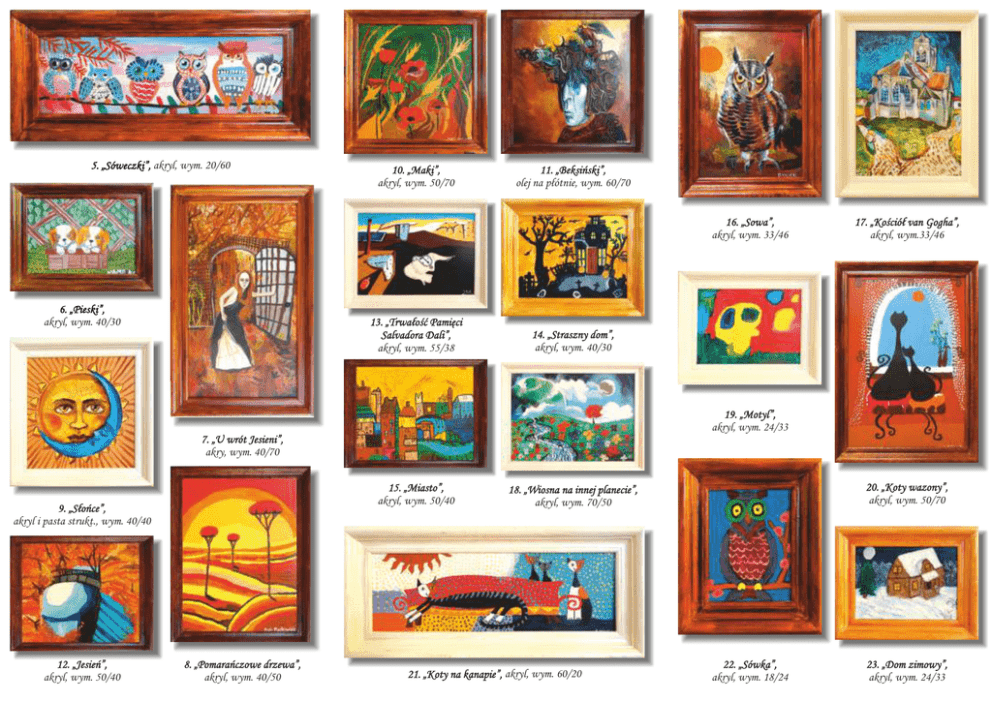 5. „Sóweczki”, akryl, wym. 20/60 10. „Maki”, akryl, wym. 50/70 11. „Beksiński”, olej na płótnie, wym. 60/70 16. „Sowa”, akryl, wym. 33/46 6. „Pieski”, akryl, wym. 40/30 13. „Trwałość Pamięci Salvadora Dali”, akryl, wym. 55/38 17. „Kościół van Gogha”, akryl, wym.33/46 14. „Straszny dom”, akryl, wym. 40/30 19. „Motyl”, akryl, wym. 24/33 7. „U wrót Jesieni”, akry, wym. 40/70 15. „Miasto”, akryl, wym. 50/40 9. „Słońce”, akryl i pasta strukt., wym. 40/40 12. „Jesień”, akryl, wym. 50/40 8. „Pomarańczowe drzewa”, akryl, wym. 40/50 20. „Koty wazony”, akryl, wym. 50/70 18. „Wiosna na innej planecie”, akryl, wym. 70/50 21. „Koty na kanapie”, akryl, wym. 60/20 22. „Sówka”, akryl, wym. 18/24 23. „Dom zimowy”, akryl, wym. 24/33