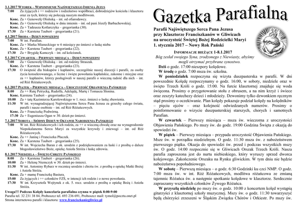 3.1.2017 WTOREK – WSPOMNIENIE NAJŚWIĘTSZEGO IMIENIA JEZUS 7:00 Za żyjących i ++ rodziców i rodzeństwo współbraci, dobrodziejów kościoła i klasztoru oraz za tych, którzy się polecają naszym modlitwom. Konc. Za + Genowefę Olsińską – int. od ofiarodawcy. Konc. Za + Genowefę Olsińską w dniu imienin – int. od pani Józefy Barbachowskiej. Konc. Za + Tadeusza Kotlarczyka – gregorianka (30). 17:30 Za + Karstena Taubert – gregorianka (21). 4.1.2017 ŚRODA – DZIEŃ POWSZEDNI 7:00 W int. Parafian. Konc. Za + Marka Mianeckiego w 6 miesięcy po śmierci o łaskę nieba Konc. Za + Karstena Taubert – gregorianka (22). 17:30 Za + Brygidę Kamczyk – int. od koleżanek. 5.1.2017 CZWARTEK – PIERWSZY MIESIĄCA – DZIEŃ POWSZEDNI 7:00 Za + Genowefę Olsińską – int. od rodziny Straszak. Konc. Za + Karstena Taubert – gregorianka (23). 17:30 O świętość dla biskupów i kapłanów, szczególnie naszej diecezji i parafii, za osoby życia konsekrowanego, o liczne i święte powołania kapłańskie, zakonne i misyjne oraz za ++ kapłanów, którzy posługiwali w naszej parafii o wieczną radość dla nich – int. od Róż Różańcowych. 6.1.2017 PIĄTEK – PIERWSZY MIESIĄCA – UROCZYSTOŚĆ OBJAWIENIA PAŃSKIEGO 8:00 Za ++ Rutę Petrycką, Rudolfa, Adelajdę, Martę i Tomasza Slonina. Konc. Karstena Taubert – gregorianka (24). 10:00 Za + tatę Kazimierza Karolewskiego w 1. rocz. śmierci o łaskę zbawienia. 11:30 W int. wynagradzającej Najświętszemu Sercu Pana Jezusa za grzechy całego świata, parafii i nasze osobiste – int. od Róż Różańcowych. Konc. Za + Franciszkę Podwórną. 17:30 Za + Eugeniusza Ogan w 30. dzień po śmierci. 7.1.2017 SOBOTA – SIÓDMY DZIEŃ W OKTAWIE NARODZENIA PAŃSKIEGO 7:00 W int. Róż Różańcowych i ich rodzin, za ++ o wieczną chwałę oraz na wynagrodzenie Niepokalanemu Sercu Maryi za wszystkie krzywdy i zniewagi – int. od Róż Różańcowych. Konc. Za ++ Janinę i Franciszka Płaczek. Konc. Za + Karstena Taubert – gregorianka (25). 17:30 W int. Wojciecha Baran z ok. urodzin z podziękowaniem za łaski i z prośbą o dalsze błogosławieństwo Boże, opiekę Anioła Stróża i łaskę zdrowia. 8.1.2017 NIEDZIELA – ŚWIĘTO CHRZTU PAŃSKIEGO 8:00 Za + Karstena Taubert – gregorianka (26). 10:00 Za + Helenę Niemczyk w 30. dzień po śmierci. 11:30 W int. Antoniny Rybarz w rocznicę urodzin i chrztu św. z prośbą o opiekę Matki Bożej i Anioła Stróża. Konc. Za + mamę Franciszkę Basiura. 15:00 Za żyjących i ++ członków FZŚ, w intencji ich rodzin i o nowe powołania. 17:30 W int. Krzysztofa Wojtynek z ok. 5. rocz. urodzin z prośbą o opiekę Bożą i Anioła Stróża. Uwaga!!! Podczas Kolędy kancelaria parafialna czynna w piątek 8:00-9:00 Parafia tel. 32 231 38 84, Proboszcz tel. 693 236 691, Proboszcz mail: [email protected] Strona internetowa parafii i klasztoru: www.franciszkaniegliwice.pl Parafii Najświętszego Serca Pana Jezusa przy Klasztorze Franciszkanów w Gliwicach na uroczystość Świętej Bożej Rodzicielki Maryi 1. stycznia 2017 – Nowy Rok Pański INFORMACJE BIEŻĄCE 1-8.1.2017 Bóg zesłał swojego Syna, zrodzonego z Niewiasty, abyśmy mogli otrzymać przybrane synostwo. Dziś o godz. 17:00 nieszpory kolędowe. W środę o godz. 7:00 msza św. szkolna. W poniedziałek rozpoczyna się wizyta duszpasterska w parafii. W dni powszednie Kolędę rozpoczynamy o godz. 16:00, w soboty, niedziele oraz w święto Trzech Króli o godz. 15:00. Na furcie klasztornej znajduje się woda święcona. Prosimy o przygotowanie stołu z obrusem, a na nim krzyż i świece oraz zeszyty katechezy dzieci i młodzieży. Dzwonimy tylko dzwonkiem ręcznym stąd prosimy o oczekiwanie. Plan kolędy pokazuje podział kolędy na kolędników – pięciu ojców – oraz kolejność odwiedzanych numerów. Prosimy o poinformowanie o wizycie duszpasterskiej starszych, chorych i samotnych Parafian. W czwartek – Pierwszy miesiąca – msza św. wieczorna z uroczystości Objawienia Pańskiego. Po mszy św. do godz. 19:00 Godzina Święta z okazją do spowiedzi św. W piątek – Pierwszy miesiąca – przypada uroczystość Objawienia Pańskiego. Msze św. w porządku niedzielnym. O godz. 11:30 msza św. z nabożeństwem pierwszego piątku. Okazja do spowiedzi św. przed i podczas wszystkich mszy św. O godz. 14:00 rozpocznie się w Gliwicach Orszak Trzech Króli. Nasza parafia zaproszona jest do nurtu niebieskiego, który wyruszy sprzed dworca kolejowego. Zakończenie Orszaku na Rynku gliwickim. W tym dniu nie będzie nabożeństwa popołudniowego. W sobotę – Pierwszą miesiąca – o godz. 6:30 Godzinki ku czci NMP. O godz. 7:00 msza św. w int. Róż Różańcowych, modlitwa różańcowa ze zmianą tajemnic Różańca św. a następnie spotkanie kolędowe w klasztorze. Serdecznie zapraszamy wszystkich członków Żywego Różańca. W przyszłą niedzielę po mszy św. o godz. 10:00 z koncertem kolęd wystąpią gitarzyści z klasztornej szkoły muzycznej. Mszy św. o godz. 11:30 towarzyszyć będą chórzyści zrzeszeni w Śląskim Związku Chórów i Orkiestr. Po mszy św. koncert kolęd w wykonaniu chórów – szczegóły na plakacie w gablocie – serdecznie zapraszamy. O godz. 15:00 msza św. dla FZŚ, RMF i sympatyków duchowości franciszkańskiej. Polecamy Gazetkę Parafialną. Kolęda w poniedziałek Zabrska, we wtorek Królowej Jadwigi, Św. Katarzyny i Jagiellońska nieparzyste 9-23a oraz parzyste 16, 16a i 24, w środę Jagiellońska nieparzyste 27-31 oraz parzyste 30-50, w czwartek Krzywa i Hutnicza nieparzyste oraz parzyste 4-8, w piątek Hutnicza parzyste 10-28, Bł. Czesława nieparzyste 1-37, Św. S. Kostki i Szara, w sobotę Bł. Czesława parzyste 4-52, w niedzielę Bł. Czesława parzyste 54-92, Paulińska i Św. Cecylii. Plan wywieszony jest również w gablocie oraz na internetowej stronie parafii. Parafianom i Gościom dziękujemy za każde dobro minionego roku i życzymy wszystkim b