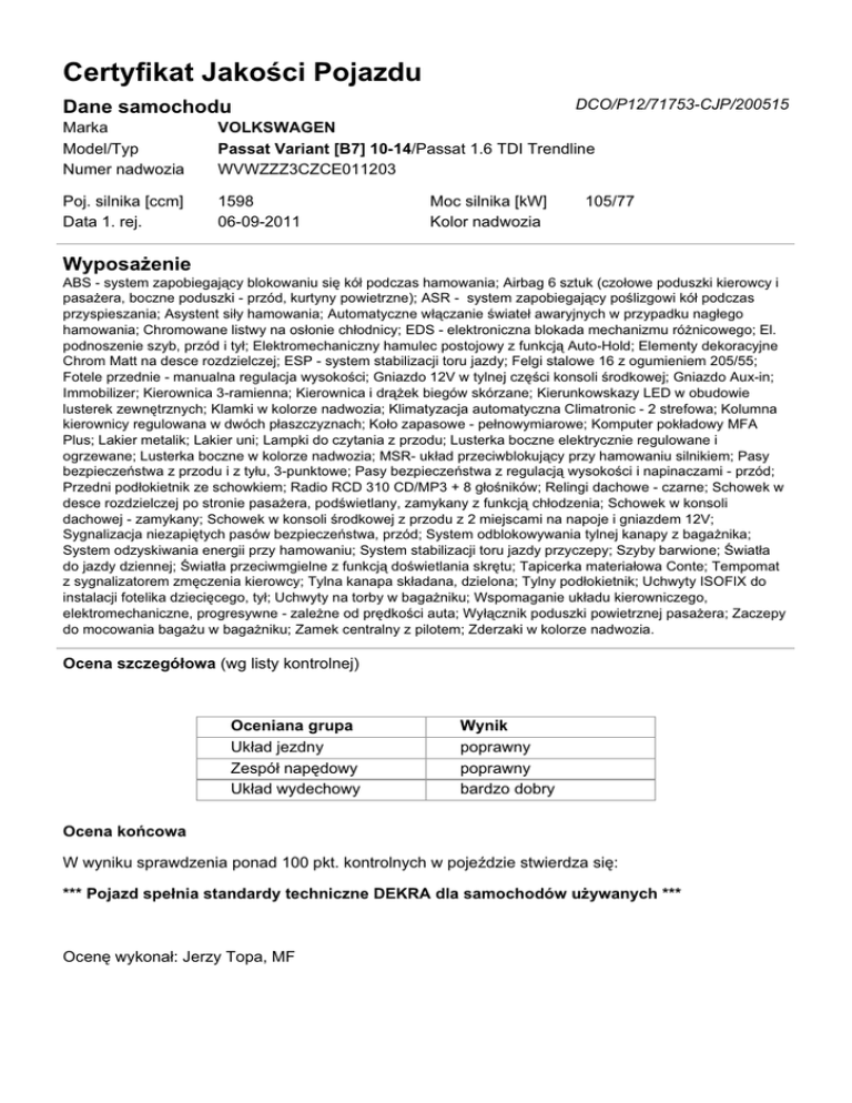 Certyfikat Jakości Pojazdu DCO/P12/71753-CJP/200515 Dane samochodu Marka Model/Typ Numer nadwozia VOLKSWAGEN Passat Variant [B7] 10-14/Passat 1.6 TDI Trendline WVWZZZ3CZCE011203 Poj. silnika [ccm] Data 1. rej. 1598 06-09-2011 Moc silnika [kW] Kolor nadwozia 105/77 Wyposażenie ABS - system zapobiegający blokowaniu się kół podczas hamowania; Airbag 6 sztuk (czołowe poduszki kierowcy i pasażera, boczne poduszki - przód, kurtyny powietrzne); ASR - system zapobiegający poślizgowi kół podczas przyspieszania; Asystent siły hamowania; Automatyczne włączanie świateł awaryjnych w przypadku nagłego hamowania; Chromowane listwy na osłonie chłodnicy; EDS - elektroniczna blokada mechanizmu różnicowego; El. podnoszenie szyb, przód i tył; Elektromechaniczny hamulec postojowy z funkcją Auto-Hold; Elementy dekoracyjne Chrom Matt na desce rozdzielczej; ESP - system stabilizacji toru jazdy; Felgi stalowe 16 z ogumieniem 205/55; Fotele przednie - manualna regulacja wysokości; Gniazdo 12V w tylnej części konsoli środkowej; Gniazdo Aux-in; Immobilizer; Kierownica 3-ramienna; Kierownica i drążek biegów skórzane; Kierunkowskazy LED w obudowie lusterek zewnętrznych; Klamki w kolorze nadwozia; Klimatyzacja automatyczna Climatronic - 2 strefowa; Kolumna kierownicy regulowana w dwóch płaszczyznach; Koło zapasowe - pełnowymiarowe; Komputer pokładowy MFA Plus; Lakier metalik; Lakier uni; Lampki do czytania z przodu; Lusterka boczne elektrycznie regulowane i ogrzewane; Lusterka boczne w kolorze nadwozia; MSR- układ przeciwblokujący przy hamowaniu silnikiem; Pasy bezpieczeństwa z przodu i z tyłu, 3-punktowe; Pasy bezpieczeństwa z regulacją wysokości i napinaczami - przód; Przedni podłokietnik ze schowkiem; Radio RCD 310 CD/MP3 + 8 głośników; Relingi dachowe - czarne; Schowek w desce rozdzielczej po stronie pasażera, podświetlany, zamykany z funkcją chłodzenia; Schowek w konsoli dachowej - zamykany; Schowek w konsoli środkowej z przodu z 2 miejscami na napoje i gniazdem 12V; Sygnalizacja niezapiętych pasów bezpieczeństwa, przód; System odblokowywania tylnej kanapy z bagażnika; System odzyskiwania energii przy hamowaniu; System stabilizacji toru jazdy przyczepy; Szyby barwione; Światła do jazdy dziennej; Światła przeciwmgielne z funkcją doświetlania skrętu; Tapicerka materiałowa Conte; Tempomat z sygnalizatorem zmęczenia kierowcy; Tylna kanapa składana, dzielona; Tylny podłokietnik; Uchwyty ISOFIX do instalacji fotelika dziecięcego, tył; Uchwyty na torby w bagażniku; Wspomaganie układu kierowniczego, elektromechaniczne, progresywne - zależne od prędkości auta; Wyłącznik poduszki powietrznej pasażera; Zaczepy do mocowania bagażu w bagażniku; Zamek centralny z pilotem; Zderzaki w kolorze nadwozia. Ocena szczegółowa (wg listy kontrolnej) Oceniana grupa Układ jezdny Zespół napędowy Układ wydechowy Wynik poprawny poprawny bardzo dobry Ocena końcowa W wyniku sprawdzenia ponad 100 pkt. kontrolnych w pojeździe stwierdza się: *** Pojazd spełnia standardy techniczne DEKRA dla samochodów używanych *** Ocenę wykonał: Jerzy Topa, MF