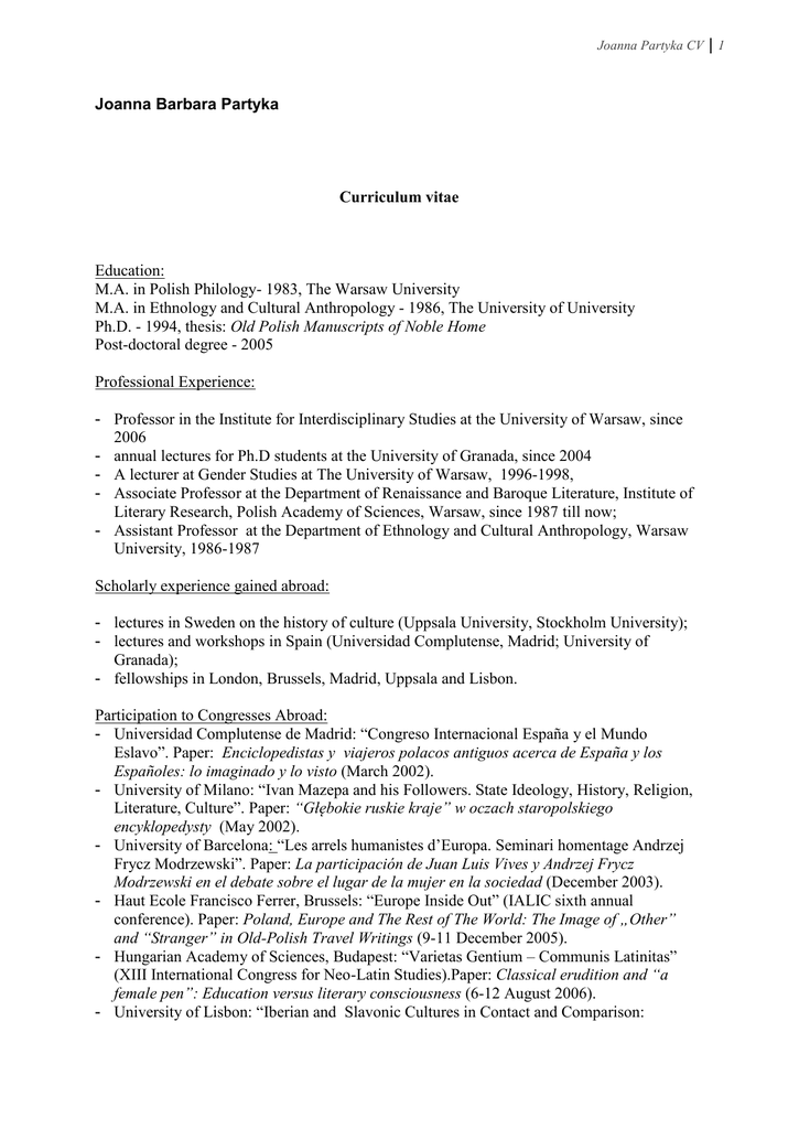 Joanna Partyka CV Joanna Barbara Partyka Curriculum vitae Education: M.A. in Polish Philology- 1983, The Warsaw University M.A. in Ethnology and Cultural Anthropology - 1986, The University of University Ph.D. - 1994, thesis: Old Polish Manuscripts of Noble Home Post-doctoral degree - 2005 Professional Experience: - Professor in the Institute for Interdisciplinary Studies at the University of Warsaw, since 2006 - annual lectures for Ph.D students at the University of Granada, since 2004 - A lecturer at Gender Studies at The University of Warsaw, 1996-1998, - Associate Professor at the Department of Renaissance and Baroque Literature, Institute of Literary Research, Polish Academy of Sciences, Warsaw, since 1987 till now; - Assistant Professor at the Department of Ethnology and Cultural Anthropology, Warsaw University, 1986-1987 Scholarly experience gained abroad: - lectures in Sweden on the history of culture (Uppsala University, Stockholm University); - lectures and workshops in Spain (Universidad Complutense, Madrid; University of Granada); - fellowships in London, Brussels, Madrid, Uppsala and Lisbon. Participation to Congresses Abroad: - Universidad Complutense de Madrid: “Congreso Internacional España y el Mundo Eslavo”. Paper: Enciclopedistas y viajeros polacos antiguos acerca de España y los Españoles: lo imaginado y lo visto (March 2002). - University of Milano: “Ivan Mazepa and his Followers. State Ideology, History, Religion, Literature, Culture”. Paper: “Głębokie ruskie kraje” w oczach staropolskiego encyklopedysty (May 2002). - University of Barcelona: “Les arrels humanistes d’Europa. Seminari homentage Andrzej Frycz Modrzewski”. Paper: La participación de Juan Luis Vives y Andrzej Frycz Modrzewski en el debate sobre el lugar de la mujer en la sociedad (December 2003). - Haut Ecole Francisco Ferrer, Brussels: “Europe Inside Out” (IALIC sixth annual conference). Paper: Poland, Europe and The Rest of The World: The Image of „Other” and “Stranger” in Old-Polish Travel Writings (9-11 December 2005). - Hungarian Academy of Sciences, Budapest: “Varietas Gentium – Communis Latinitas” (XIII International Congress for Neo-Latin Studies).Paper: Classical erudition and “a female pen”: Education versus literary consciousness (6-12 August 2006). - University of Lisbon: “Iberian and Slavonic Cultures in Contact and Comparison: 1 Joanna Partyka CV Towards Crisis and posprerity”. Paper: The 15th-century knight from Wroclaw about the Portuguese conquistadors (April 2007). - University of Luján, Argentina: VI Jornadas de Historia Moderna y Contemporánea. Paper: La retórica del yo-mujer en el siglo XVII: autobiografía lírica de una dama polaca (September 2008) - University of Lisbon: “Intra Muros - Ante Portas”. Paper: Old Polish and Spanish penitentials as a source of knowledge on folk-paganism in a Christian society (May 2008) - University of Uppsala: The Fourteenth International Congress of the International Association for Neo-Latin Studies. Paper: The ancient tradition as a weapon against the obtrectatores Poloniae (with E. J. Głębicka) (August 2009). Main Recent Publications - - - “Żona wyćwiczona”: kobieta pisząca w kulturze XVI i XVII wieku, IBL Editorial, Warszawa 2004. Educated Wife. Women writers in the Polish culture of the 16th and 17th centuries, “Academia. The Magazine of the Polish Academy of Sciences”, No. 2(6), 2005. Rzeczpospolita, Europa i reszta świata: obraz „innego” i „obcego” w staropolskich dziennikach podróży (Poland, Europe and the Rest of the World: the Image of “Other” and “Stranger” in old-Polish Itineraries), „Barok. Historia. Literatura. Sztuka”, 2006. J. L. Borges, Nueve ensayos dantescos, Wydawnictwo Prószyński i S-ka, Warszawa 2006 (edition and translation into Polish). La influencia de Las Etimologías de San Isidoro de Sevilla en la imagen de la mujer en la cultura polaca antigua, “Mundo Eslavo. revista de cultura y estudios eslavos”, núm. 5(2006). Algunas palabras sobre la creación literaria de las mujeres en la España de los Siglos de Oro, w: “I Jornadas de Literatura en español”, Varsovia 2006. „Staropolskie podręczniki dla spowiedników: pierwsze kwestionariusze etnograficzne”, in: Wszystko tu najdzie... . Świat prozy staropolskiej, E. Lasocińska i A. Czechowicz, eds., Warszawa 2008. Membership: International Association for Languages and Intercultural Communication International Association for Neo-Latin Studies International Society for Iberian-Slavonic Studies (CompaRes). Main Fields of Interes: Polish and Mediterranean culture of Renaissance and Baroque; paraliterary texts: treatises, letters, diaries, autobiographies, household books, silvae rerum manuscripts, almanacs, etc.; history of women. 2