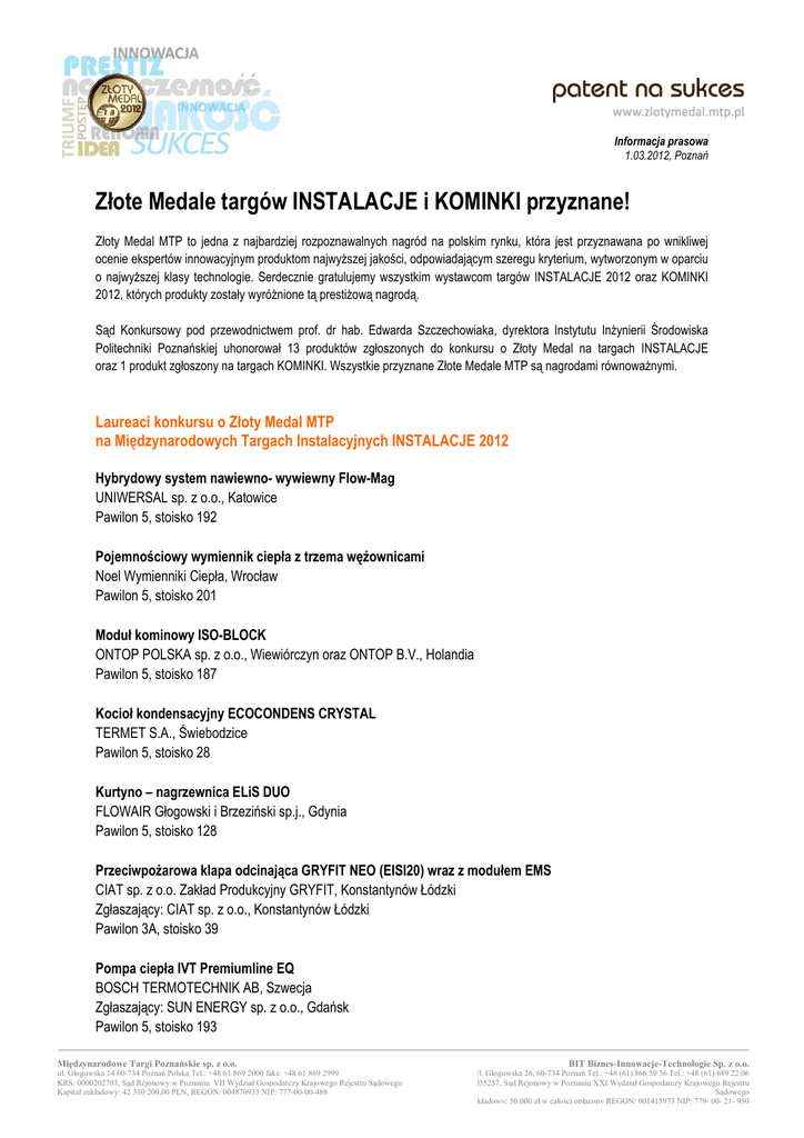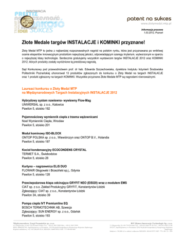 Informacja prasowa 1.03.2012, Poznań Złote Medale targów INSTALACJE i KOMINKI przyznane! Złoty Medal MTP to jedna z najbardziej rozpoznawalnych nagród na polskim rynku, która jest przyznawana po wnikliwej ocenie ekspertów innowacyjnym produktom najwyŜszej jakości, odpowiadającym szeregu kryterium, wytworzonym w oparciu o najwyŜszej klasy technologie. Serdecznie gratulujemy wszystkim wystawcom targów INSTALACJE 2012 oraz KOMINKI 2012, których produkty zostały wyróŜnione tą prestiŜową nagrodą. Sąd Konkursowy pod przewodnictwem prof. dr hab. Edwarda Szczechowiaka, dyrektora Instytutu InŜynierii Środowiska Politechniki Poznańskiej uhonorował 13 produktów zgłoszonych do konkursu o Złoty Medal na targach INSTALACJE oraz 1 produkt zgłoszony na targach KOMINKI. Wszystkie przyznane Złote Medale MTP są nagrodami równowaŜnymi. Laureaci konkursu o Złoty Medal MTP na Międzynarodowych Targach Instalacyjnych INSTALACJE 2012 Hybrydowy system nawiewno- wywiewny Flow-Mag UNIWERSAL sp. z o.o., Katowice Pawilon 5, stoisko 192 Pojemnościowy wymiennik ciepła z trzema węŜownicami Noel Wymienniki Ciepła, Wrocław Pawilon 5, stoisko 201 Moduł kominowy ISO-BLOCK ONTOP POLSKA sp. z o.o., Wiewiórczyn oraz ONTOP B.V., Holandia Pawilon 5, stoisko 187 Kocioł kondensacyjny ECOCONDENS CRYSTAL TERMET S.A., Świebodzice Pawilon 5, stoisko 28 Kurtyno – nagrzewnica ELiS DUO FLOWAIR Głogowski i Brzeziński sp.j., Gdynia Pawilon 5, stoisko 128 PrzeciwpoŜarowa klapa odcinająca GRYFIT NEO (EISI20) wraz z modułem EMS CIAT sp. z o.o. Zakład Produkcyjny GRYFIT, Konstantynów Łódzki Zgłaszający: CIAT sp. z o.o., Konstantynów Łódzki Pawilon 3A, stoisko 39 Pompa ciepła IVT Premiumline EQ BOSCH TERMOTECHNIK AB, Szwecja Zgłaszający: SUN ENERGY sp. z o.o., Gdańsk Pawilon 5, stoisko 193 Międzynarodowe Targi Poznańskie sp. z o.o. ul. Głogowska 14 60-734 Poznań Polska Tel.: +48 61 869 2000 faks: +48 61 869 2999 KRS: 0000202703, Sąd Rejonowy w Poznaniu VII Wydział Gospodarczy Krajowego Rejestru Sądowego Kapitał zakładowy: 42 310 200,00 PLN, REGON: 004870933 NIP: 777-00-00-488 BIT Biznes-Innowacje-Technologie Sp. z o.o. Ul. Głogowska 26, 60-734 Poznań Tel.: +48 (61) 866 59 36 Tel.: +48 (61) 689 22 06 KRS: 0000035257, Sąd Rejonowy w Poznaniu XXI Wydział Gospodarczy Krajowego Rejestru Sądowego Kapitał zakładowy: 50.000 zł w całości opłacony REGON: 001415973 NIP: 779- 00- 21- 950 Zawór wielofunkcyjny Ballorex® Venturi FODRV BROEN sp. z o.o, DzierŜoniów Pawilon 5, stoisko 117 Złączki i kształtki zaprasowane Kisan WL KISAN sp. z o.o., Kańczuga Pawilon 5, stoisko 200 FDBS Ventpack 3.0 dla Bicscard Fluid Desk sp. z o.o., Szczecin Pawilon 3A, stoisko 15 Kocioł Octo Plus (10-15 KW) SOLARFOCUS GmbH, Austria Pawilon 5, stoisko 184 Kocioł kondensacyjny ATAG A244 EC ATAG Verwarming Nederland B.V., Holandia Zgłaszający: EKO-TECH INVEST, Unisław Pawilon 5, stoisko 16 Pompa obiegowa MAGNA 3 z bezprzewodowym interfejsem GRUNDFOS GO Grundfos Holding A/S, Dania Zgłaszający: Grundfos Pompy sp. z o.o., Baranowo Pawilon 4, stoisko 1 Laureaci konkursu o Złoty Medal MTP na Międzynarodowych Targach Kominkowych KOMINKI 2012 Wkład kominkowy MILA GILOTYNA z szamotem i systemem Glass KRATKI.PL Marek Bal, Wsola/ Jedlińsk Pawilon 9, stoisko 4 Liczne zmiany w formule konkursu o Złoty Medal wiąŜą się nie tylko z odświeŜonym wizerunkiem medalu, który po raz pierwszy będzie miał formę prestiŜowej statuetki, ale przede wszystkim z całym pakietem unikatowych korzyści, na które liczyć mogą laureaci konkursu. Ponadto produkty nagrodzone Złotym Medalem prezentowane będą podczas targów w ekskluzywnych przestrzeniach Strefy Mistrzów zlokalizowanych w pawilonach 3, 5 oraz 8, gdzie za pośrednictwem ekranów dotykowych profesjonaliści mogą oddawać głosy na najlepszy ich zdaniem produkt spośród laureatów Złotego Medalu. Równolegle głosowanie odbywać się będzie w Internecie na stronie www.zlotymedal.mtp.pl. PrestiŜowe wyróŜnienia wręczone zostaną laureatom juŜ pierwszego dnia targów podczas uroczystego otwarcia targów Instalacje, Securex, Wodociągi, Kominki, TCS. Międzynarodowe Targi Poznańskie sp. z o.o. ul. Głogowska 14 60-734 Poznań Polska Tel.: +48 61 869 2000 faks: +48 61 869 2999 KRS: 0000202703, Sąd Rejonowy w Poznaniu VII Wydział Gospodarczy Krajowego Rejestru Sądowego Kapitał zakładowy: 42 310 200,00 PLN, REGON: 004870933 NIP: 777-00-00-488 BIT Biznes-Innowacje-Technologie Sp. z o.o. Ul. Głogowska 26, 60-734 Poznań Tel.: +48 (61) 866 59 36 Tel.: +48 (61) 689 22 06 KRS: 0000035257, Sąd Rejonowy w Poznaniu XXI Wydział Gospodarczy Krajowego Rejestru Sądowego Kapitał zakładowy: 50.000 zł w całości opłacony REGON: 001415973 NIP: 779- 00- 21- 950