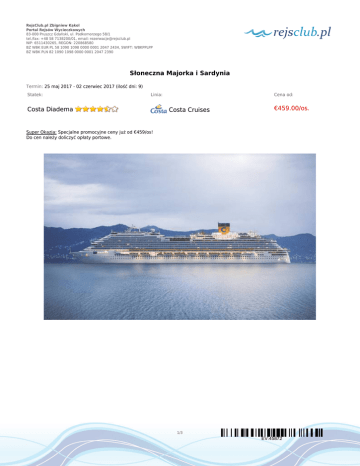 RejsClub.pl Zbigniew Kąkol Portal Rejsów Wycieczkowych 83-000 Pruszcz Gdański, ul. Podkomorzego 58/1 tel./fax: +48 58 7138200/01, email: [email protected] NIP: 6511430265, REGON: 220868580 BZ WBK EUR PL 58 1090 1098 0000 0001 2047 2434, SWIFT: WBKPPLPP BZ WBK PLN 82 1090 1098 0000 0001 2047 2390 Słoneczna Majorka i Sardynia Termin: 25 maj 2017 - 02 czerwiec 2017 (ilość dni: 9) Statek: Linia: Costa Diadema Cena od: Costa Cruises €459.00/os. Super Okazja: Specjalne promocyjne ceny już od €459/os! Do cen należy doliczyć opłaty portowe. 1/3 EV:45872 RejsClub.pl Zbigniew Kąkol Portal Rejsów Wycieczkowych 83-000 Pruszcz Gdański, ul. Podkomorzego 58/1 tel./fax: +48 58 7138200/01, email: [email protected] NIP: 6511430265, REGON: 220868580 BZ WBK EUR PL 58 1090 1098 0000 0001 2047 2434, SWIFT: WBKPPLPP BZ WBK PLN 82 1090 1098 0000 0001 2047 2390 TRASA REJSU dzień 1 dzień 2 dzień 3 dzień 4 dzień 5 dzień 6 dzień 7 dzień 8 dzień 9 Data Port Wpłynięcie Wypłynięcie czwartek 25.05.2017 Civitavecchia, Rzym --:-- 19:00 piątek 26.05.2017 La Spezia 09:00 20:00 sobota 27.05.2017 Savona 07:00 17:00 niedziela 28.05.2017 Marsylia 08:00 17:00 poniedziałek 29.05.2017 Barcelona 09:00 19:00 wtorek 30.05.2017 Palma de Mallorca, Majorka 08:00 --:-- środa 31.05.2017 Palma de Mallorca, Majorka --:-- 01:00 czwartek 01.06.2017 Cagliari, Sardynia 08:00 17:00 piątek 02.06.2017 Civitavecchia, Rzym 08:00 --:-- Legenda Włochy Włochy Włochy Francja Hiszpania Hiszpania Hiszpania Włochy Włochy CENNIK Cena katalogowa Cena promocyjna Kabina wewnętrzna na zapytanie od €459.00 Kabina zewnętrzna z oknem na zapytanie od €609.00 Kabina zewnętrzna z balkonem na zapytanie od €709.00 Suite (apartament) na zapytanie Samsara Suite na zapytanie Kabina jednoosobowa na zapytanie 2/3 EV:45872 RejsClub.pl Zbigniew Kąkol Portal Rejsów Wycieczkowych 83-000 Pruszcz Gdański, ul. Podkomorzego 58/1 tel./fax: +48 58 7138200/01, email: [email protected] NIP: 6511430265, REGON: 220868580 BZ WBK EUR PL 58 1090 1098 0000 0001 2047 2434, SWIFT: WBKPPLPP BZ WBK PLN 82 1090 1098 0000 0001 2047 2390 3 i 4 osoba dorosła w kabinie dziecko do 18 lat jako 3 i 4 osoba w kabinie Opłaty portowe na zapytanie tylko opłaty portowe €150.00 Uwaga! Ceny za osobę w kabinie dwuosobowej. Cena zawiera: zakwaterowanie w kabinie wybranej kategorii; wyżywienie - 3 główne posiłki, przekąski między posiłkami; napoje serwowane do śniadania i w bufetach samoobsługowych; serwis bagażowy podczas wejścia i zejścia ze statku; serwis kabinowy; korzystanie ze wszystkich urządzeń sportowo - rekreacyjnych znajdujących się na pokładzie statku (basen, jacuzzi, sala fitness, itp.); udział we wszystkich imprezach organizowanych na statku (przedstawienia w teatrze, koncerty, programy animacyjne itp.). Cena nie zawiera: kosztów dojazdu do portu; opłat portowych; ewentualnych noclegów w hotelu przed/po rejsie i transferów; wycieczek fakultatywnych w trakcie rejsu; korzystania z barów, mini baru w kabinie oraz napojów zamawianych w restauracji; korzystania z punktów usługowych (fryzjer, pralnia, fotograf, salon piękności i odnowy biologicznej, internet) i wydatków osobistych; napiwków dla obsługi na statku (kwota uzależniona od długości rejsu); ubezpieczenia KL, NNW i bagaż, kosztów wiz (tam gdzie wymagane). Uwagi: Od 01.12.2015 na wszystkich rejsach Costa Cruises (z min. 5 noclegów) można zarezerwować następujące pakiety all inclusive: dla dzieci 4-17 lat Giovani od 15.99€/os./dzień, dla dorosłych: Brindiamo od 24.99€/os./dzień, Piu Gusto od 27.99€/os./dzień, Intenditore od 45.99€/os./dzień (pakiet musi być wykupiony przez każdą osobę zakwaterowaną w kabinie - można zakupić w biurze przed rejsem). Na Państwa życzenie zarezerwujemy przelot, transfery do/z portu, parking, dodatkowe noclegi oraz zadbamy o odpowiednie ubezpieczenie podróżne. 3/3 EV:45872
