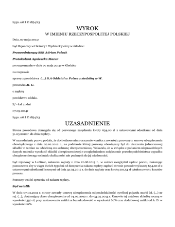 Sygn. akt I C 1854/13 WYROK W IMIENIU RZECZYPOSPOLITEJ POLSKIEJ Dnia, 07 maja 2014r Sąd Rejonowy w Oleśnicy I Wydział Cywilny w składzie: Przewodniczący SSR Adrian Paluch Protokolant Agnieszka Mazur po rozpoznaniu w dniu 07 maja 2014r w Oleśnicy na rozprawie sprawy z powództwa (...) S.A Oddział w Polsce z siedzibą w W. przeciwko M. G. o zapłatę powództwo oddala. Z/ - kal 21 dni 07.05.2014r Sygn. akt I C 1854/13 UZASADNIENIE Strona powodowa domagała się od pozwanego zasądzenia kwoty 634,00 zł z ustawowymi odsetkami od dnia 31.03.2012 r. do dnia zapłaty. W uzasadnieniu pozwu podała, że dochodzone nim roszczenie wynika z zawartej z pozwanym umowy ubezpieczenia obowiązkowego z dnia 07.02.2012 r., na podstawie której pozwany obowiązany był do uiszczenia jednorazowej składki w zamian za udzieloną mu ochronę ubezpieczeniową. Wskazała, że w związku z podaniem nieprawdziwych danych zmieniła wysokość składki ubezpieczeniowej z uwzględnieniem zwiększenie prawdopodobieństwa wypadku ubezpieczeniowego wskutek okoliczności nie podanych do jej wiadomości. Sąd rejonowy w Lublinie, nakazem zapłaty z dnia 12.08.2013 r., w całości uwzględnił żądnie pozwu, nakazując pozwanemu aby w ciągu dwóch tygodni od doręczenia nakazu zapłaty zapłacił stronie powodowej kwotę 634,00 zł z ustawowymi odsetkami liczonymi od dnia 31.03.2012 r. do dnia zapłaty oraz kwotę 210,54 zł tytułem zwrotu kosztów procesu. Pozwany wniósł sprzeciw od nakazu zapłaty. Sąd ustalił: W dniu 07.02.2012 r. strony zawarły umowę ubezpieczenia odpowiedzialności cywilnej pojazdu marki M. (...) nr rej. (...), obejmującą okres ubezpieczenia od 04.03.2012 r. do 03.03.2013 r. Umowie tej ustalono składkę roczną w wysokości 350 zł, przy zastosowaniu zniżki za bezszkodowość w wysokości 60% oraz dodatkowej zniżki od A. D. w wysokości 21%. Dowód: - polisa nr (...), k.24-27; Pismem z dnia 30 kwietnia 2012 r. strona powodowa poinformowała powoda, że jego „zobowiązania z tytułu niezapłaconej składki należnej na podstawie umowy ubezpieczenia potwierdzonej polisą nr (...) wynoszą 634,00 zł” oraz wezwała go do zapłaty w/w kwoty na jej rachunek w terminie 7 dni od daty otrzymania pisma. Dowód: - pismo z dnia 30 kwietnia 2012 r., k.28; Kolejnym pismem z dnia 21 maja 2012 r. strona powodowa wezwała pozwanego do zapłaty zaległej składki ubezpieczenia potwierdzonego polisą nr (...), której termin płatności upłyną w dniu 30.03.2012 r. w kwocie 634,00 zł w terminie 7 dni od daty otrzymania pisma, pod rygorem skierowania sprawy do postępowania windykacyjnego. Dowód: - pismo z dnia 21 maja 2012 r., k. 30; Sąd zważył: Strona powodowa dochodziła roszczenia wynikającego z zawartej z pozwanym umowy obowiązkowego ubezpieczenia pojazdów. W uzasadnieniu pozwu podała, że przy jej zawarciu pozwany nie podał znanych sobie okoliczności, o które strona powodowa zapytywała i które pociągają za sobą istotną zmianę prawdopodobieństwa wypadku. Zważyć należy, że ani z treści pozwu, ani z załączonych do niego dowodów (polisy oraz dwóch wezwań do zapłaty) nie wynika jakie okoliczności zostały przez pozwanego zatajone. Nie wynika również jaki miało to wpływ na skalkulowanie składki. Jedyne co wynika z tych dowodów to to, że strony zawarły umowę ubezpieczenia odpowiedzialności cywilnej pojazdów, na podstawie której pozwany zobowiązał się do zapłaty na rzecz strony powodowej kwoty 350,00 zł tytułem jednorazowej składki za udzieloną ochronę ubezpieczeniowa. Z dowodów tych wynika również, że strona powodowa dwukrotnie wzywała pozwanego do zapłaty kwoty 634,00 zł tytułem nieuiszczonej składki. Natomiast żaden z tych dowodów nie wskazuje okoliczności uzasadniających przyjęcie odmiennej wysokości składki, niż wskazana w umowie. Przytoczone w pozwie twierdzenia budzą zatem wątpliwości. Z załączonych do pozwu dowodów nie wynika, aby na pozwanym spoczywał obowiązek zapłaty dochodzonej pozwem należności we wskazanej w pozwie wysokości. Strona powodowa nie wykazała zatem dochodzonego pozwem roszczenia (art. 6 k.c.). Przywołany w uzasadnieniu pozwu przepis art. 8a ust.1 ustawy z dnia 22 maja 2003 r. o ubezpieczeniach obowiązkowych, Ubezpieczeniowym Funduszu Gwarancyjnym oraz Polskim Biurze Ubezpieczycieli Komunikacyjnych (Dz.U. z 2003 r., Nr 124, poz. 1152 z późn. zm.) stanowi, że „jeżeli ubezpieczający nie podał zakładowi ubezpieczeń znanych sobie okoliczności, o które zakład ubezpieczeń zapytywał przed zawarciem umowy ubezpieczenia obowiązkowego i które pociągają za sobą istotną zmianę prawdopodobieństwa wypadku ubezpieczeniowego, zakład ubezpieczeń ma prawo żądać odpowiedniej zmiany wysokości składki ubezpieczeniowej z uwzględnieniem zwiększenia prawdopodobieństwa wypadku ubezpieczeniowego wskutek okoliczności niepodanych do jego wiadomości”. Wprawdzie przepis ten pozwala na „rekalkulację” składki, to jednak nie może się ona odbywać w sposób dowolny. Ubezpieczyciel winien wskazać okoliczności uzasadniające przyjęcie innej niż przyjęta w umowie wysokość składki. W przeciwnym razie naraża się na zarzut dowolności. Jak to już wyżej wskazano, żaden z załączonych do pozwu dowodów nie wskazuje konkretnych okoliczności, które uzasadniałyby przyjęcie składki wyższej, aniżeli wynikająca z zawartej pomiędzy stronami umowy. Mając na uwadze powyższe Sąd uznał za nieudowodnione roszczenie w wysokości dochodzonej pozwem i z tego powodu, powództwo oddalił.