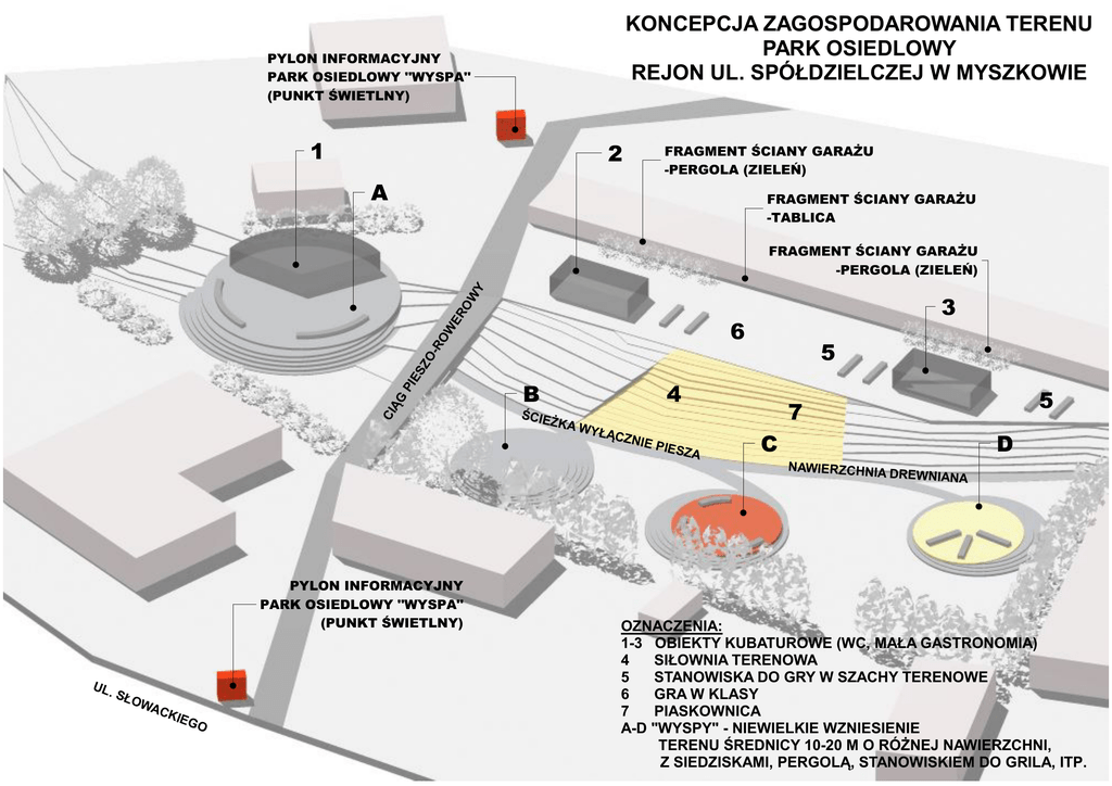 KONCEPCJA ZAGOSPODAROWANIA TERENU PARK OSIEDLOWY REJON UL. SPÓŁDZIELCZEJ W MYSZKOWIE PYLON INFORMACYJNY PARK OSIEDLOWY "WYSPA" (PUNKT ŚWIETLNY) 1 2 FRAGMENT ŚCIANY GARAŻU -PERGOLA (ZIELEŃ) A FRAGMENT ŚCIANY GARAŻU -TABLICA -R OW ER OW Y FRAGMENT ŚCIANY GARAŻU -PERGOLA (ZIELEŃ) 3 6 CI ĄG PI ES ZO 5 4 B ŚCIE ŻKA WYŁĄ CZ NIE P IESZ A 5 7 C D NAWIERZCHNIA DREWNIANA PYLON INFORMACYJNY PARK OSIEDLOWY "WYSPA" (PUNKT ŚWIETLNY) UL. SŁ OW AC KIE G O OZNACZENIA: 1-3 OBIEKTY KUBATUROWE (WC, MAŁA GASTRONOMIA) 4 SIŁOWNIA TERENOWA 5 STANOWISKA DO GRY W SZACHY TERENOWE 6 GRA W KLASY 7 PIASKOWNICA A-D "WYSPY" - NIEWIELKIE WZNIESIENIE TERENU ŚREDNICY 10-20 M O RÓŻNEJ NAWIERZCHNI, Z SIEDZISKAMI, PERGOLĄ, STANOWISKIEM DO GRILA, ITP.