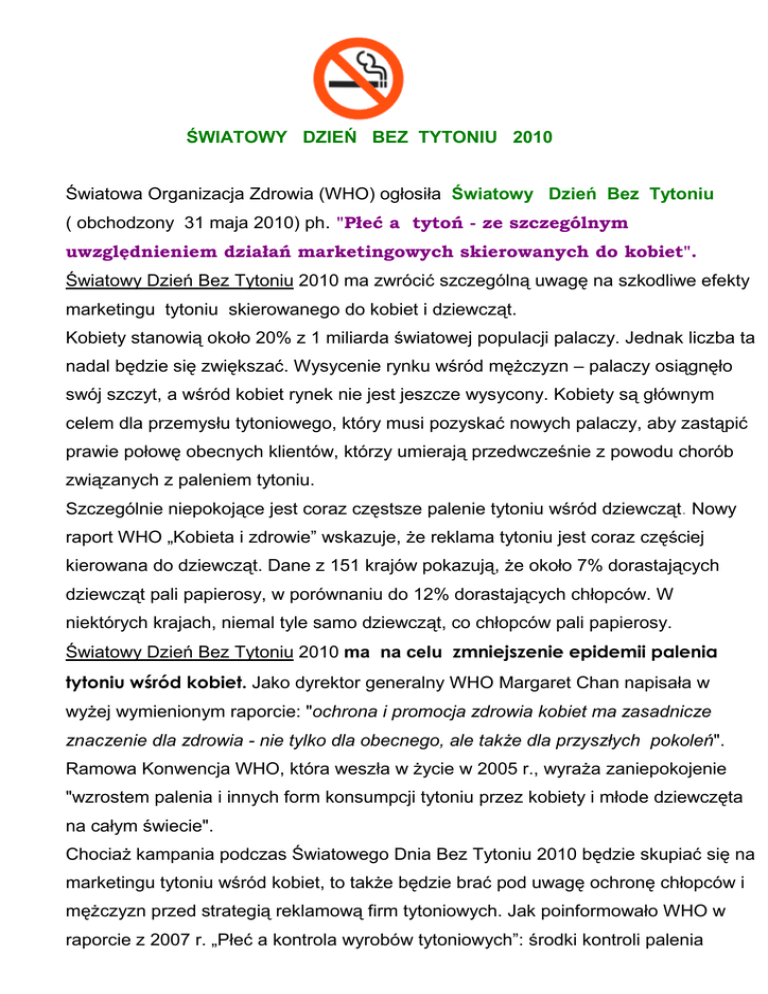 ŚWIATOWY DZIEŃ BEZ TYTONIU 2010 Światowa Organizacja Zdrowia (WHO) ogłosiła Światowy Dzień Bez Tytoniu ( obchodzony 31 maja 2010) ph. "Płeć a tytoń - ze szczególnym uwzględnieniem działań marketingowych skierowanych do kobiet". Światowy Dzień Bez Tytoniu 2010 ma zwrócić szczególną uwagę na szkodliwe efekty marketingu tytoniu skierowanego do kobiet i dziewcząt. Kobiety stanowią około 20% z 1 miliarda światowej populacji palaczy. Jednak liczba ta nadal będzie się zwiększać. Wysycenie rynku wśród męŜczyzn – palaczy osiągnęło swój szczyt, a wśród kobiet rynek nie jest jeszcze wysycony. Kobiety są głównym celem dla przemysłu tytoniowego, który musi pozyskać nowych palaczy, aby zastąpić prawie połowę obecnych klientów, którzy umierają przedwcześnie z powodu chorób związanych z paleniem tytoniu. Szczególnie niepokojące jest coraz częstsze palenie tytoniu wśród dziewcząt. Nowy raport WHO „Kobieta i zdrowie” wskazuje, Ŝe reklama tytoniu jest coraz częściej kierowana do dziewcząt. Dane z 151 krajów pokazują, Ŝe około 7% dorastających dziewcząt pali papierosy, w porównaniu do 12% dorastających chłopców. W niektórych krajach, niemal tyle samo dziewcząt, co chłopców pali papierosy. Światowy Dzień Bez Tytoniu 2010 ma na celu zmniejszenie epidemii palenia tytoniu wśród kobiet. Jako dyrektor generalny WHO Margaret Chan napisała w wyŜej wymienionym raporcie: "ochrona i promocja zdrowia kobiet ma zasadnicze znaczenie dla zdrowia - nie tylko dla obecnego, ale takŜe dla przyszłych pokoleń". Ramowa Konwencja WHO, która weszła w Ŝycie w 2005 r., wyraŜa zaniepokojenie "wzrostem palenia i innych form konsumpcji tytoniu przez kobiety i młode dziewczęta na całym świecie". ChociaŜ kampania podczas Światowego Dnia Bez Tytoniu 2010 będzie skupiać się na marketingu tytoniu wśród kobiet, to takŜe będzie brać pod uwagę ochronę chłopców i męŜczyzn przed strategią reklamową firm tytoniowych. Jak poinformowało WHO w raporcie z 2007 r. „Płeć a kontrola wyrobów tytoniowych”: środki kontroli palenia tytoniu nie mogą być tak samo skuteczne w odniesieniu do obu płci ... Istotne jest zatem, aby w polityce kontroli palenia tytoniu brać pod uwagę róŜnice płci.” W innym raporcie z 2007 r. WHO komentuje: "Zarówno kobiety jak i męŜczyźni potrzebują pełnej informacji o róŜnych skutkach uŜywania tytoniu dla kaŜdej płci..., jednakowej ochrony przed reklamą i marketingiem prowadzonym przez ponadnarodowe koncerny tytoniowe ..., a takŜe ochrony przed biernym paleniem i naraŜeniem zawodowym na tytoń lub nikotynę ". Ramowa Konwencja WHO uznaje „potrzebę opracowania odpowiedniej polityki dotyczącej kontroli ograniczania palenia tytoniu ze względu na płeć ", jak równieŜ "pełnego uczestnictwa kobiet we wszystkich poziomach polityki antynikotynowej i udziału w kontroli palenia tytoniu". WHO podczas Światowego Dnia Bez Tytoniu 2010 r. i przez cały następny rok, zachęca rządy do zwrócenia szczególnej uwagi na ochronę kobiet przed próbami firm tytoniowych, które chcą uzaleŜnić je od nikotyny. Odpowiadając na wezwanie WHO, rządy mogą obniŜyć liczbę ofiar śmiertelnych i ataków serca, udarów mózgu, nowotworów, chorób układu oddechowego, które stają się coraz bardziej rozpowszechnione wśród kobiet. Palenie tytoniu moŜe zabić miliard osób w tym stuleciu. Ograniczając palenie tytoniu wśród kobiet moŜna zapobiec zgonom z powodu chorób odtytoniowych. Skorzystaj z Telefonicznej Poradni Pomocy Palącym 0 810 108 108.