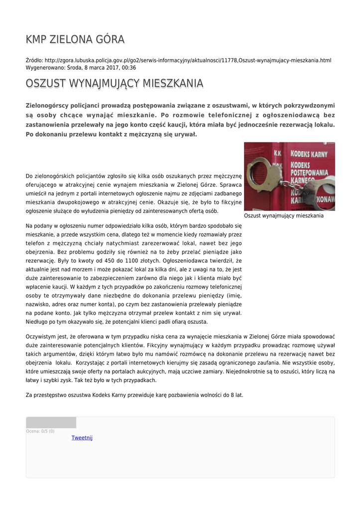 KMP ZIELONA GÓRA Źródło: http://zgora.lubuska.policja.gov.pl/go2/serwis-informacyjny/aktualnosci/11778,Oszust-wynajmujacy-mieszkania.html Wygenerowano: Środa, 8 marca 2017, 00:36 OSZUST WYNAJMUJĄCY MIESZKANIA Zielonogórscy policjanci prowadzą postępowania związane z oszustwami, w których pokrzywdzonymi są osoby chcące wynająć mieszkanie. Po rozmowie telefonicznej z ogłoszeniodawcą bez zastanowienia przelewały na jego konto część kaucji, która miała być jednocześnie rezerwacją lokalu. Po dokonaniu przelewu kontakt z mężczyzną się urywał. Do zielonogórskich policjantów zgłosiło się kilka osób oszukanych przez mężczyznę oferującego w atrakcyjnej cenie wynajem mieszkania w Zielonej Górze. Sprawca umieścił na jednym z portali internetowych ogłoszenie najmu ze zdjęciami zadbanego mieszkania dwupokojowego w atrakcyjnej cenie. Okazuje się, że było to fikcyjne ogłoszenie służące do wyłudzenia pieniędzy od zainteresowanych ofertą osób. Oszust wynajmujący mieszkania Na podany w ogłoszeniu numer odpowiedziało kilka osób, którym bardzo spodobało się mieszkanie, a przede wszystkim cena, dlatego też w momencie kiedy rozmawiały przez telefon z mężczyzną chciały natychmiast zarezerwować lokal, nawet bez jego obejrzenia. Bez problemu godziły się również na to żeby przelać pieniądze jako rezerwację. Były to kwoty od 450 do 1100 złotych. Ogłoszeniodawca twierdził, że aktualnie jest nad morzem i może pokazać lokal za kilka dni, ale z uwagi na to, że jest duże zainteresowanie to zabezpieczeniem zarówno dla niego jak i klienta miało być wpłacenie kaucji. W każdym z tych przypadków po zakończeniu rozmowy telefonicznej osoby te otrzymywały dane niezbędne do dokonania przelewu pieniędzy (imię, nazwisko, adres oraz numer konta), po czym bez zastanowienia przelewały pieniądze na podane konto. Jak tylko mężczyzna otrzymał przelew kontakt z nim się urywał. Niedługo po tym okazywało się, że potencjalni klienci padli ofiarą oszusta. Oczywistym jest, że oferowana w tym przypadku niska cena za wynajęcie mieszkania w Zielonej Górze miała spowodować duże zainteresowanie potencjalnych klientów. Fikcyjny wynajmujący w każdym przypadku prowadząc rozmowę używał takich argumentów, dzięki którym łatwo było mu namówić rozmówcę na dokonanie przelewu na rezerwację nawet bez obejrzenia lokalu. Korzystając z portali internetowych kierujmy się zasadą ograniczonego zaufania. Nie wszystkie osoby, które umieszczają swoje oferty na portalach aukcyjnych, mają uczciwe zamiary. Niejednokrotnie są to oszuści, który liczą na łatwy i szybki zysk. Tak też było w tych przypadkach. Za przestępstwo oszustwa Kodeks Karny przewiduje karę pozbawienia wolności do 8 lat. Ocena: 0/5 (0) Tweetnij