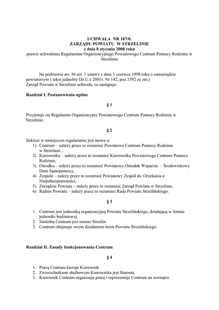 UCHWAŁA NR 107/0. ZARZĄDU POWIATU W STRZELINIE z dnia 8 stycznia 2008 roku prawie uchwalenia Regulaminu Organizacyjnego Powiatowego Centrum Pomocy Rodzinie w Strzelinie Na podstawie art. 36 ust. 1 ustawy z dnia 5 czerwca 1998 roku o samorządzie powiatowym ( tekst jednolity Dz.U.z 2001r. Nr 142, poz.1592 ze zm.) Zarząd Powiatu w Strzelinie uchwala, co następuje: Rozdział I. Postanowienia ogólne §1 Przyjmuje się Regulamin Organizacyjny Powiatowego Centrum Pomocy Rodzinie w Strzelinie. §2 Ilektroć w niniejszym regulaminie jest mowa o: 1) Centrum – należy przez to rozumieć Powiatowe Centrum Pomocy Rodzinie w Strzelinie , 2) Kierowniku – należy przez to rozumieć Kierownika Powiatowego Centrum Pomocy Rodzinie, 3) Ośrodku – należy przez to rozumieć Powiatowy Ośrodek Wsparcia – Środowiskowy Dom Samopomocy, 4) Zespole – należy przez to rozumieć Powiatowy Zespół ds. Orzekania o Niepełnosprawności, 5) Zarządzie Powiatu – należy przez to rozumieć Zarząd Powiatu w Strzelinie, 6) Radzie Powiatu – należy przez to rozumieć Rada Powiatu Strzelińskiego. §3 1. Centrum jest jednostką organizacyjną Powiatu Strzelińskiego, działającą w formie jednostki budżetowej. 2. Siedzibą Centrum jest miasto Strzelin 3. Centrum obejmuje swym działaniem teren Powiatu Strzelińskiego. Rozdział II. Zasady funkcjonowania Centrum §4 1. Pracą Centrum kieruje Kierownik. 2. Zwierzchnikiem służbowym Kierownika jest Starosta. 3. Kierownik Centrum organizuje pracę i reprezentuje Centrum na zewnątrz. §5 1. Zadania Centrum realizują pracownicy Centrum, stosownie do wewnętrznego podziału pracy. 2. Stanowiska pracy w Centrum pozostają pod bezpośrednim nadzorem Kierownika . 3. Wyszczególnienie zadań i obowiązków, uprawnień i odpowiedzialności pracowników, Kierownik określa w zakresach czynności pracowników. §6 Formy załatwiania spraw w Centrum, wzory pieczęci i zasady posługiwania się nimi, tryb wykonywania czynności kancelaryjnych oraz zasady archiwizowania akt określa instrukcja kancelaryjna. Rozdział III. Struktura organizacyjna Centrum. §7 1. W skład Centrum wchodzą: 1) Kierownik, 2) Dział finansowo-księgowy: a) główny księgowy, b) pracownik ds. kadr i płac 3) Zespół ds. rodzin zastępczych i kierowania do placówek opiekuńczowychowawczych: - pracownicy socjalni 4) Zespół ds. osób niepełnosprawnych: a) - samodzielni referenci 5) Zespół ds. orzekania o niepełnosprawności: a) pracownik ds. obsługi, b) sekretarz. 6) Powiatowy Ośrodek Wsparcia – Środowiskowy Dom Samopomocy: a) kierownik, b) terapeuci, c) pracownik socjalny, psycholog, psychiatra d) pracownik administracyjno-biurowy, e) robotnik gospodarczy, 7) Radca Prawny, 8) Psycholog. 2. W uzasadnionych przypadkach stanowiska pracy wymienione w ust. 1 można łączyć. 3. Centrum może zawierać umowy cywilno-prawne ze specjalistami ( np. lekarzami, psychologami, prawnikami) w ramach wynikających potrzeb i możliwości finansowych Centrum. 4. Strukturę Organizacyjną Centrum zawiera załącznik Nr 1 do niniejszego Regulaminu. Rozdział IV. Szczegółowy zakres zadań i kompentencji. §8 Dział. 1. Kierownik 1. Do zadań Kierownika należy: 1) kierowanie działalnością Centrum w sposób zapewniający prawidłowe funkcjonowanie, 2) reprezentowanie Centrum na zewnątrz, 3) sprawowanie zwierzchnictwa służbowego w rozumieniu przepisów kodeksu pracy w stosunku do pracowników Centrum, 4) nadzór nad przestrzeganiem szczegółowych przepisów z zakresu. bhp, p.poż., wynagradzania i innych, 5) realizacja innych zadań w ramach upoważnień i pełnomocnictw udzielonych przez Zarząd Powiatu, 6) współpraca z organami administracji rządowej, samorządu terytorialnego oraz organizacjami pozarządowymi, 7) zapewnienie szkolenia i doskonalenia zawodowego kadr pomocy społecznej z obszaru Powiatu Strzelińskiego, 8) składanie Radzie Powiatu corocznego sprawozdania z działalności Centrum, 9) przedstawianie Radzie Powiatu wykazu potrzeb z zakresu pomocy społecznej. 2. W okresie nieobecności Kierownika w pracy spowodowanej chorobą, urlopem lub wyjazdem służbowym jego obowiązki pełni osoba, upoważniona przez Zarząd Powiatu. §9 Do składania oświadczeń woli w imieniu Centrum, w zakresie jego praw i obowiązków majątkowych upoważnione są łącznie: Kierownik i Główny Księgowy. § 10 Dział. 2. Dział finanoswo-księgowy. Do zadań Głównego Księgowego należą : 1) obsługa finansowo-księgowa Centrum i podległych jednostek organizacyjnych tj.Rodzinnego Domu Dziecka Nr 1 w Strzelinie,Zespołu ds. Orzekania o Niepełnosprawności, Powiatowy Osrodek Wsparcia. 2) koordynacja prac w zakresie opracowywania projektu budżetu jednostek, 3) gospodarowanie rzeczowymi składnikami majątkowymi jednostek, 4) prowadzenie rachunkowości jednostek zgodnie z obowiązującymi przepisami, 5) organizacyjne przygotowanie wypłat świadczeń Centrum i podległych jednostek, 6) prowadzenie statystyki finansów Centrum i podległych jednostek, 7) sporządzanie sprawozadań, informacji i analiz z zakresu budżetu Centrum i podległych jednostek, 8) opracowywanie projektów planów dochodów i wydatków Centrum i podległych jednostek. § 11 Do zadań pracownika ds. kadr i płac należą: 1) prowadzenie dokumentacji pracowniczej zgodnie z obowiazującymi przepisami, 2) przygotowanie umów o pracę i innych dokumentów związanych z zatrudnianiem i zwalnianiem pracowników, 3) sporządzanie zakresów czynności dla pracowników Centrum i podległych jednostek, 4) czuwanie nad wykorzystaniem urlopów wypoczynkowych i nad czasem pracy, 5) sporzadzanie deklaracji rozliczeniowych dla potrzeb ZUS i Urzędu Skarbowego zgodnie z obowiązującymi przepisami, 6) sporządzanie list płac pracowników, 7) archiwizowanie dokumentów Centrum. § 12 Dział. 3. Zespół do spraw rodzin zastępczych i kierowania do placówek opiekuńczowychowaczych. Do zadań zespołu ds. rodzin zastępczych i kiero