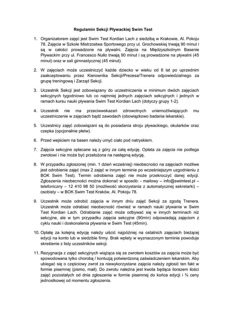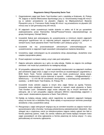 Regulamin Sekcji Pływackiej Swim Test 1. Organizatorem zajęć jest Swim Test Kordian Lach z siedzibą w Krakowie, Al. Pokoju 78. Zajęcia w Szkole Mistrzostwa Sportowego przy ul. Grochowskiej trwają 90 minut i są w całości prowadzone na pływalni. Zajęcia na Międzyszkolnym Basenie Pływackim przy ul. Francesco Nullo trwają 90 minut i są prowadzone na pływalni (45 minut) oraz w sali gimnastycznej (45 minut). 2. W zajęciach może uczestniczyć każde dziecko w wieku od 6 lat po uprzednim zaakceptowaniu przez Kierownika Sekcji/Prezesa/Trenera odpowiedzialnego za grupę treningową i Zarząd Sekcji. 3. Uczestnik Sekcji jest zobowiązany do uczestniczenia w minimum dwóch zajęciach sekcyjnych tygodniowo lub co najmniej jednych zajęciach sekcyjnych i jednych w ramach kursu nauki pływania Swim Test Kordian Lach (dotyczy grupy 1-2). 4. Uczestnik nie ma przeciwwskazań zdrowotnych uniemożliwiających uczestniczenie w zajęciach bądź zawodach (obowiązkowo badania lekarskie). mu 5. Uczestnicy zajęć zobowiązani są do posiadania stroju pływackiego, okularków oraz czepka (opcjonalnie płetw). 6. Przed wejściem na basen należy umyć ciało pod natryskiem. 7. Zajęcia sekcyjne opłacane są z góry za całą edycję. Opłata za zajęcia nie podlega zwrotowi i nie może być przełożona na następną edycję. 8. W przypadku zgłoszonej (min. 1 dzień wcześniej) nieobecności na zajęciach możliwe jest odrobienie zajęć (max 2 zajęć w innym terminie po wcześniejszym uzgodnieniu z BOK Swim Test). Termin odrobienia zajęć nie może przekroczyć danej edycji. Zgłoszenia nieobecności można dokonać w sposób: - mailowy – [email protected] – telefoniczny – 12 410 98 50 (możliwość skorzystania z automatycznej sekretarki) – osobisty – w BOK Swim Test Kraków, Al. Pokoju 78. 9. Uczestnik może odrobić zajęcia w innym dniu zajęć Sekcji za zgodą Trenera. Uczestnik może odrabiać nieobecność również w ramach nauki pływania w Swim Test Kordian Lach. Odrabianie zajęć może odbywać się w innych terminach niż sekcyjne, ale w tym przypadku zajęcia sekcyjne (90min) odpowiadają zajęciom z cyklu nauki i doskonalenia pływania w Swim Test (45min). 10. Opłatę za kolejną edycję należy uiścić najpóźniej na ostatnich zajęciach bieżącej edycji na konto lub w siedzibie firmy. Brak wpłaty w wyznaczonym terminie powoduje skreślenie z listy uczestników sekcji. 11. Rezygnacja z zajęć sekcyjnych wiążąca się ze zwrotem kosztów za zajęcia może być spowodowana tylko chorobą / kontuzją potwierdzoną zaświadczeniem lekarskim. Aby ubiegać się o częściowy zwrot za niewykorzystane zajęcia należy zgłosić ten fakt w formie pisemnej (pismo, mail). Do zwrotu należna jest kwota będąca ilorazem ilości zajęć pozostałych od dnia zgłoszenia w formie pisemnej do końca edycji i ¾ ceny jednostkowej od momentu zgłoszenia. 12. Zastrzega się możliwość zaproponowania innego terminu / zmiany terminu zajęć w sytuacji, gdy grupa liczy mniej niż 5 osób. 13. W sytuacji gdy część zajęć nie odbędzie się w wyniku zmian w harmonogramie pływalni lub przyczyn niezależnych od organizatora, istnieje możliwość przepisania pełnych kosztów za niewykorzystane godziny na kolejną edycje lub ich zwrot . 14. Uczestnik sekcji, bądź jego Opiekunowie wyrażają zgodę na rejestrację oraz bezpłatną publikację zdjęć z wizerunkiem wykonanych podczas zajęć (w materiałach cyfrowych, drukowanych, publikacjach prasowych, internecie, telewizji oraz w kanałach wideo publikowanych w internecie) jednak tylko i wyłącznie na własny użytek Swim Test, bądź też na potrzeby promocji lub reklamy Swim Test. 15. Uczestnik sekcji, bądź jego Opiekunowie wyrażają zgodę na przetwarzanie danych osobowych przez firmę Swim Test ( w zw. z art. 23 ust 1 i 2 z dn. 29.08.97. o ochronie danych osób. ) w celach: - związanych z działalnością firmy - promocji działalności prowadzonej przez firmę 16. Uczestnik kursu, bądź jego Opiekunowie wyrażają zgodę na otrzymywanie publikacji i informacji za pomocą środków komunikacji elektronicznej od Swim Test oraz Swim Test Tour w rozumieniu Ustawy z dn. 18 lipca 2002 r. o świadczeniu usług drogą elektroniczną (Dz. U. Nr 144, poz. 1204) przesyłanych na adres e-mail i/ lub numer telefonu przekazane Swim Test.