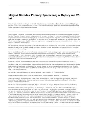 MOPS Dębica Miejski Ośrodek Pomocy Społecznej w Dębicy ma 25 lat Mszą świętą w kościele pw. Krzyża Św. i Matki Bożej Bolesnej, uroczystością w Domu Kultury „Kosmos” Miejskiego Ośrodka Kultury oraz spotkaniem towarzyskim uczcili 25-lecie działalności Miejskiego Ośrodka Pomocy Społecznej w Dębicy jego pracownicy oraz zaproszeni goście. W kościele pw. Krzyża Św. i Matki Bożej Bolesnej mszę w intencji wszystkich pracowników MOPS odprawił proboszcz ks. Józef Wątroba. W swoim kazaniu prócz uznania dla ich pracy przekazał im życzenia wytrwałości. Powiedział między innymi, że choć wielu podopiecznych przyjmuje ich pomoc z wdzięcznością, to jednak zawsze znajdą się tacy, którzy będą ją krytykować: „Powiedzcie sobie wtedy, że takie jest życie i nie ustawajcie w dążeniach do poprawiania ich losu. Wasza praca jest potrzebna i będzie potrzebna, gdyż zawsze znajdą się ludzie ubodzy, niezaradni, chorzy i starzy. I za tę pracę serdecznie Wam dziękuję”. W Domu Kultury „Kosmos” Miejskiego Ośrodka Kultury odbyła się część oficjalna uroczystości związanych z 25-leciem działalności Miejskiego Ośrodka Pomocy Społecznej. Spotkanie zostało powiązane z przypadającym na 21 listopada dniem pracownika socjalnego. Na uroczystość przybyli m.in. parlamentarzyści, przedstawiciele władz samorządowych województwa podkarpackiego, powiatu dębickiego, miasta Dębicy, przedstawiciele jednostek organizacyjnych miasta, spółek miejskich, firm współpracujących z MOPS, dyrektorzy szkół, przedszkoli oraz przedstawiciele organizacji pozarządowych, seniorzy, dzieci ze świetlic środowiskowych. Byli także główni bohaterowie tego spotkania: pracownicy MOPS w Dębicy: obecni i ci, którzy już odeszli na zasłużoną emeryturę. Małgorzata Kędzior, dyrektor MOPS po powitaniu wszystkich gości przedstawiła początki działalności instytucji. W sierpniu 1990 roku Rada Miejska w Dębicy powołała Miejski Ośrodek Pomocy Społecznej jako jednostkę budżetową podporządkowaną wówczas Zarządowi Miasta Dębicy. Powstał on na bazie Działu Służb Społecznych przy Zespole Opieki Zdrowotnej w Dębicy (Dział Służb Społecznych obejmował swoim zasięgiem obecny teren powiatu dębickiego wraz z Radomyślem Wielkim). Burmistrzem Miasta w I kadencji był Daniel Dąbrowski a jego zastępcą śp. Tadeusz Gardziel. Pierwszym Kierownikiem został Pan Franciszek Chlebuś, który pracował z zespołem 12 osobowym. Wspólnie z Panem Chlebusiem pomoc społeczną w Dębicy tworzyli: Emilia Sikora, Małgorzata Kędzior, Stanisława Drobot, Renata Plizga, Halina Cholewa, Ewa Socha, Lucyna Kubek, Jadwiga Karaś, Lucyna Świętoń, Halina Biel, Barbara Skarbek, Krystyna Bokota. Pracownicy ci zostali przeniesieni z Zespołu Opieki Zdrowotnej do pracy w Miejskim Ośrodku Pomocy Społecznej. Początkowo nie mieliśmy własnego lokalu. Pracowaliśmy w 4 miejscach: w baraku obok kościoła Klasztoru przy ul. Krakowskiej 15 (baraku dzisiaj już nie ma został zburzony) oraz w 3 przychodniach zdrowia). Obsługę finansową Ośrodka na początku lat 90 tych prowadził Wydział Finansowy Urzędu Miejskiego. Dzięki uprzejmości ówczesnej dyrekcji ZOZ, a później burmistrzów Miasta, nasi pracownicy socjalni początkowo w teren jeździli karetkami pogotowia a później samochodem służbowym należącym do Urzędu Miasta w Dębicy. Do 1990r. zadania z zakresu ówczesnej opieki społecznej realizowane były w oparciu o wytyczne i instrukcje Ministerstwa Zdrowia i Opieki Społecznej. Opiekowano się przede wszystkim osobami starszymi, rodzinami wielodzietnymi, osobami chorymi na gruźlicę, niewidomymi, kombatantami. (nie było osób bezrobotnych). Pierwsze ustawy w zakresie polityki społecznej w latach 1989-1991 były bardzo korzystne dla bezrobotnych (ze względu na wysokie zasiłki i długi okres ich przyznawania). W tym okresie pomoc materialna dla podopiecznych MOPS była realizowana zgodnie z ustawą z dnia 29 listopada 1990 r. 1 MOPS Dębica poprzez wypłatę zasiłków stałych, okresowych, celowych, przyznawaliśmy i wypłacaliśmy również dodatki mieszkaniowe. Największą grupę klientów wówczas stanowili pracownicy zwalniani z Kombinatu Rolno Przemysłowego Igloopol”. Katalog zadań jakie wykonuje obecnie MOPS na rzecz mieszkańców naszego miasta, a także i powiatu jest bardzo duży. Z różnych form wsparcia w naszym ośrodku korzysta w 13 % mieszkańców naszego miasta (dodam to nie są tylko osoby korzystające z pomocy społecznej) – kontynuowała Małgorzata Kędzior. Wykorzystaliśmy bardzo dobrze okres projektowania w latach 2007- 2013. Ze środków z EFS realizowaliśmy projekt „Czas na aktywność w mieście Dębica”. Realizacja tego projektu zakończyła się we wrześniu br. Utworzyliśmy 3 świetlice środowiskowe” dla dzieci i młodzieży w tym 2 w ramach projektu „Nie ulicy tak świetlicy”. Poza tym realizowaliśmy wiele projektów na które pozyskiwaliśmy środki z MPIPS, z Podkarpackiego Urzędu Wojewódzkiego oraz ROPS z tych ostatnich 2 instytucji pozyskiwaliśmy środki w partnerstwie ze Stowarzyszeniem Ad Astram. Pracownicy MOPS bardzo aktywnie uczestniczą w wielu akcjach charytatywnych miedzy innymi w „Szlachetnej Paczce”, „Drużynie Dębickich Serc”, w akcji „Pomóż dzieciom przetrwać zimę”. Od kilku lat uczestniczymy w zbiórkach prowadzonych podczas Charytatywnego Turniej Piłki Nożnej organizowanego w styczniu przez firmę Catering Staff. Corocznie organizujemy wigilie dla ubogich i samotnych mieszkańców naszego miasta oraz spotkanie z mikołajem dla dzieci klientów MOPS. Jesteśmy tez organizatorami wielu pikników integrujących społeczność lokalną”. Na obecny standard pracy Miejskiego Ośrodka Pomocy Społecznej na rzecz mieszkańców naszego miasta pracowało wiele osób. Kluczowe decyzje podejmowali Burmistrzowie sprawujący swoje funkcje w latach 1990 - 2015, Ra