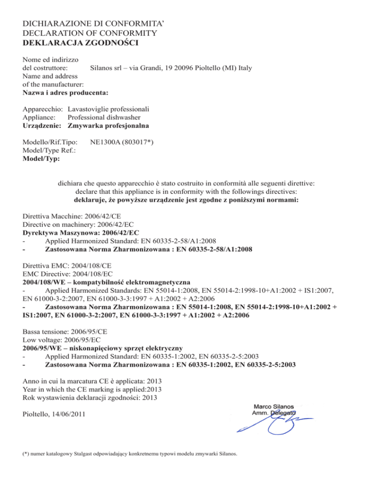 DICHIARAZIONE DI CONFORMITA’ DECLARATION OF CONFORMITY DEKLARACJA ZGODNOŚCI Nome ed indirizzo del costruttore: Silanos srl – via Grandi, 19 20096 Pioltello (MI) Italy Name and address of the manufacturer: Nazwa i adres producenta: Apparecchio: Lavastoviglie professionali Appliance: Professional dishwasher Urządzenie: Zmywarka profesjonalna Modello/Rif.Tipo: Model/Type Ref.: Model/Typ: NE1300A (803017*) dichiara che questo apparecchio è stato costruito in conformità alle seguenti direttive: declare that this appliance is in conformity with the followings directives: deklaruje, że powyższe urządzenie jest zgodne z poniższymi normami: Direttiva Macchine: 2006/42/CE Directive on machinery: 2006/42/EC Dyrektywa Maszynowa: 2006/42/EC - Applied Harmonized Standard: EN 60335-2-58/A1:2008 - Zastosowana Norma Zharmonizowana : EN 60335-2-58/A1:2008 Direttiva EMC: 2004/108/CE EMC Directive: 2004/108/EC 2004/108/WE – kompatybilność elektromagnetyczna - Applied Harmonized Standards: EN 55014-1:2008, EN 55014-2:1998-10+A1:2002 + IS1:2007, EN 61000-3-2:2007, EN 61000-3-3:1997 + A1:2002 + A2:2006 - Zastosowana Norma Zharmonizowana : EN 55014-1:2008, EN 55014-2:1998-10+A1:2002 + IS1:2007, EN 61000-3-2:2007, EN 61000-3-3:1997 + A1:2002 + A2:2006 Bassa tensione: 2006/95/CE Low voltage: 2006/95/EC 2006/95/WE – niskonapięciowy sprzęt elektryczny - Applied Harmonized Standard: EN 60335-1:2002, EN 60335-2-5:2003 - Zastosowana Norma Zharmonizowana : EN 60335-1:2002, EN 60335-2-5:2003 Anno in cui la marcatura CE è applicata: 2013 Year in which the CE marking is applied:2013 Rok wystawienia deklaracji zgodności: 2013 Pioltello, 14/06/2011 (*) numer katalogowy Stalgast odpowiadający konkretnemu typowi modelu zmywarki Silanos.