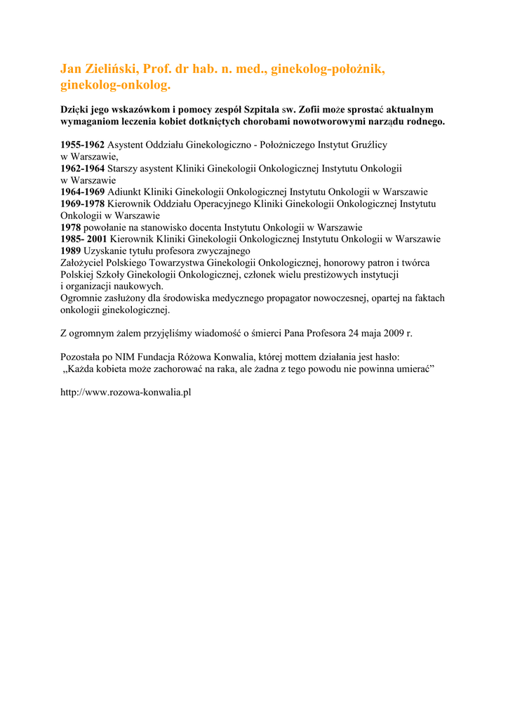 Jan Zieliński, Prof. dr hab. n. med., ginekolog-położnik, ginekolog-onkolog. Dzięki jego wskazówkom i pomocy zespół Szpitala sw. Zofii może sprostać aktualnym wymaganiom leczenia kobiet dotkniętych chorobami nowotworowymi narządu rodnego. 1955-1962 Asystent Oddziału Ginekologiczno - Położniczego Instytut Gruźlicy w Warszawie, 1962-1964 Starszy asystent Kliniki Ginekologii Onkologicznej Instytutu Onkologii w Warszawie 1964-1969 Adiunkt Kliniki Ginekologii Onkologicznej Instytutu Onkologii w Warszawie 1969-1978 Kierownik Oddziału Operacyjnego Kliniki Ginekologii Onkologicznej Instytutu Onkologii w Warszawie 1978 powołanie na stanowisko docenta Instytutu Onkologii w Warszawie 1985- 2001 Kierownik Kliniki Ginekologii Onkologicznej Instytutu Onkologii w Warszawie 1989 Uzyskanie tytułu profesora zwyczajnego Założyciel Polskiego Towarzystwa Ginekologii Onkologicznej, honorowy patron i twórca Polskiej Szkoły Ginekologii Onkologicznej, członek wielu prestiżowych instytucji i organizacji naukowych. Ogromnie zasłużony dla środowiska medycznego propagator nowoczesnej, opartej na faktach onkologii ginekologicznej. Z ogromnym żalem przyjęliśmy wiadomość o śmierci Pana Profesora 24 maja 2009 r. Pozostała po NIM Fundacja Różowa Konwalia, której mottem działania jest hasło: „Każda kobieta może zachorować na raka, ale żadna z tego powodu nie powinna umierać” http://www.rozowa-konwalia.pl