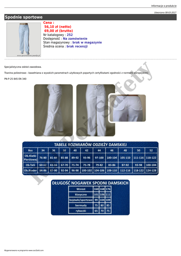 Informacje o produkcie Utworzono 08-03-2017 Spodnie sportowe Cena : 56,10 zł (netto) 69,00 zł (brutto) Nr katalogowy : 252 Dostępność : Na zamówienie Stan magazynowy : brak w magazynie Średnia ocena : brak recenzji fe ty Specjalistyczna odzież zawodowa. Tkanina poliestrowo - bawełniana o wysokich parametrach użytkowych popartych certyfikatami zgodności z normami europejskimi: R ol -P oż Sa PN-P-25 845 EN 340 Wygenerowano w programie www.oscGold.com fe ty Sa oż -P Dostępne opcje Spodnie sportowe » WZROST: 160, 168, 176. » ROZMIAR: 34, 36, 38, 40, 42, 44, 46, 48, 50, 52. » KOLOR: beżowy, biały, bordowy, brązowy, czarny, czerwony, fioletowy, jasnoniebieski, kawa z mlekiem, niebieski, pistacjowy, R ol pomarańczowy, szary, słoneczny, wrzosowy, zielony, łososiowy.