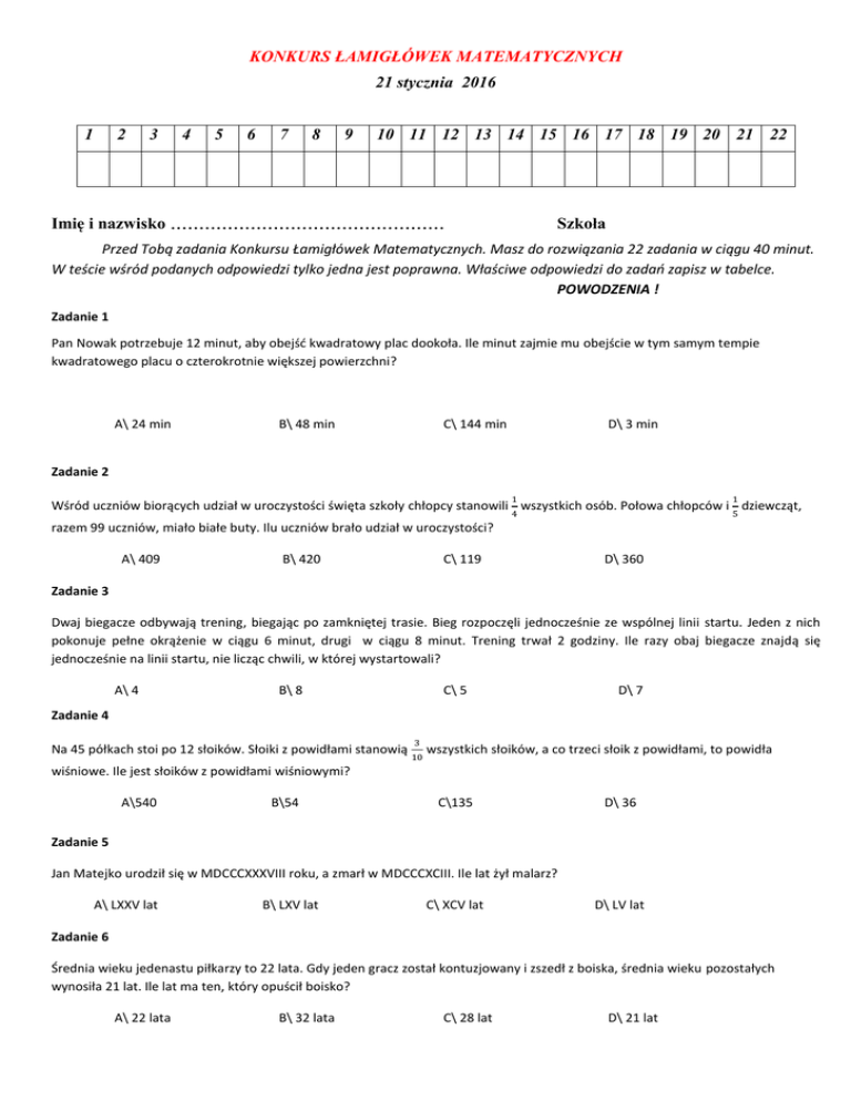 KONKURS ŁAMIGŁÓWEK MATEMATYCZNYCH 21 stycznia 2016 1 2 3 4 5 6 7 8 9 10 11 12 13 14 15 16 17 18 19 20 21 22 Imię i nazwisko Szkoła Przed Tobą zadania Konkursu Łamigłówek Matematycznych. Masz do rozwiązania 22 zadania w ciągu 40 minut. W teście wśród podanych odpowiedzi tylko jedna jest poprawna. Właściwe odpowiedzi do zadań zapisz w tabelce. POWODZENIA ! Zadanie 1 Pan Nowak potrzebuje 12 minut, aby obejść kwadratowy plac dookoła. Ile minut zajmie mu obejście w tym samym tempie kwadratowego placu o czterokrotnie większej powierzchni? A\ 24 min B\ 48 min C\ 144 min D\ 3 min Zadanie 2 1 1 4 5 Wśród uczniów biorących udział w uroczystości święta szkoły chłopcy stanowili wszystkich osób. Połowa chłopców i dziewcząt, razem 99 uczniów, miało białe buty. Ilu uczniów brało udział w uroczystości? A\ 409 B\ 420 C\ 119 D\ 360 Zadanie 3 Dwaj biegacze odbywają trening, biegając po zamkniętej trasie. Bieg rozpoczęli jednocześnie ze wspólnej linii startu. Jeden z nich pokonuje pełne okrążenie w ciągu 6 minut, drugi w ciągu 8 minut. Trening trwał 2 godziny. Ile razy obaj biegacze znajdą się jednocześnie na linii startu, nie licząc chwili, w której wystartowali? A\ 4 B\ 8 C\ 5 D\ 7 Zadanie 4 Na 45 półkach stoi po 12 słoików. Słoiki z powidłami stanowią 3 10 wszystkich słoików, a co trzeci słoik z powidłami, to powidła wiśniowe. Ile jest słoików z powidłami wiśniowymi? A\540 B\54 C\135 D\ 36 Zadanie 5 Jan Matejko urodził się w MDCCCXXXVIII roku, a zmarł w MDCCCXCIII. Ile lat żył malarz? A\ LXXV lat B\ LXV lat C\ XCV lat D\ LV lat Zadanie 6 Średnia wieku jedenastu piłkarzy to 22 lata. Gdy jeden gracz został kontuzjowany i zszedł z boiska, średnia wieku pozostałych wynosiła 21 lat. Ile lat ma ten, który opuścił boisko? A\ 22 lata B\ 32 lata C\ 28 lat D\ 21 lat Zadanie 7 Czterokilogramowy worek ziemniaków kosztuje 3,60 zł, zaś dwuipółkilogramowy worek kosztuje 3 zł. O ile droższy jest kilogram ziemniaków w mniejszym opakowaniu? A\ 45 gr Zadanie 8 B\ 60 gr C\ 30 gr D\ 90 gr C\ / D\ + Wybierz brakującą figurę w miejscu znaku zapytania. / ||| = A\ I || /// \\ // ? B\ II Zadanie 9 Pan Nowak ma działkę w kształcie prostokąta o powierzchni 180 arów. Jej szerokość wynosi 120 metrów. Aby ogrodzić te działkę, postanowił wbijać słupki w odległości 1 metra, tak aby na końcu każdego boku znajdował się słupek. Ile słupków musi kupić pan Nowak? A\ 540 B\ 542 C\ 538 D\ 544 Zadanie 10 Sznur korali składa się z osiemdziesięciu kulistych koralików. Pięćdziesiąt z nich ma promień 6 mm, a pozostałe mają trzy razy mniejszy promień. Jaka może być najmniejsza długość tego sznura korali? A\ 36 cm Zadanie 11 B\ 90 cm C\ 72 D\ 82 Łączna waga psa, kota i królika wynosi 35 kg. Kot wazy 4 razy mniej niż pies, a królik o 1 kilogram mniej od kota. Ile waży pies? A\ 16 kg B\ 22 kg C\ 24 kg D\ 20 kg Zadanie 12 Babcia Eurelia przyniosła na targ 100 jajek, które chciała sprzedać za 36 zł. Gdy sprzedała czwartą część wszystkich jajek, spostrzegła, że spośród pozostałych część jajek jest popękanych. Odłożyła je zatem na bok i aby zarobić zamierzone 36 zł, resztę jajek sprzedała za 45 groszy za sztukę. Oblicz, ile jajek było popękanych. A\ 9 B\ 27 C\15 D\ 25 danie 13 Dwaj bracia, Tomek i Bartek, chodzą razem na treningi karate. Tomek chodzi szybko, Bartek chodzi wolno. Tomek idzie na trening 20 minut, a Bartek 30 minut. Ile minut po Bartku powinien wyjść z domu Tomek, żeby dogonić Bartka w połowie drogi na trening? A\ 25 min B\ 15 min C\ 10 min D\ 5 min Zadanie 14 W kufrze jest 5 skrzyń, w każdej skrzyni są 3 pudełka, w każdym pudełku jest 10 złotych monet. Kufer, skrzynie i pudełka są pozamykane na klucz. Ile co najmniej zamków trzeba otworzyć, aby wybrać 50 monet? A\ 5 B\ 7 C\ 8 D\ 9 Zadanie 15 Gąsienica pełza po pniu drzewa. W nocy przesuwa się o 4 metry do góry, a w dzień opuszcza się o 2 metry w dół. Ósmej nocy gąsienica dostała się na wierzchołek drzewa. Jaka jest wysokość tego drzewa? A\ 16 m Zadanie 16 B\ 18 m C\ 32 m D\ 30 m Mariusz, Tomek, Bartek, Damian I Krzysiek utworzyli kolejkę do kasy w kinie. Mariusz stoi dalej od kasy niż Bartek. Tomek stoi bliżej niż Mariusz i bezpośrednio za Damianem. Damian stoi bliżej Bartka, ale nie stoi na początki kolejki. Na którym miejscu, licząc od kasy, stoi Krzysiek? A\ na 4 B\ na 1 C\ na 3 D\ na 2 Zadanie 17 Ile jest liczb między 4 a 49(łącznie z nimi dwiema), nie licząc dwucyfrowych liczb parzystych oraz tych zakończonych na 7? A\ 22 B\ 21 C\ 24 D\ 23 Zadanie 18 Ignacy wyrusza w drogę o długości 900 km i gdy przejeżdża połowę trasy, postanawia zawrócić. Gdy przejeżdża 150 km, postanawia jednak kontynuować wcześniej zaplanowaną podróż i dojechać do końca. Ile kilometrów przejechał w sumie? A\ 1350 km B\ 1200 km C\ 900 km D\ 1050 km Zadanie 19 Prostokąt o polu 100 cm2 podzielono na trzy prostokąty, z których jeden ma obwód 21 cm i długość 8cm, a drugi ma obwód 23 cm i szerokość 1,5 cm. Oblicz pole trzeciego prostokąta. A\ 15 cm2 B\ 65cm2 C\ 32cm2 D\ 40cm2 Zadanie 20 3 4 pojemności kartonika zajmuje sok. Można napełnić nim 1,5 szklanki. Ile szklanek można napełnić z 5 kartoników? A\ 9 B\ 12 C\ 6 D\ 10 Zadanie 21 Rzucamy 2 kostkami, czerwoną i niebieską. Ile jest wszystkich możliwości, w których suma wyrzuconych oczek jest liczbą pierwszą? A\ 36 B\ 12 C\ 15 D\ 216 Zadanie 22 Wewnętrzna przestrzeń lodówki, której wnętrze wygląda jak prostopadłościan o podstawie kwadratu, ma 120 cm wysokości i 50 cm głębokości. Jaka jest pojemność tej lodówki? A\ 0,3m3 B\ 0,03m3 C\ 3m3 D\ 30m3