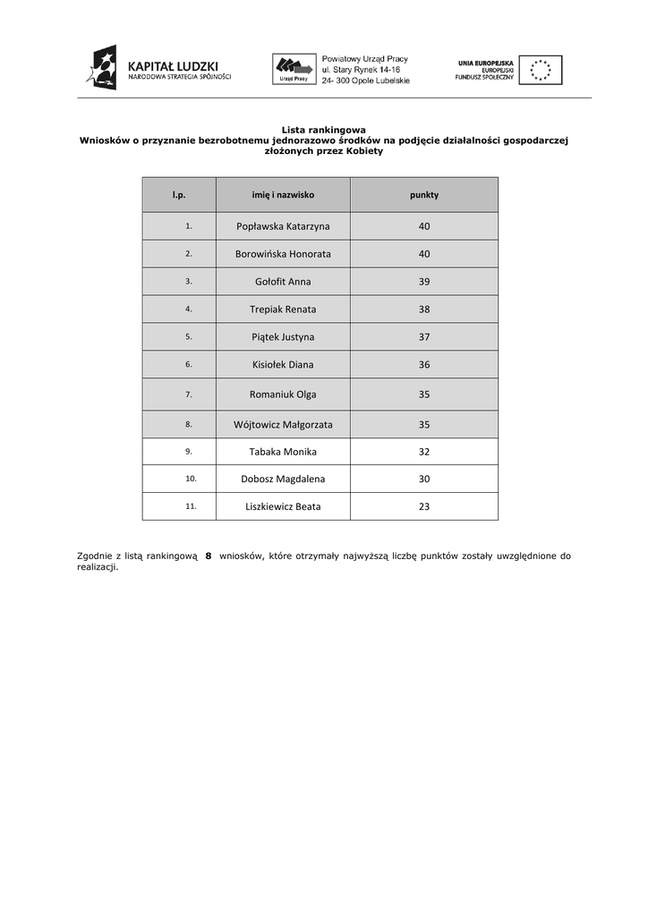 Lista rankingowa Wniosków o przyznanie bezrobotnemu jednorazowo środków na podjęcie działalności gospodarczej złożonych przez Kobiety l.p. imię i nazwisko punkty 1. Popławska Katarzyna 40 2. Borowińska Honorata 40 3. Gołofit Anna 39 4. Trepiak Renata 38 5. Piątek Justyna 37 6. Kisiołek Diana 36 7. Romaniuk Olga 35 8. Wójtowicz Małgorzata 35 9. Tabaka Monika 32 10. Dobosz Magdalena 30 11. Liszkiewicz Beata 23 Zgodnie z listą rankingową 8 wniosków, które otrzymały najwyższą liczbę punktów zostały uwzględnione do realizacji. Lista rankingowa Wniosków o przyznanie bezrobotnemu jednorazowo środków na podjęcie działalności gospodarczej L.p. Imię i Nazwisko Liczba otrzymanych punktów 1. Kamil Furtas 43 2. Anna Chyła 43 3. Michał Jackowski 42 4. Andrzej Wilk 41 5. Krzysztof Chmiel 41 6. Tomasz Czarnota 40 7. Sebastian Piątek 38 8. Urszula Drańska 37 9. Daniel Mokijewski 37 10. Robert Tokarski 37 11. Agnieszka Morka 37 12. Paulina Dubil 35 13. Damian Kwieciński 35 14. Andrzej Socha 33 15. Marcin Skwarczyński 33 16. Marcin Sowa 32 Zgodnie z listą rankingową 7 wniosków, które otrzymały najwyższą liczbę punktów zostały uwzględnione do realizacji. W sytuacji rezygnacji osoby której przyznano dofinansowanie, lub pozyskania dodatkowych środków finansowych przez Powiatowy Urząd Pracy w Opolu Lubelskiem kolejne osoby z listy rezerwowej otrzymają dofinansowanie. Lista rezerwowa Wniosków o przyznanie bezrobotnemu jednorazowo środków na podjęcie działalności gospodarczej 1. Urszula Drańska 37 2. Daniel Mokijewski 38 3. Robert Tokarski 37 4. Agnieszka Morka 37 5. Paulina Dubil 35 6. Damian Kwieciński 35 7. Andrzej Socha 33 8. Marcin Skwarczyński 33